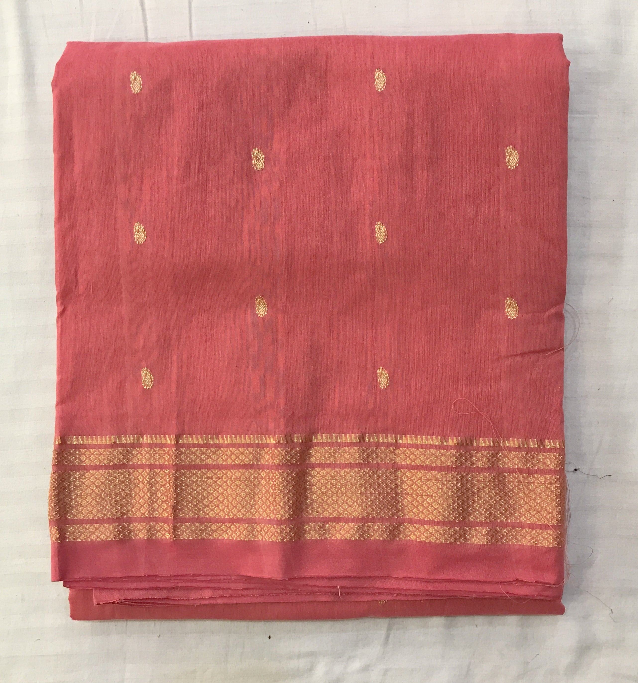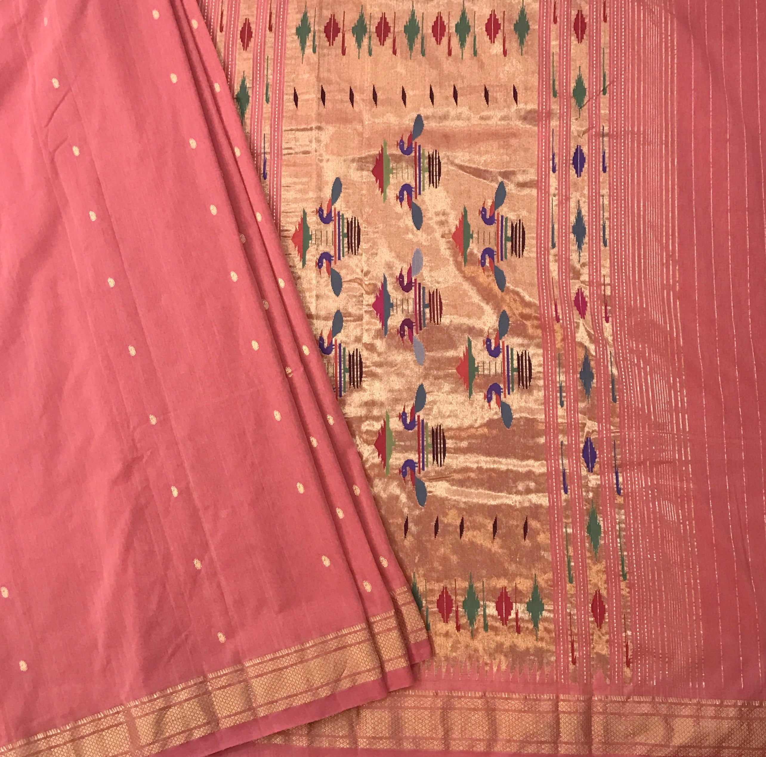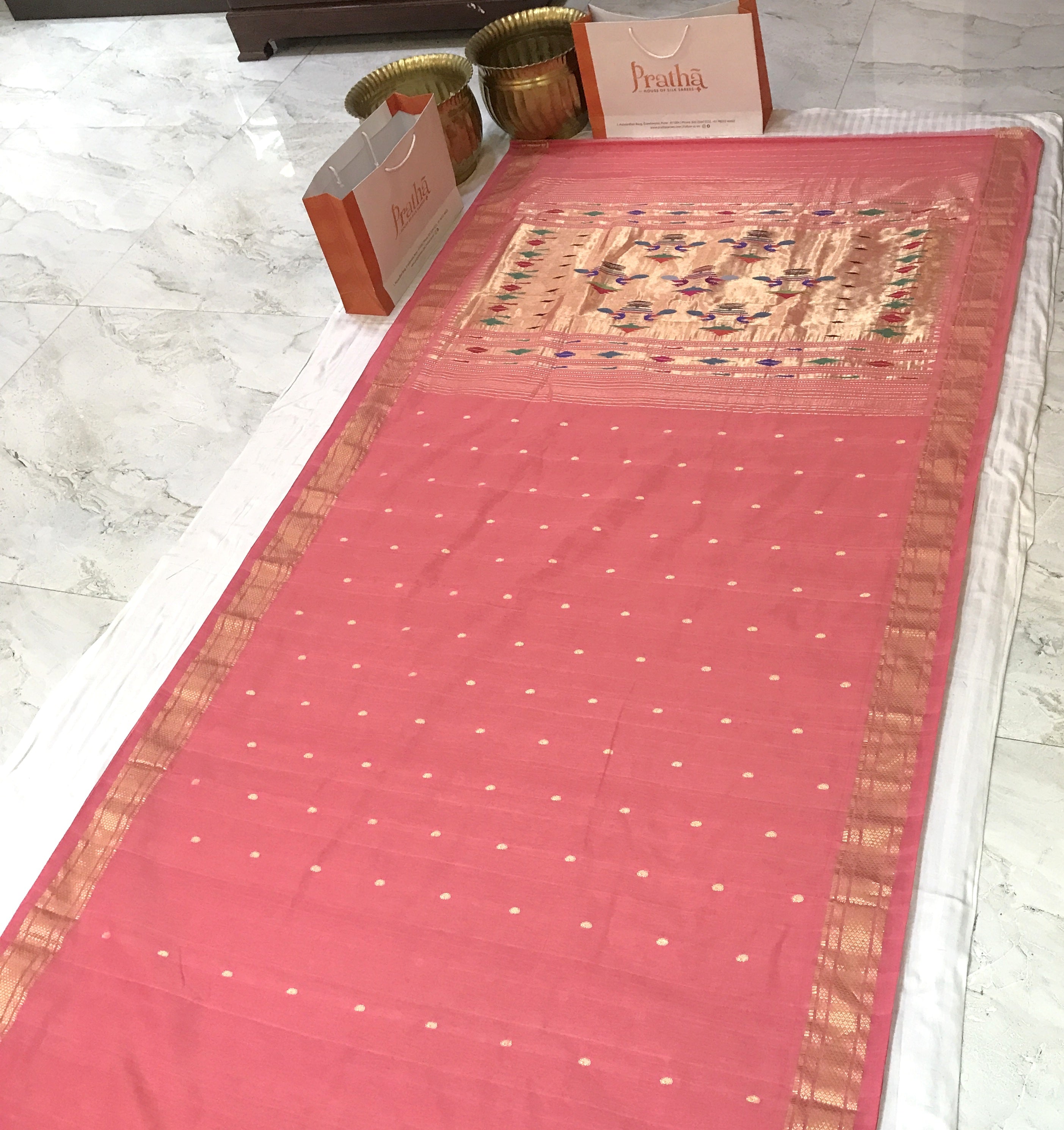 Those who love 'Cotton fabric' will surely love this Cotton Paithani ! This handwoven cotton weave with traditional tissue pallu is incredible. A very beautiful shade of pink with a self coloured golden zari traditional border that looks awesome , this definitely going to win your heart. Light in weight and easy to drape, this Cotton Paithani is Casual yet elegant, simple yet graceful one can flaunt this saree at a variety of occasions!