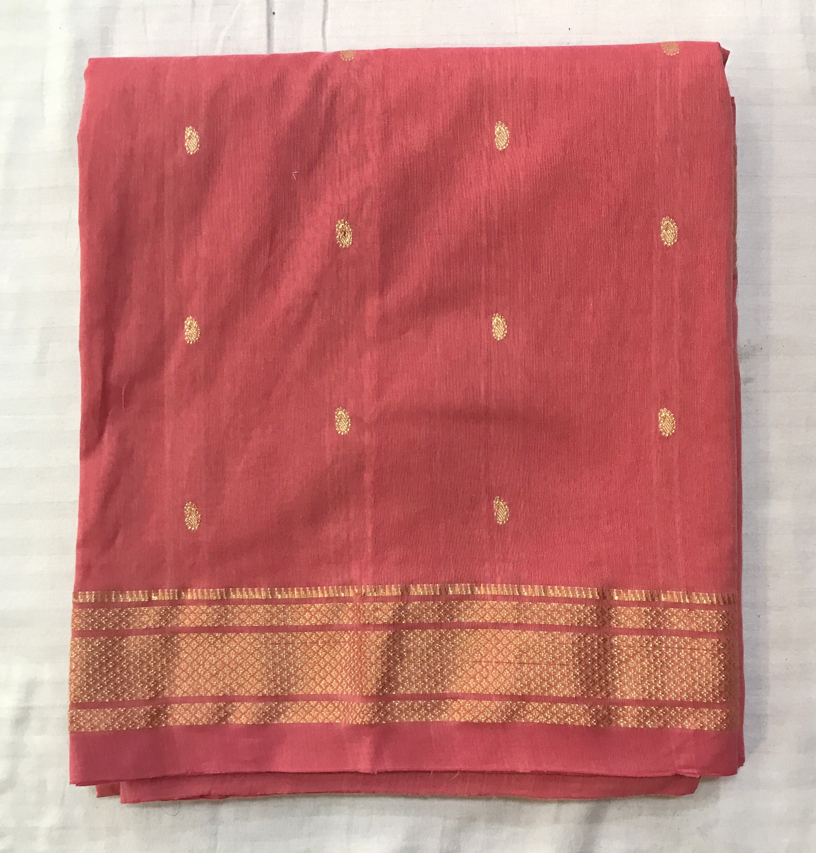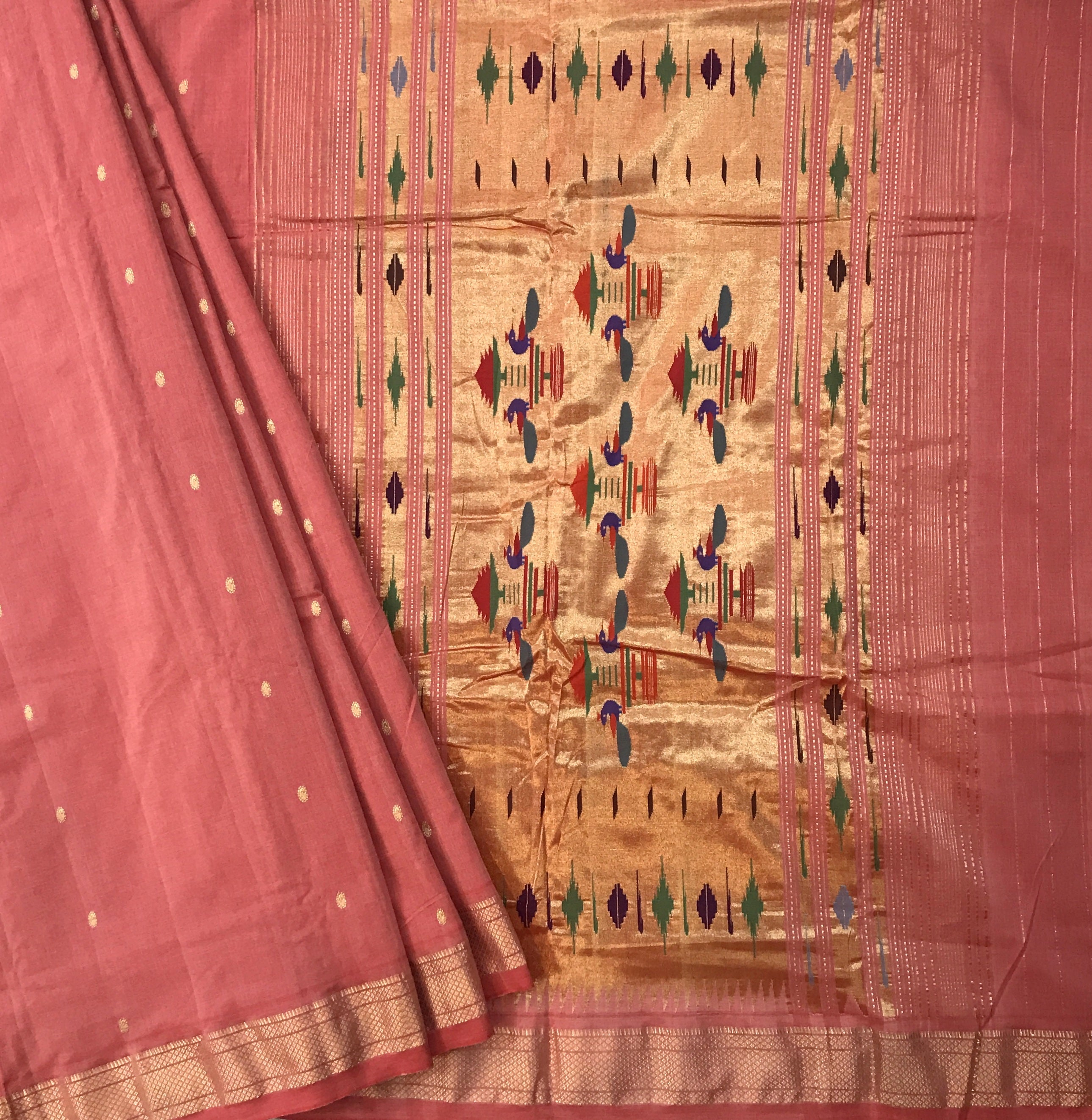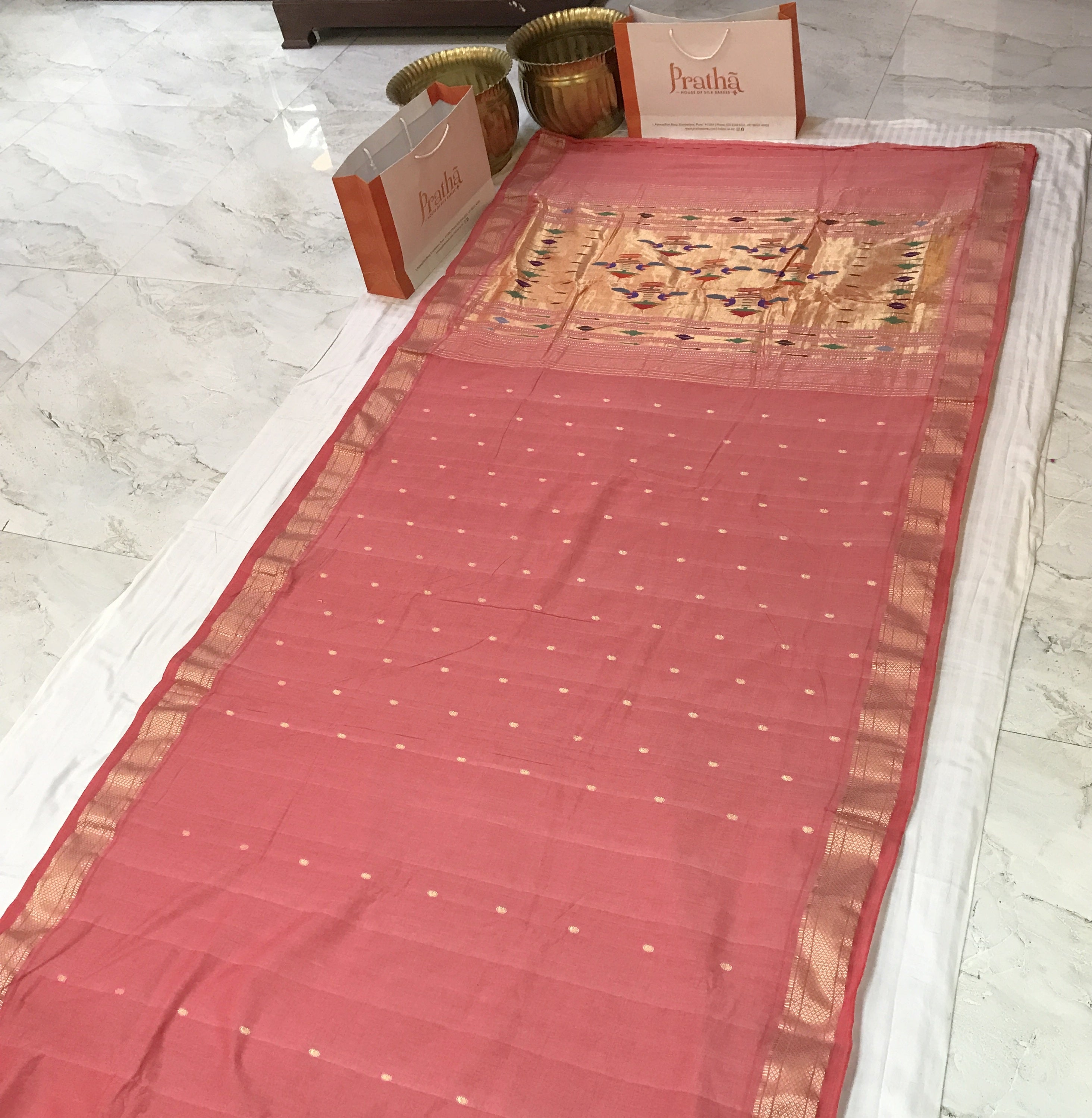 Those who love 'Cotton fabric' will surely love this Cotton Paithani ! This handwoven cotton weave with traditional tissue pallu is incredible. A very beautiful shade of peach with a self coloured golden zari traditional border that looks awesome , this definitely going to win your heart. Light in weight and easy to drape, this Cotton Paithani is Casual yet elegant, simple yet graceful one can flaunt this saree at a variety of occasions!