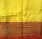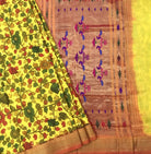 This exquisite Kalamkari Paithani saree features a vibrant yellow body adorned with intricate hand-drawn floral creeper motifs, showcasing the timeless artistry of Kalamkari craftsmanship. The richly woven Paithani pallu in a warm copper-gold tone is beautifully enhanced with traditional geometric motifs in hues of purple, blue, and green, adding depth and cultural richness. Finished with a classic zari border, this saree is a stunning fusion of narrative Kalamkari art and regal Paithani weaving perfect for festive occasions, weddings, and heritage celebrations.