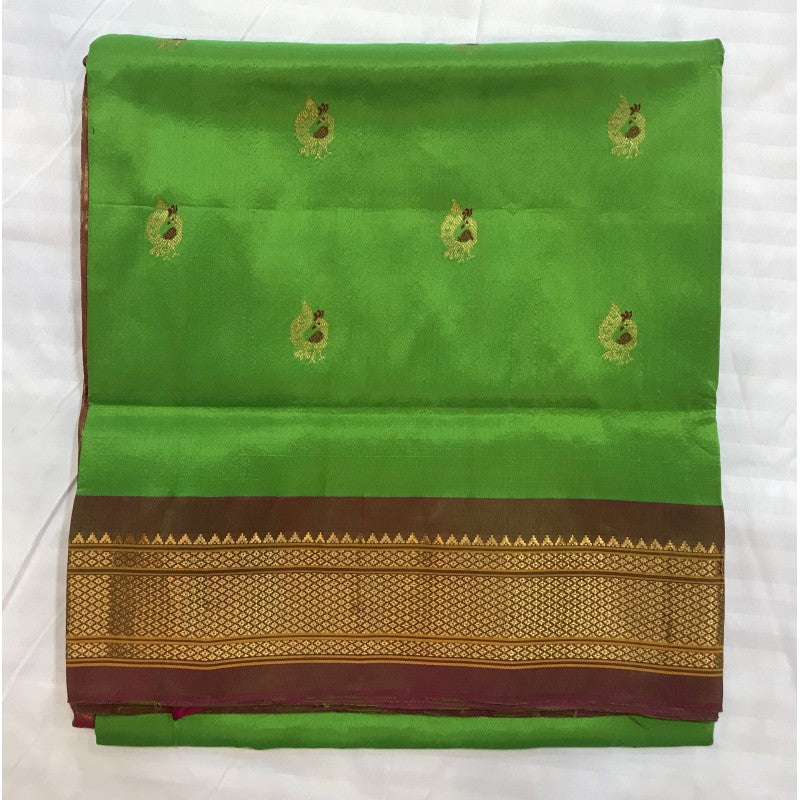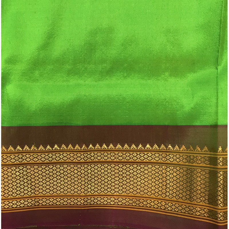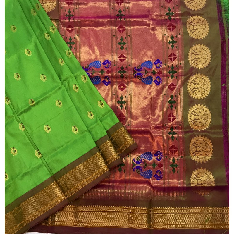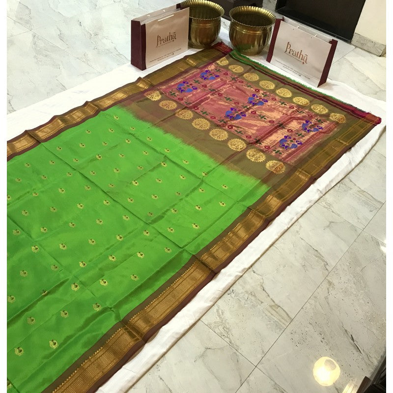 A lush shade of green is the most sought after in Paithani sarees. This vibrant parrot green Paithani with a brown border and copperish zari pallu looks beautiful in day light as well as at night time. The traditionally woven border and pallu make this a classic weave. Delicate peacock butti highlighted with red silk thread adds to the beauty of this weave!