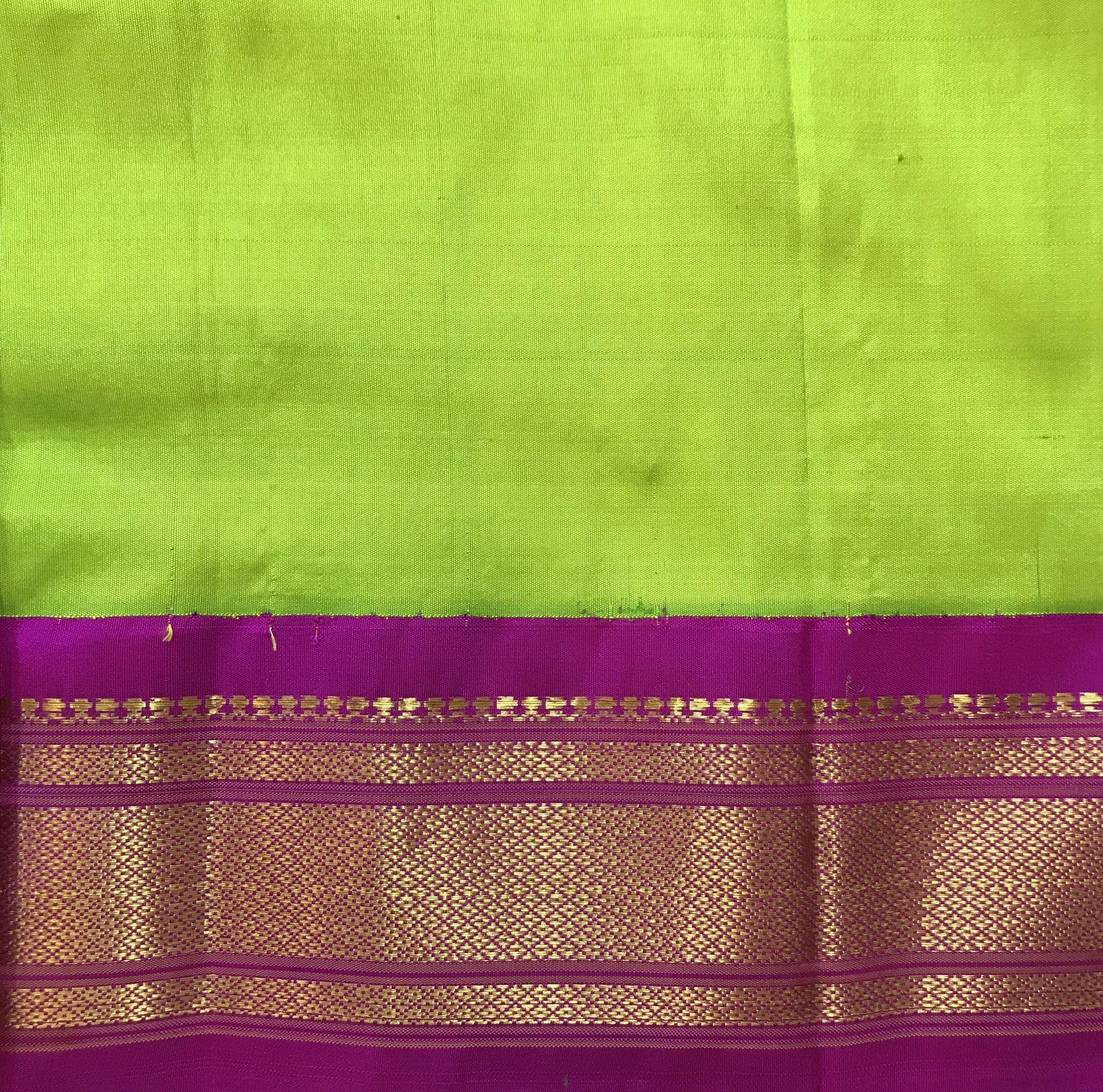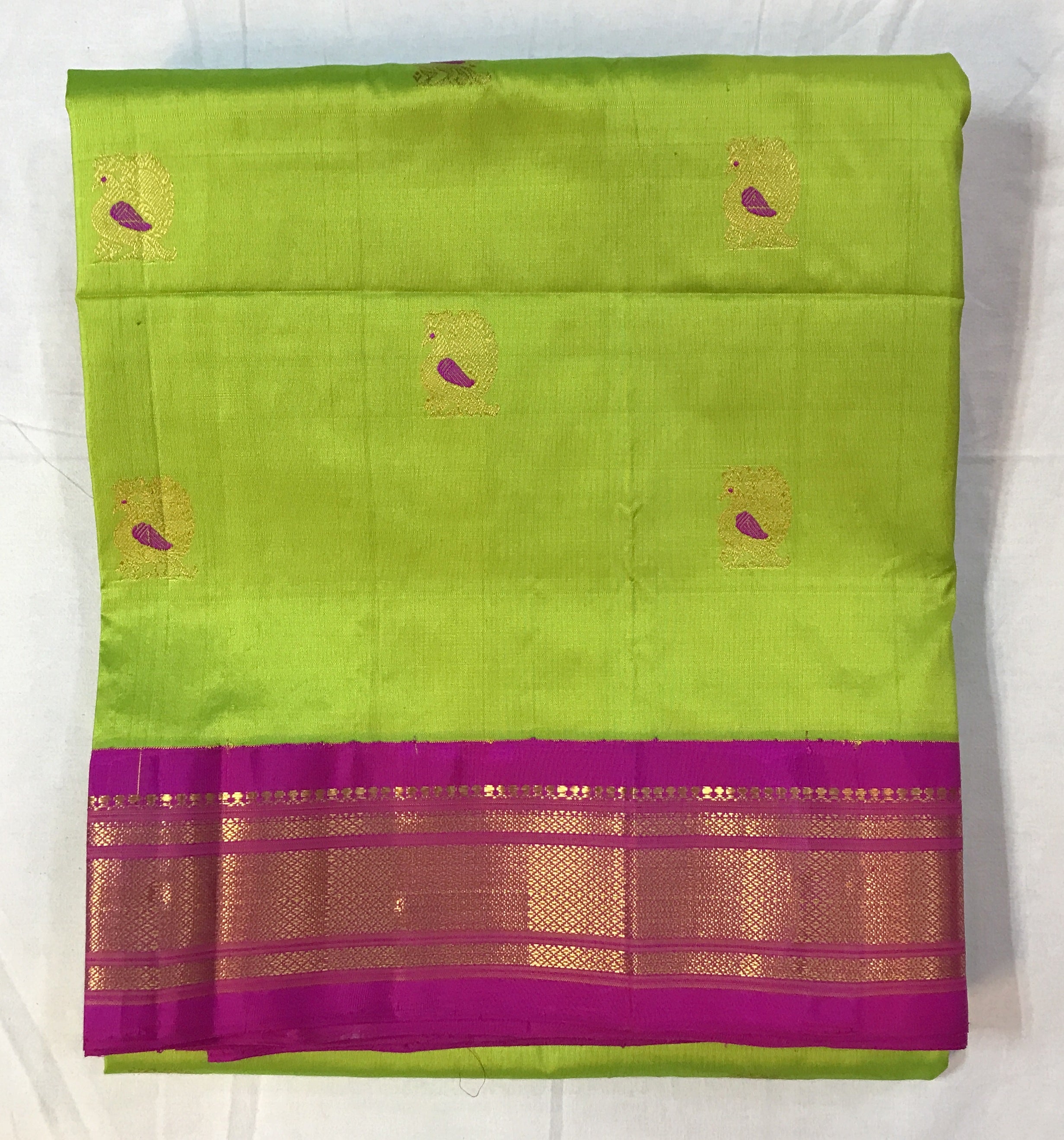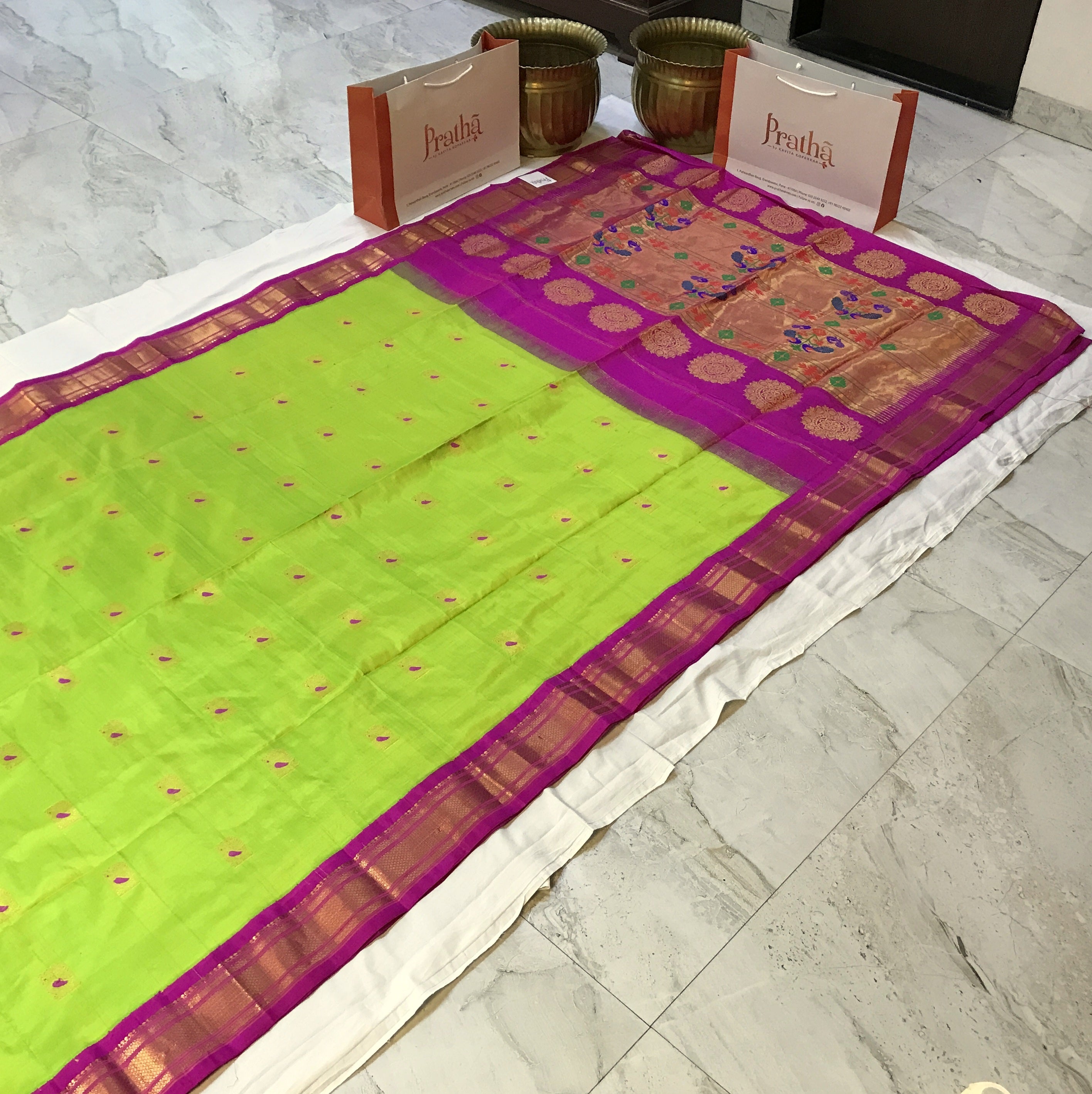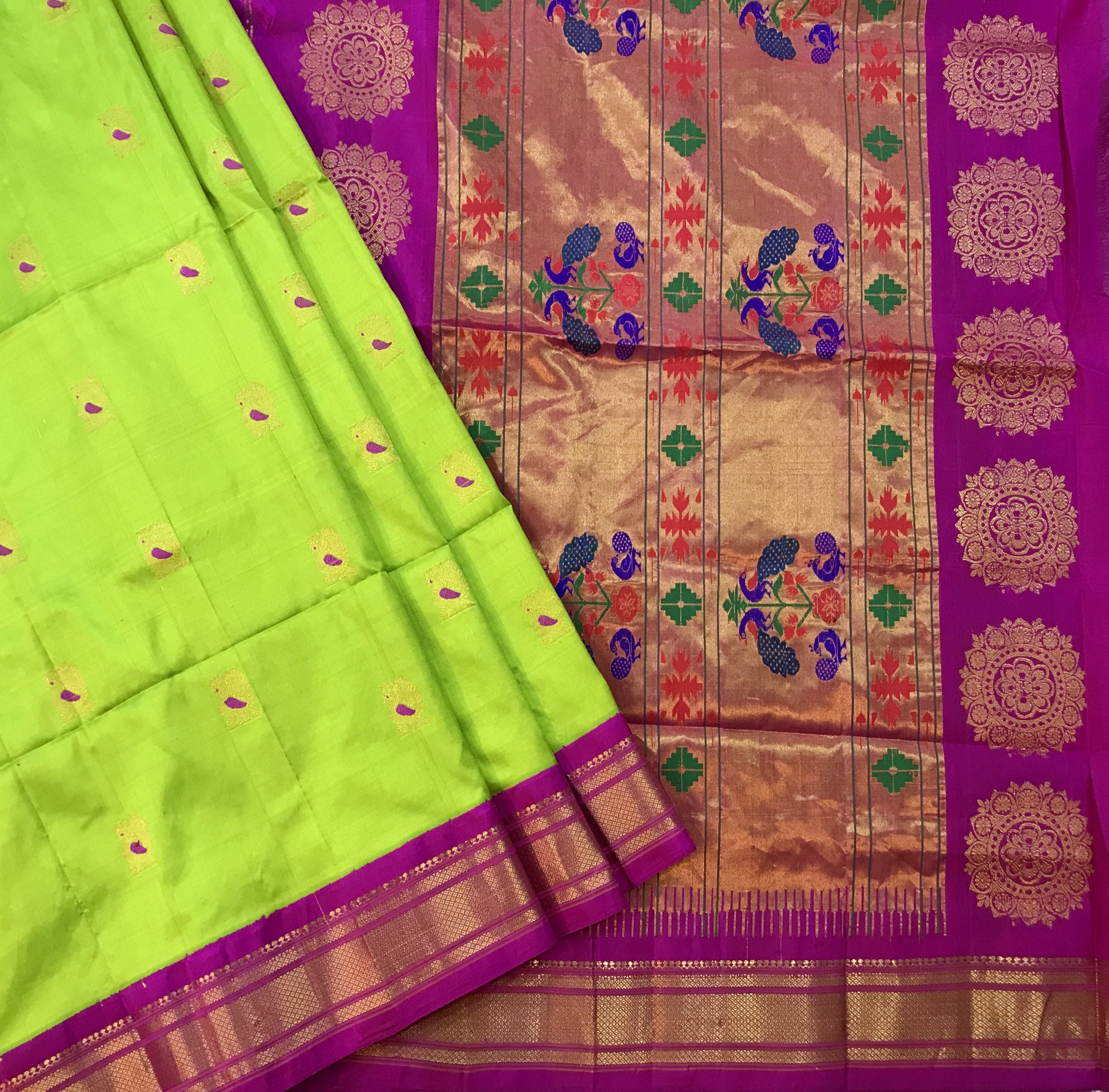 A very pretty shade of parrot green with contrasting bright-pink border , this vibrant colour of Paithani gives the traditional drape a touch of contemporary style. The combination of this lovely colour with an intense kadiyal border and golden zari pallu adds to its style quotient. Do not miss the peacock butti highlighted in pink silk thread throughout this Paithani.