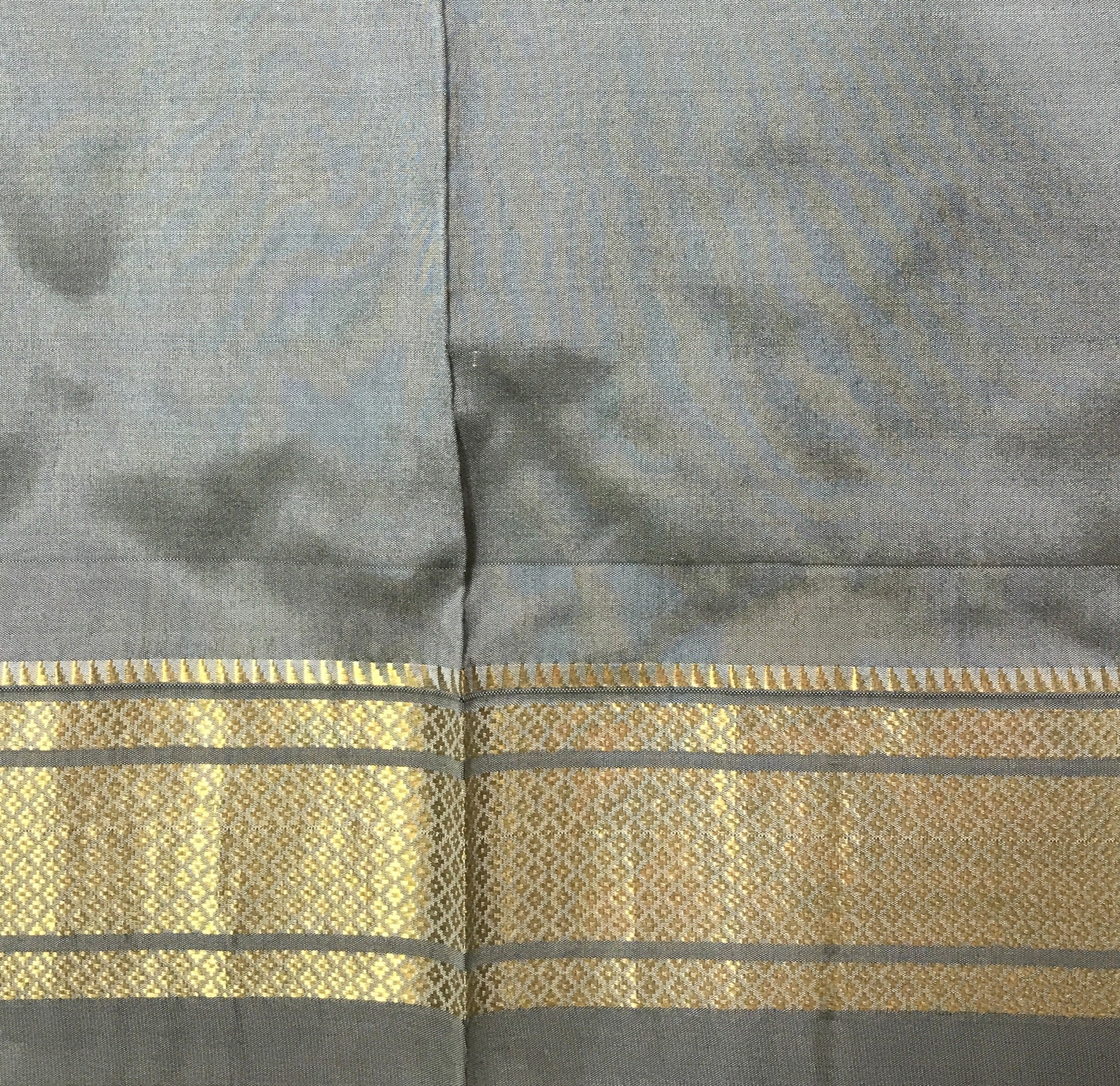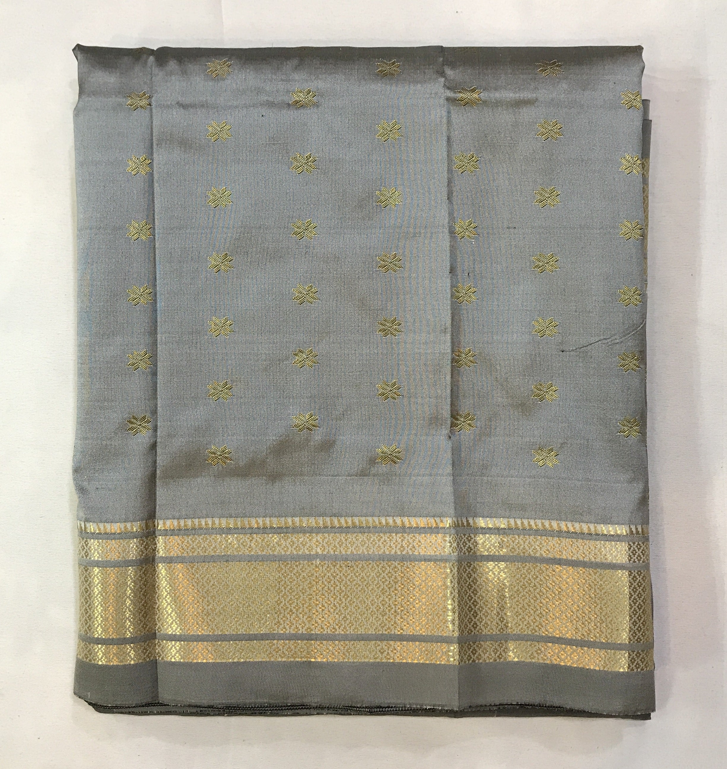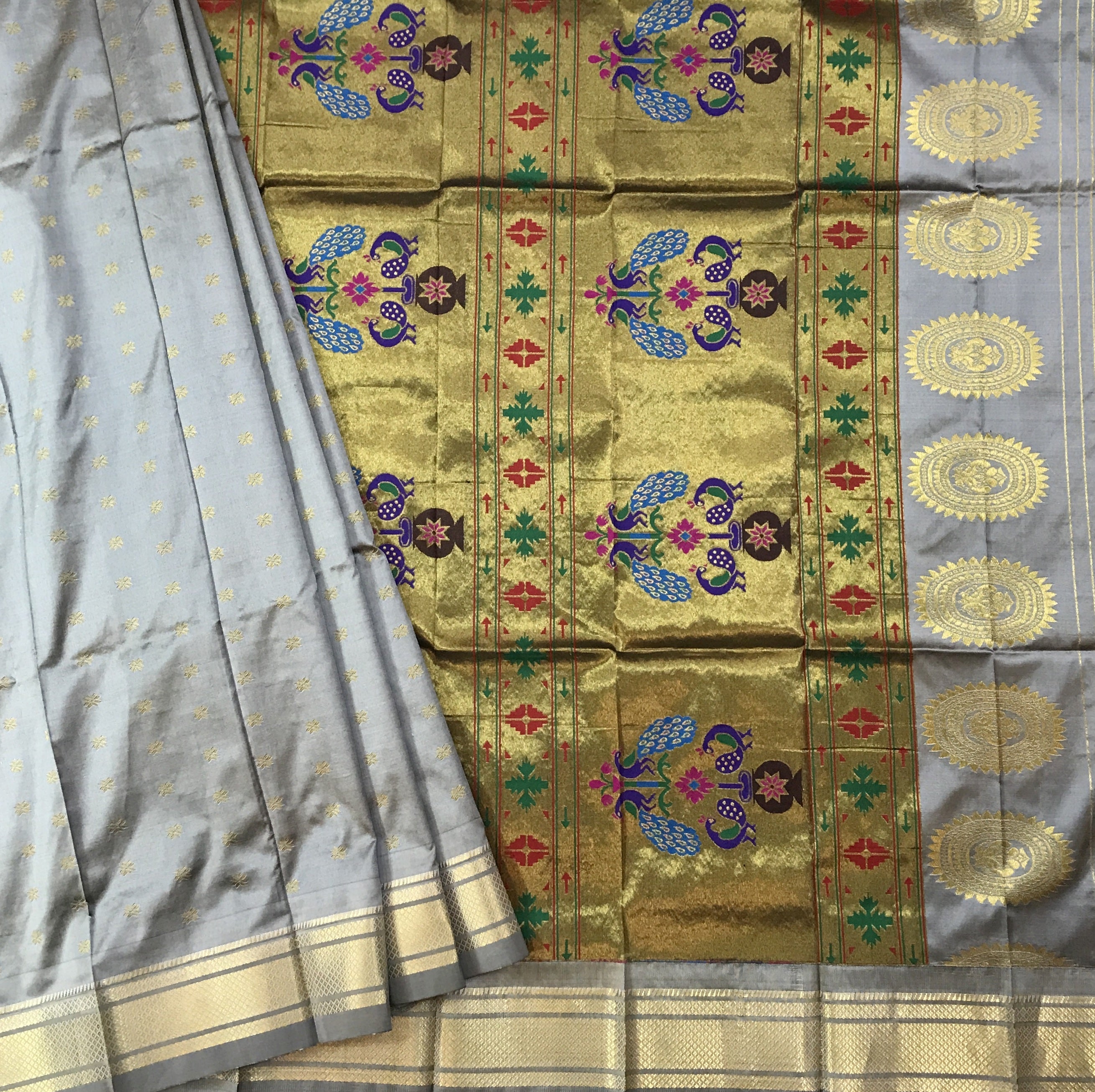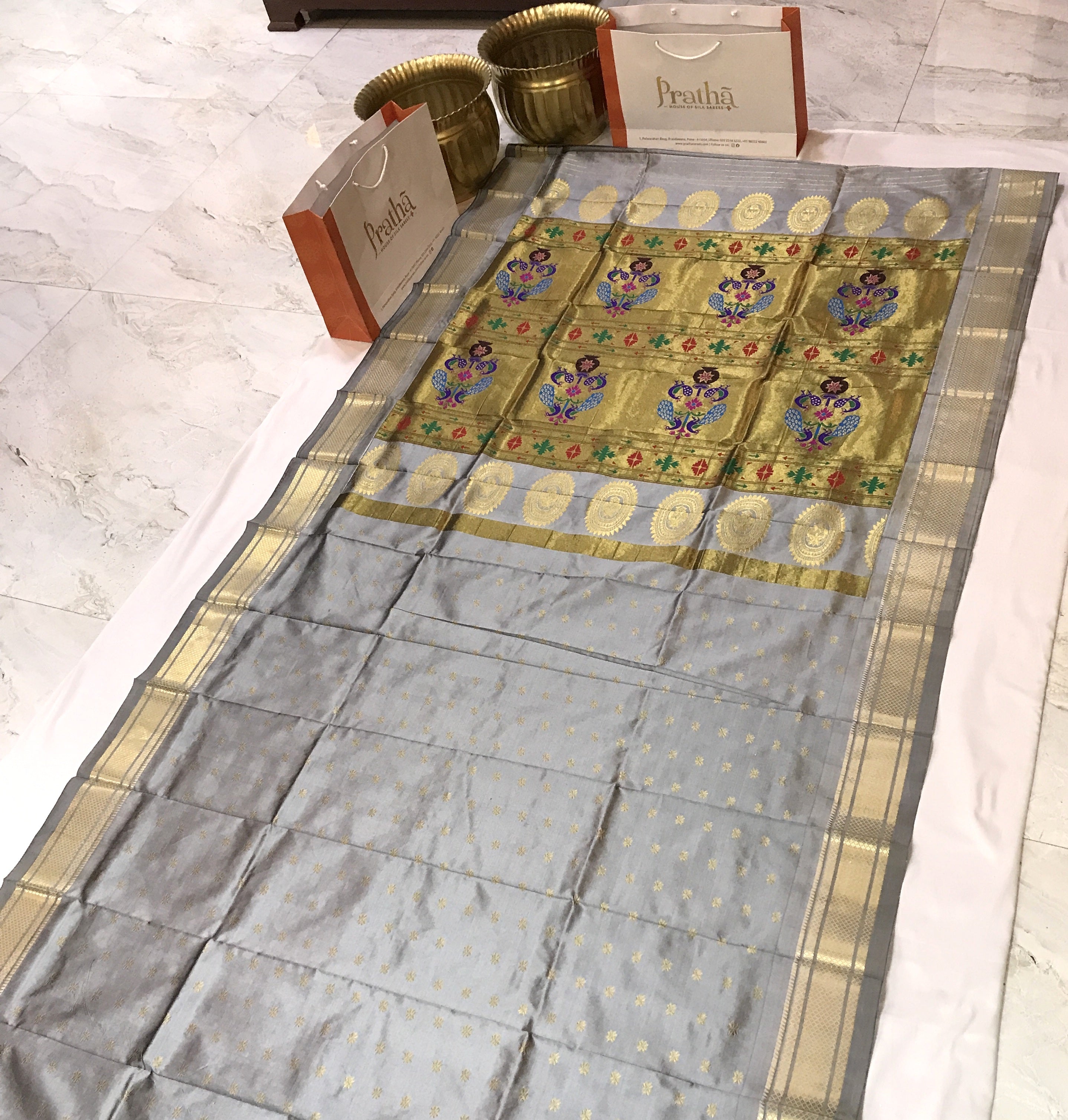 This is an extremely unique shade which is a beautiful grey. This powrloom pure silk Paithani is an incredible weave! This colour always wins hearts especially when it teams up with a beautiful golden zari at its border and pallu. The classic tissue pallu of this saree stands true to Paithani traditional. Delicate floral butti woven in golden zari thread adds to the beauty of this weave!