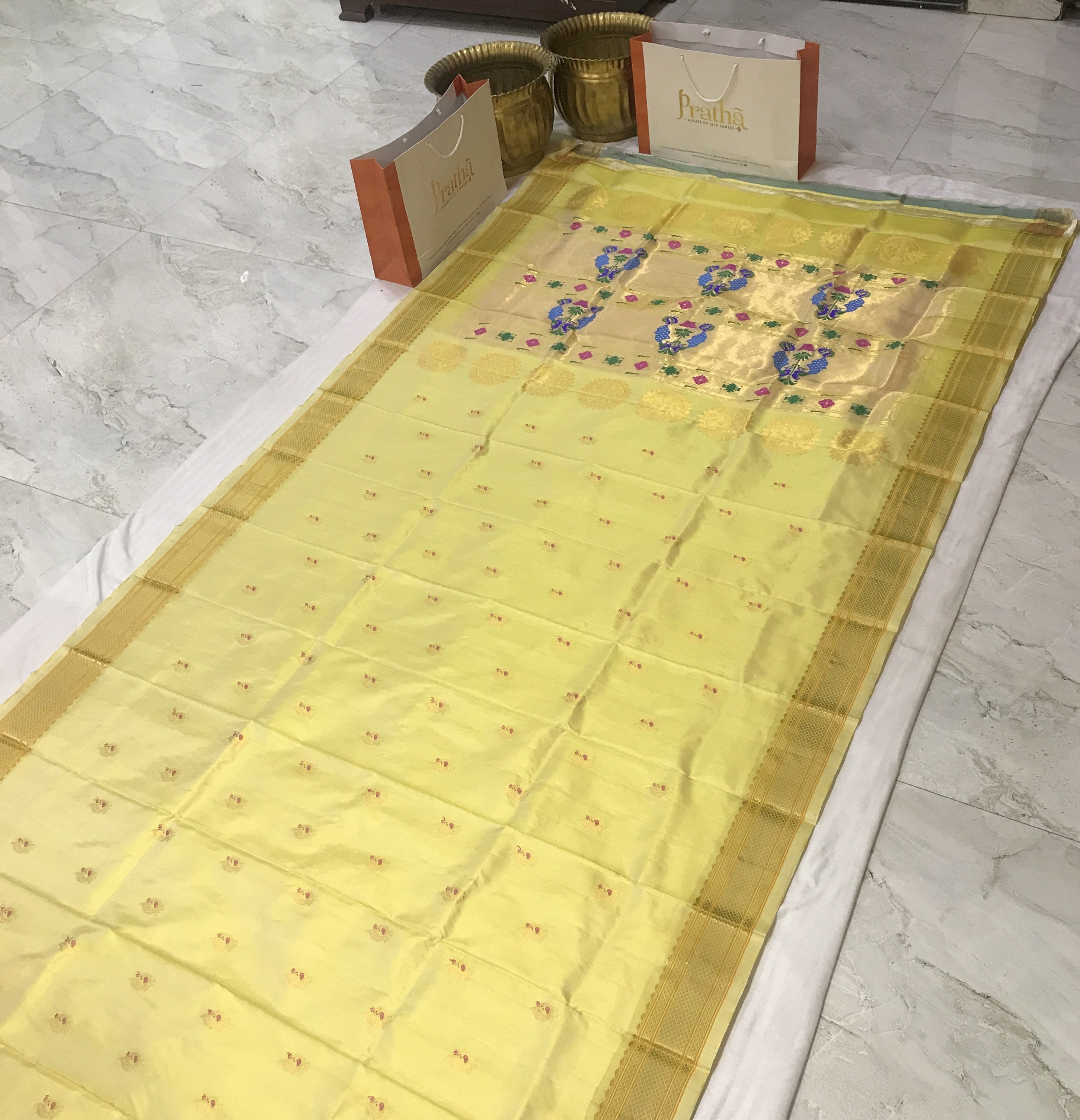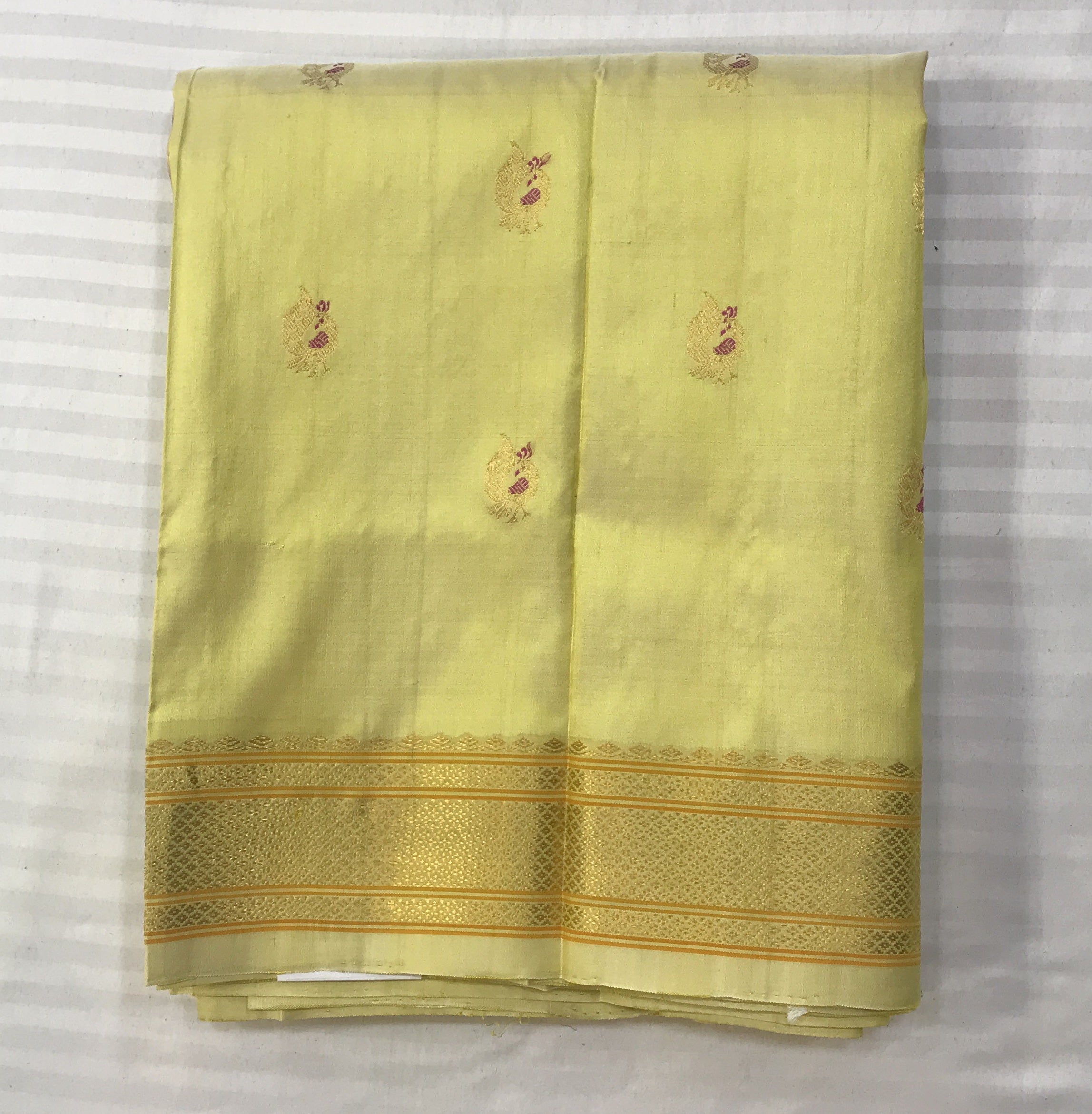 Blouse Colour: Contrast ( Yellow with golden zari border )