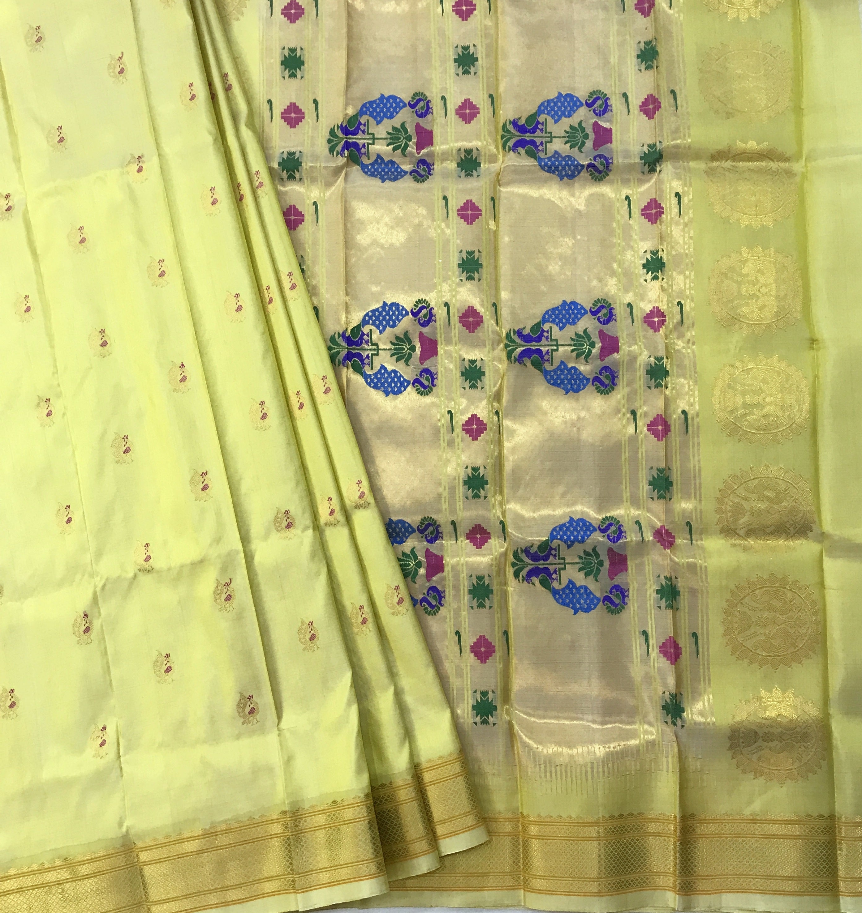 A supreme Paithani weave, in this stunning, beautiful shade of shining yellow is a treat to your eyes! This, with a beautiful self coloured border looks incomparable! Do not miss the peacock butti highlighted in pink silk thread throughout this Paithani! The traditional tissue pallu with elaborate peacock motifs looks graceful. This is a perfect pick for those who are looking for a unique Paithani to add their collections!