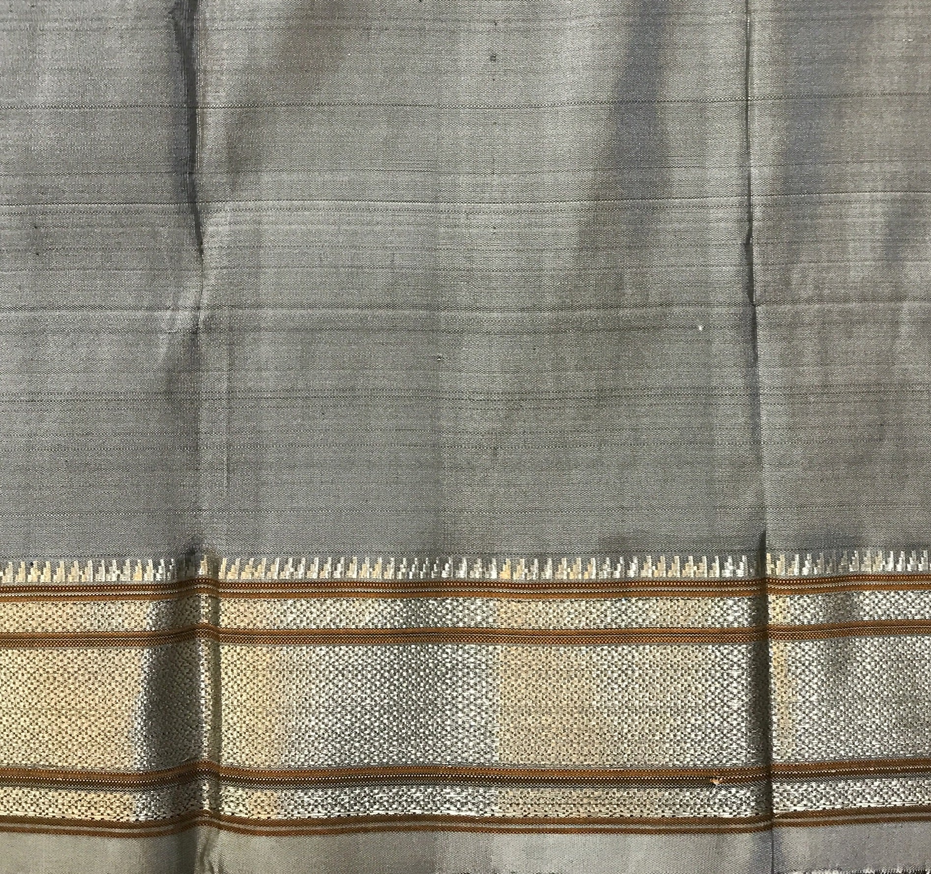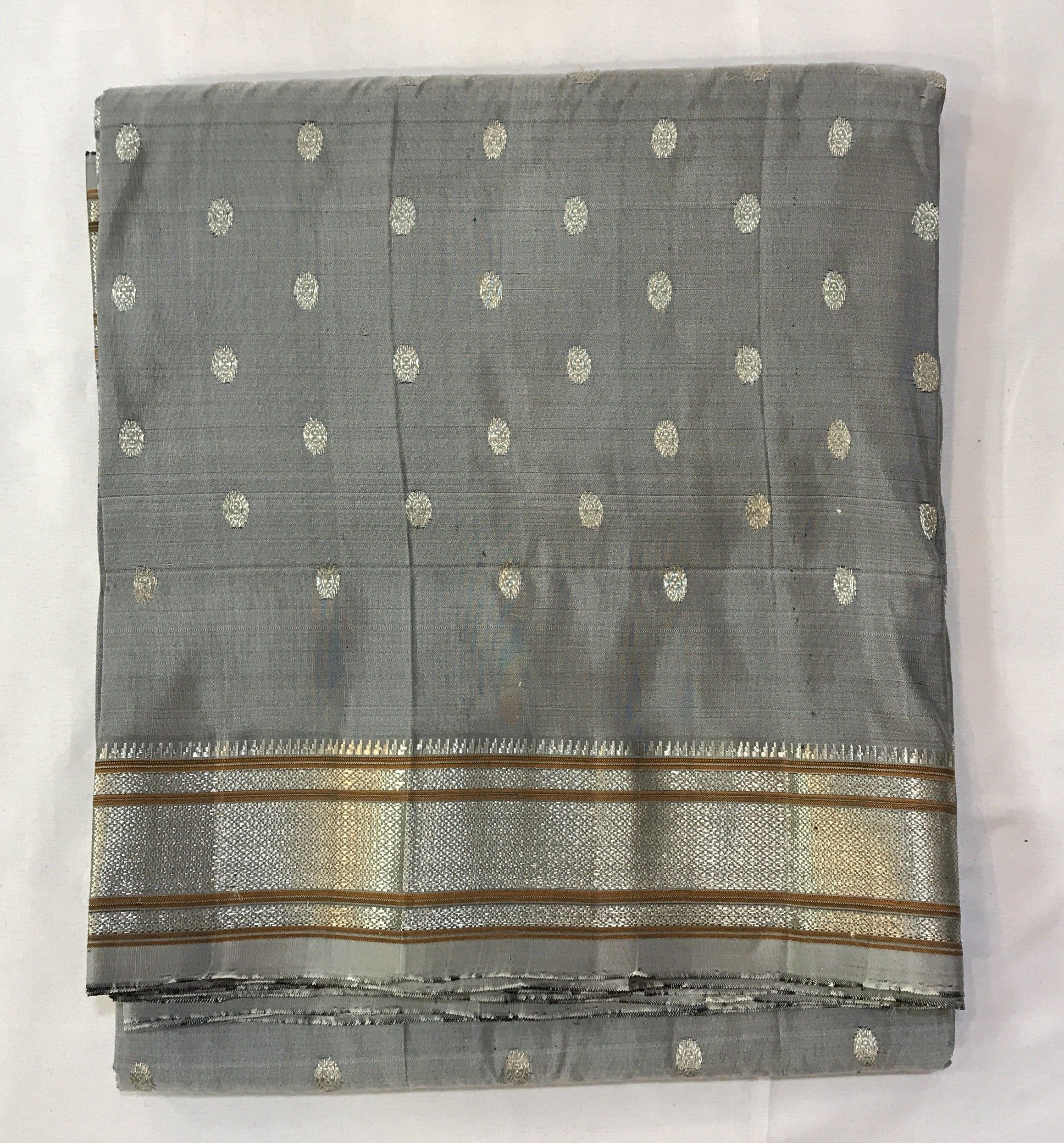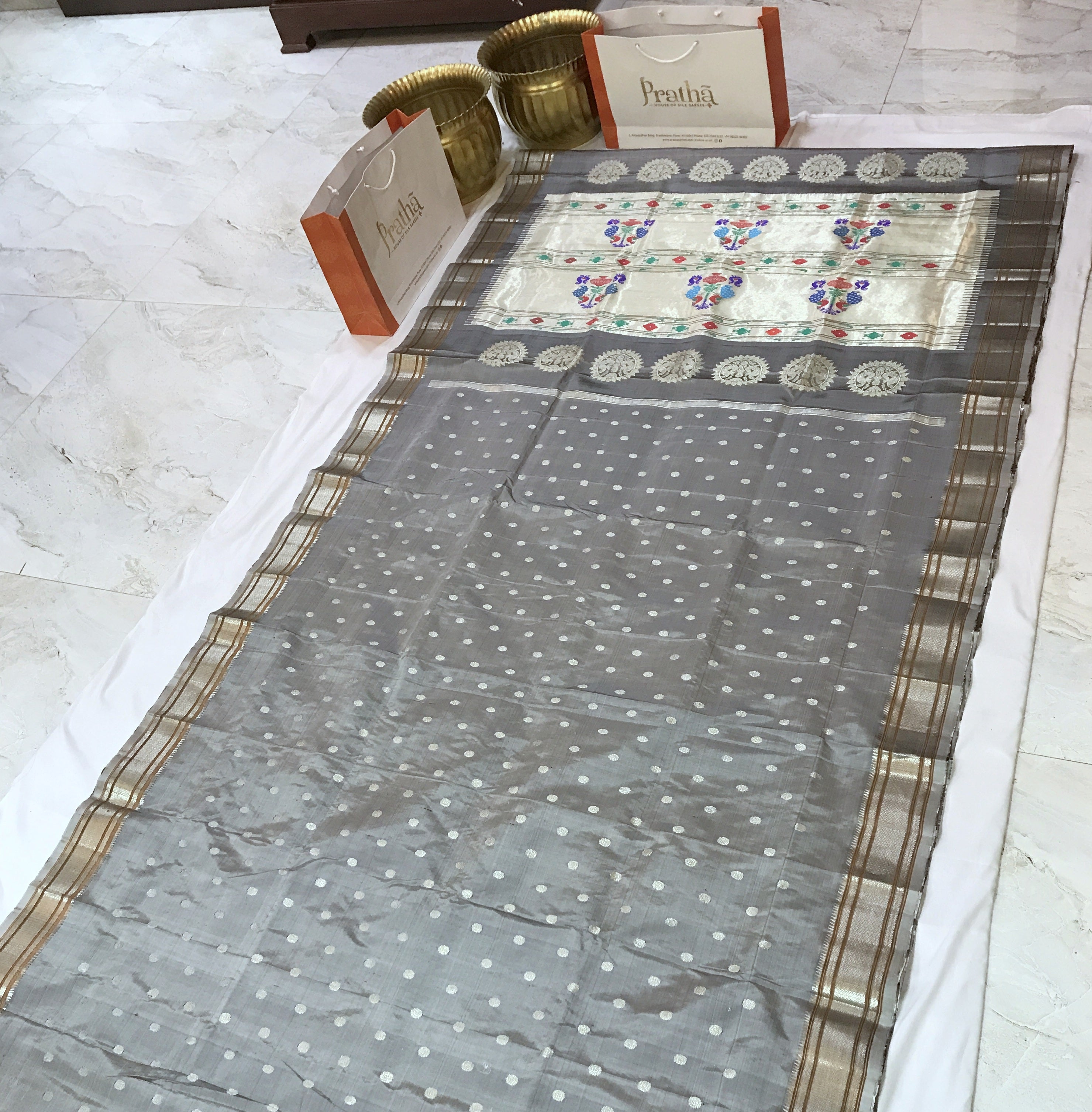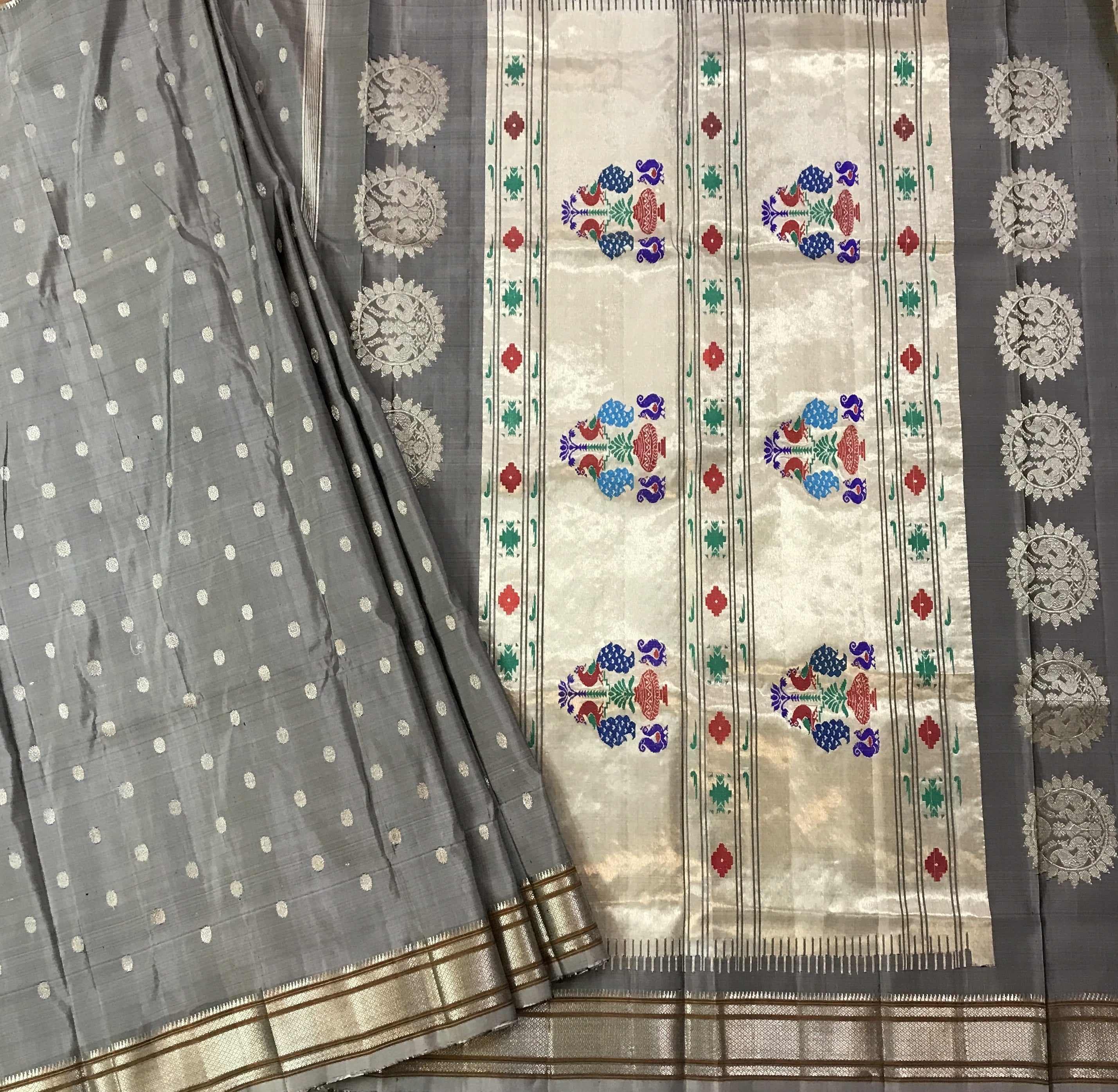 A very beautiful fresh shade of grey Paithani is so glamorous that you would surely want to have it in their closet ! This gorgeous coloured Paithani with a self coloured silver zari border is a special one. This intricate floral shaped butti in silver zari thread running evenly through the body makes this weave class apart!
