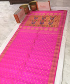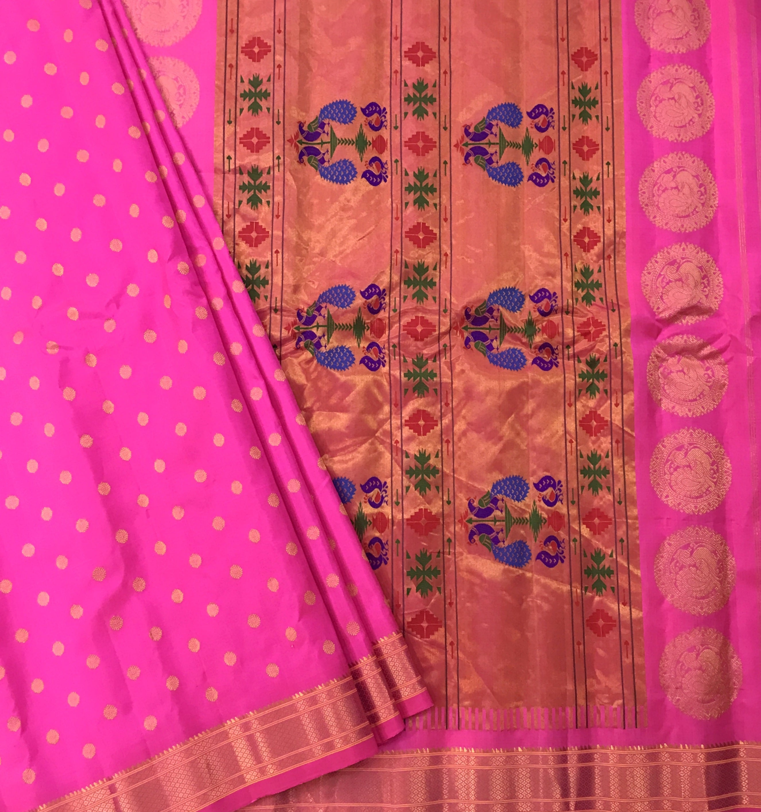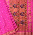 This stunning Pink Paithani exudes timeless charm with its rich, self-woven golden zari border crafted in true traditional style. The saree is adorned with delicate floral buttis, each intricately woven with shimmering zari that adds a subtle yet captivating sparkle across the drape. The classic tissue pallu, embellished with beautifully detailed peacock motifs, elevates its grace and grandeur. An exceptional choice for anyone seeking a distinctive and elegant Paithani to enhance their collection.