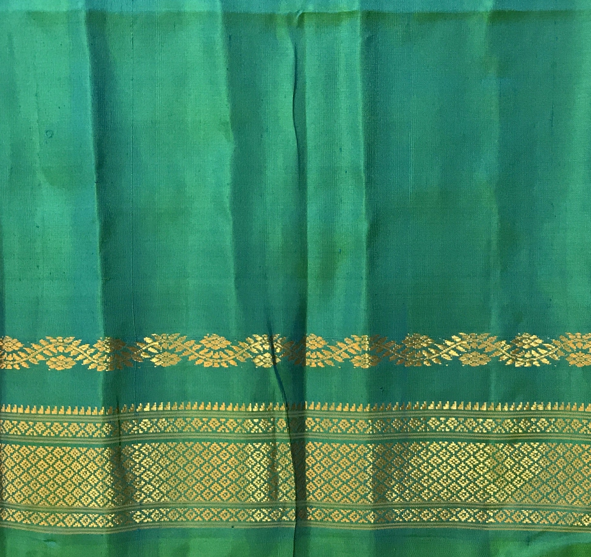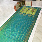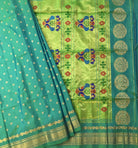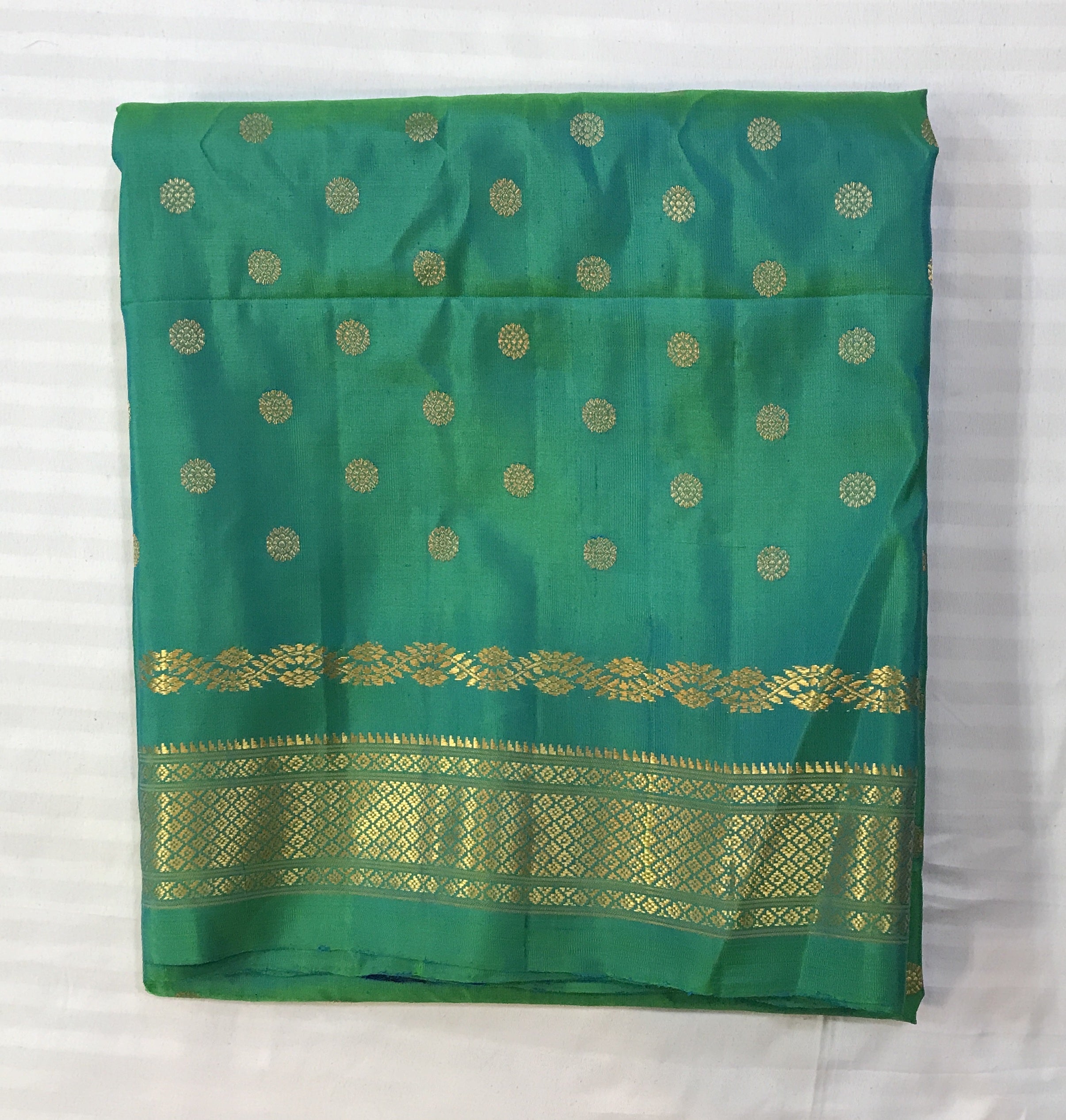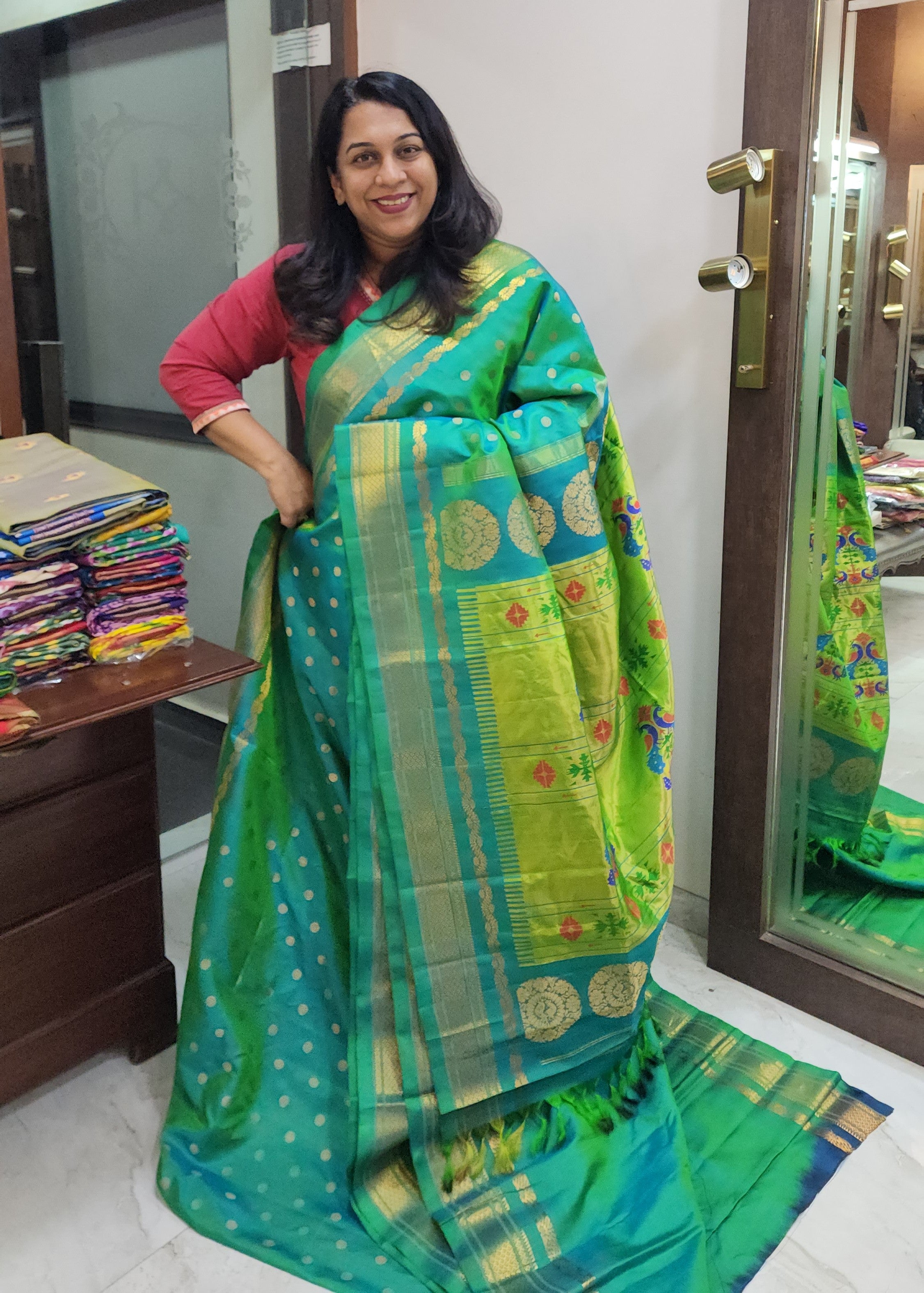This shade of green peacock, a very popular and important colour in many Indian wedding traditions , in a handwoven Paithani looks great ! This stunning Paithani flaunts beautiful butti and the classic peacock ( motifs ) zari pallu . Paithani's in one single colour are sought after! Pratha happily presents these in beautiful colours.