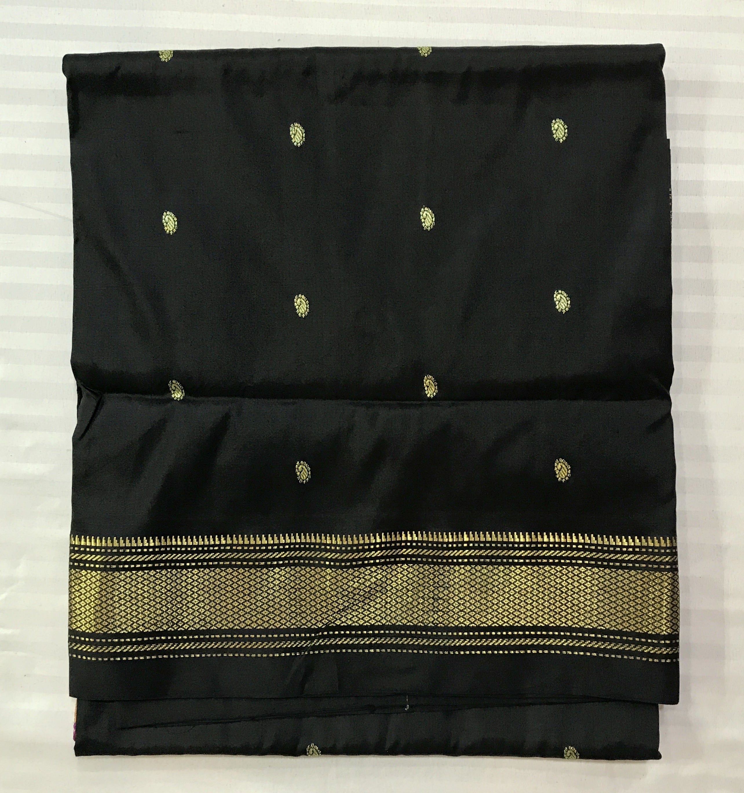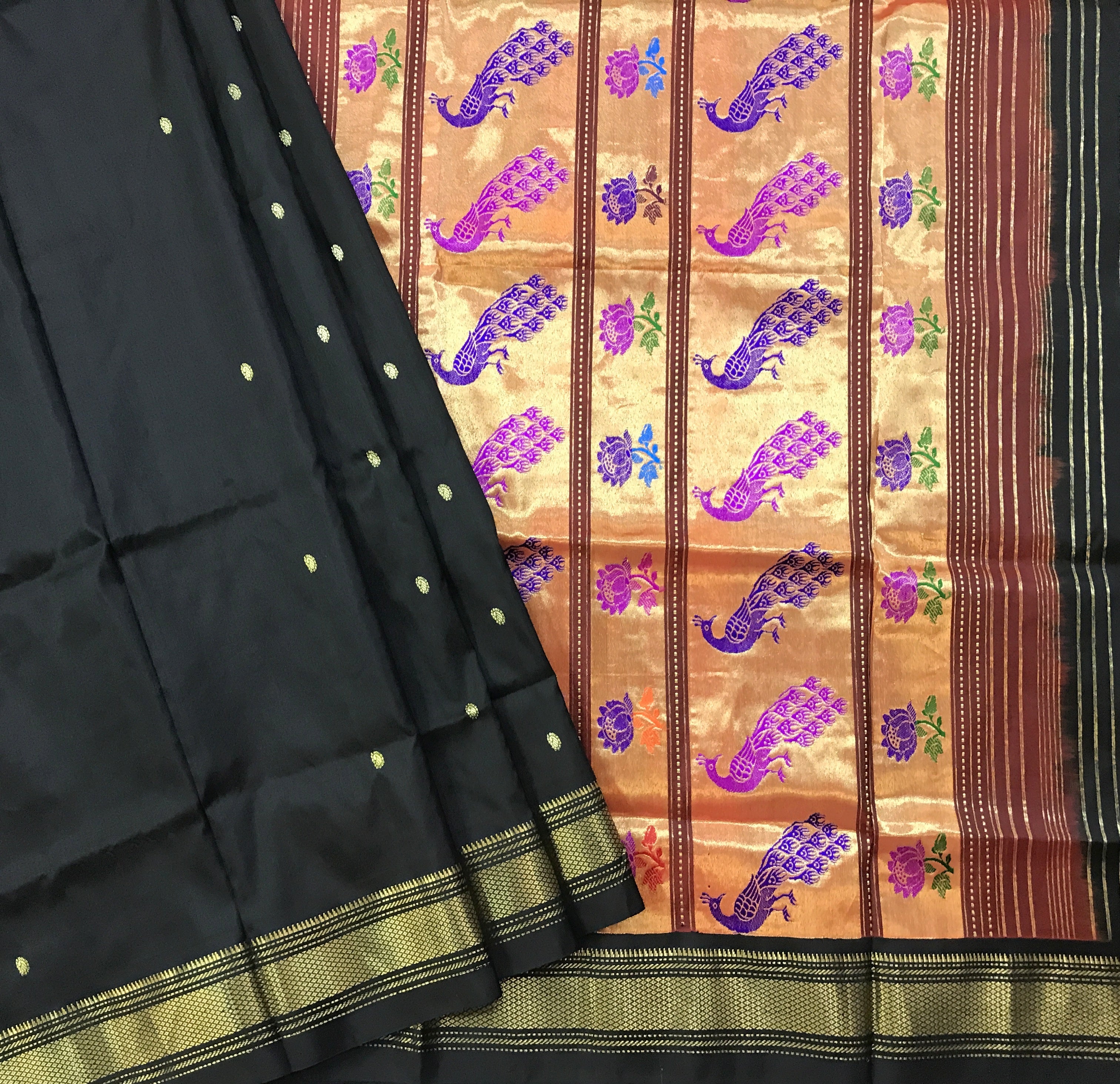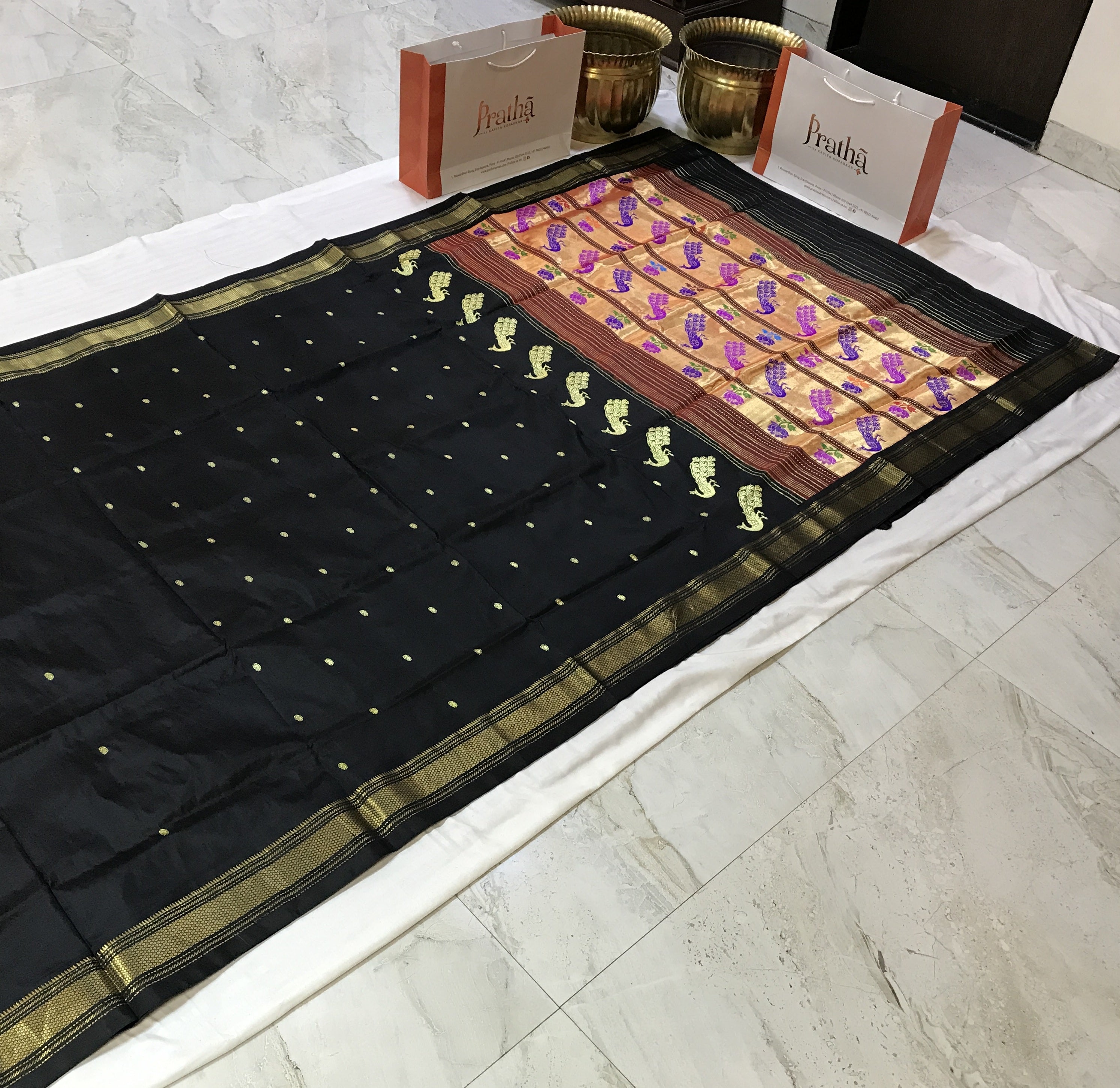 Black coloured is an all time favorite! This popular combination of Black saree with self golden zari border and pallu, in a Paithani is a keepsake. The beautifully small koyari butti , highlighted with an golden zari and the grand pallu make this Paithani a grand weave!