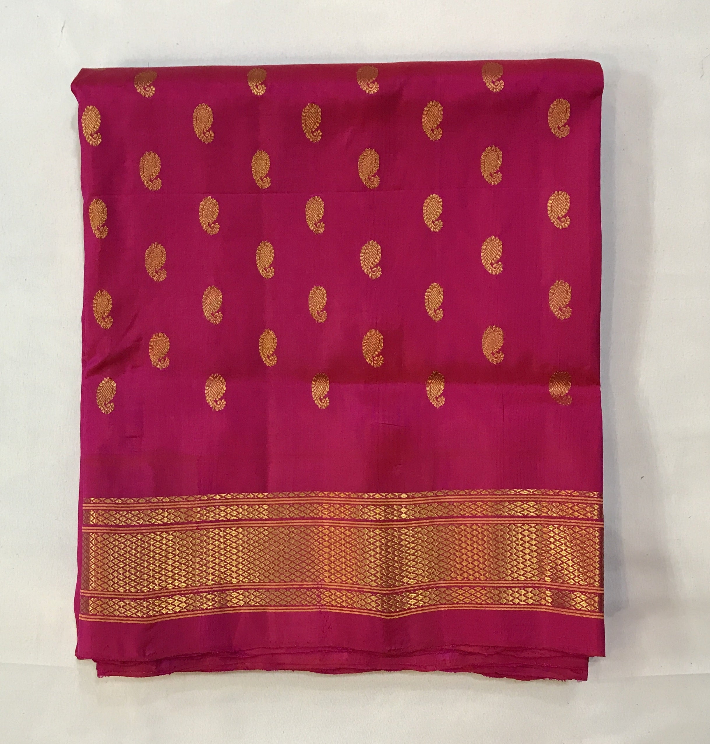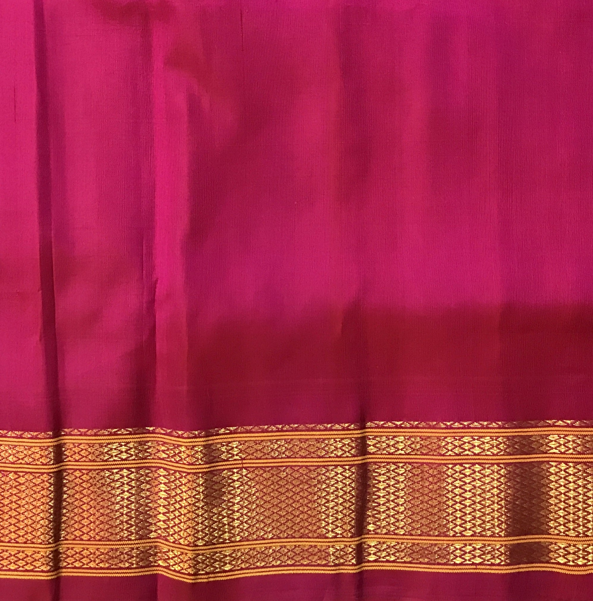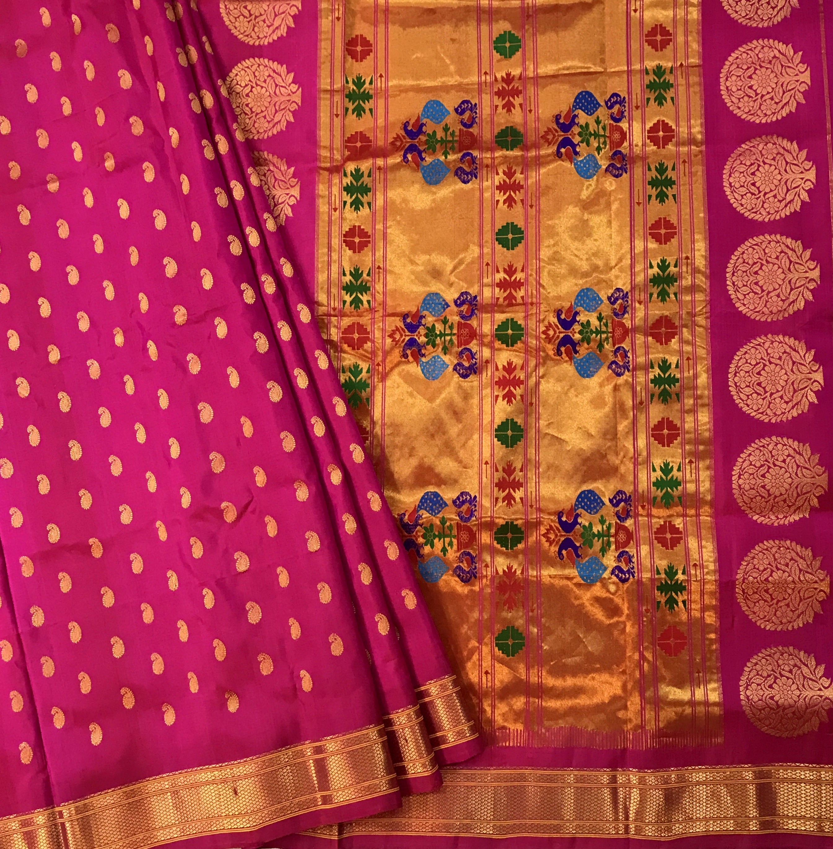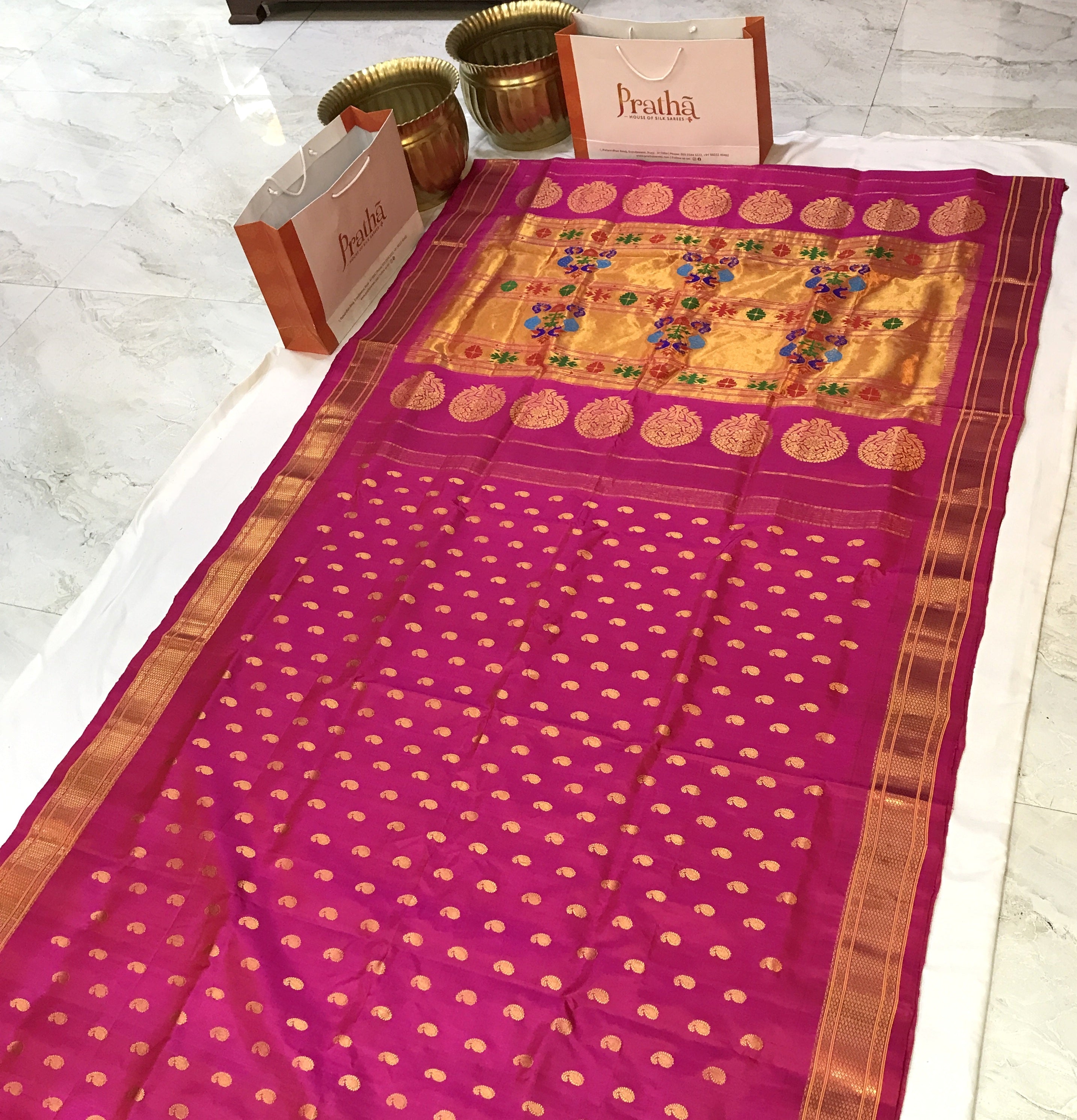 A very gorgeous shade of pink golden Paithani with a self coloured border creates great drama with the high contrasting levels. The traditional border and delicate golden-koyari butti and classic tissue pallu add an elegance in the contrast. This vibrant Paithani is perfect for weddings and any other festive occasions!