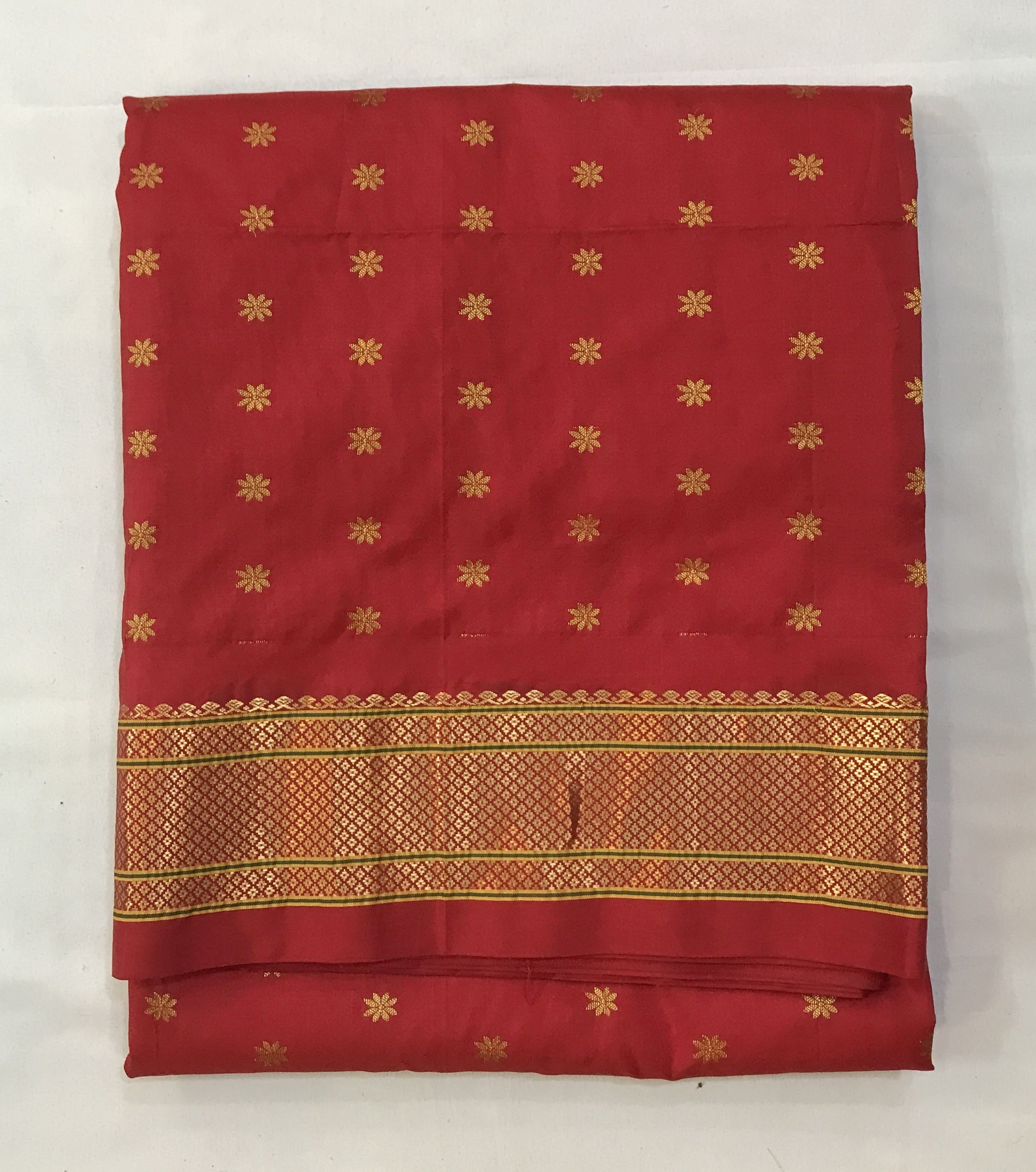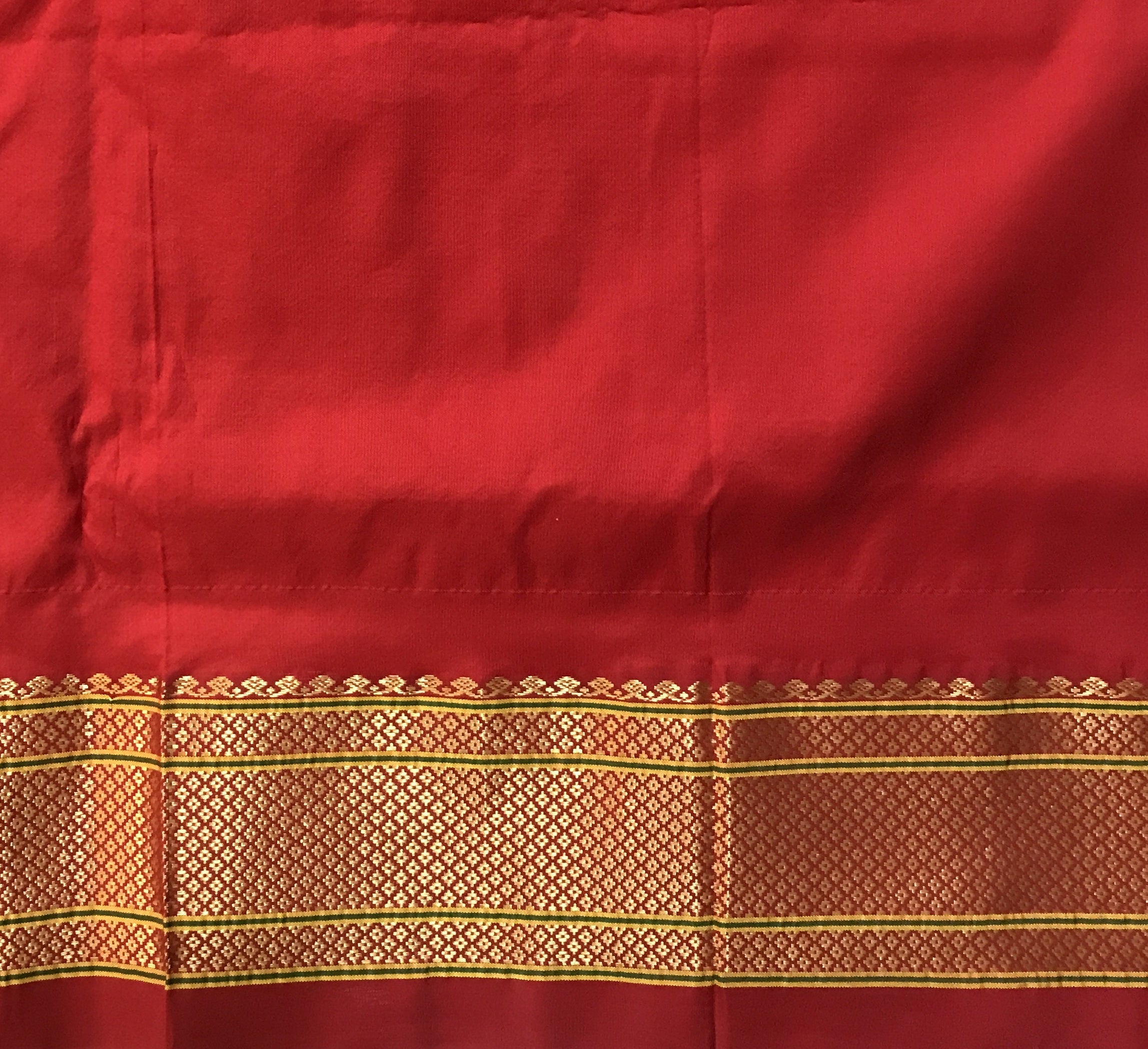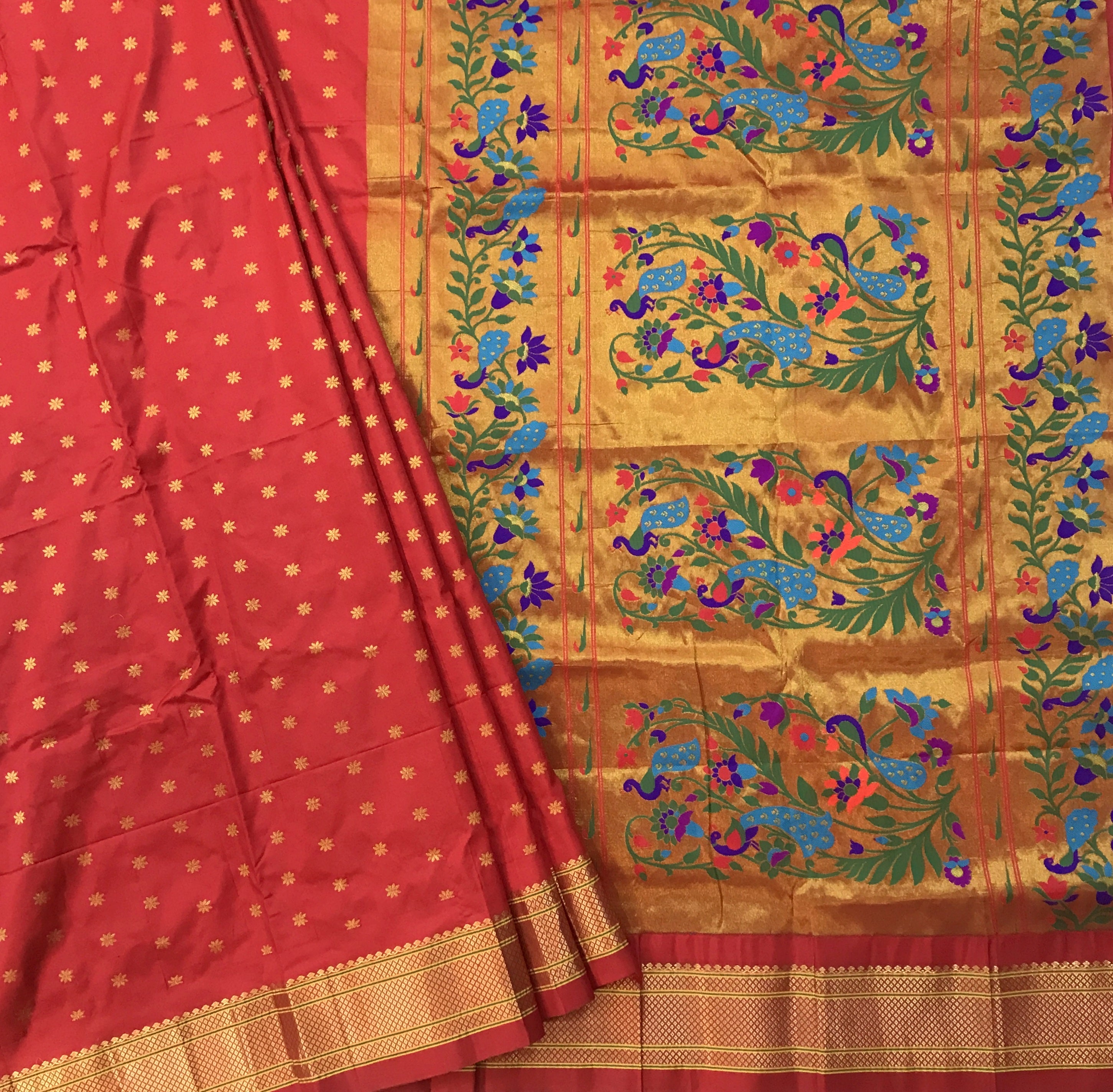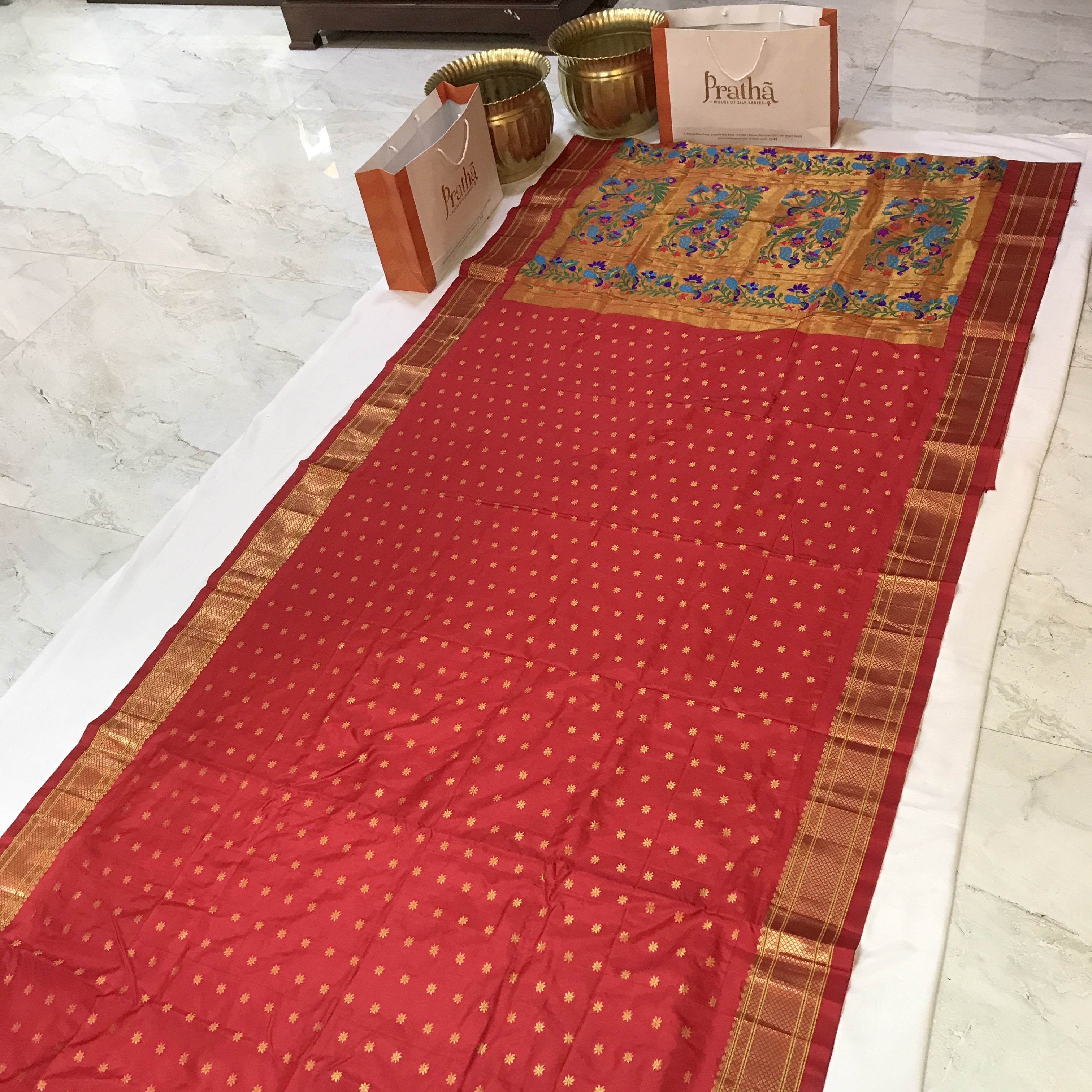 A very gorgeous rotating shade of red golden Paithani with a border creates great drama with the high contrasting levels. The traditional border and delicate golden-floral butti and classic tissue pallu add an elegance in the contrast. This vibrant Paithani is perfect for weddings and any other festive occasions!