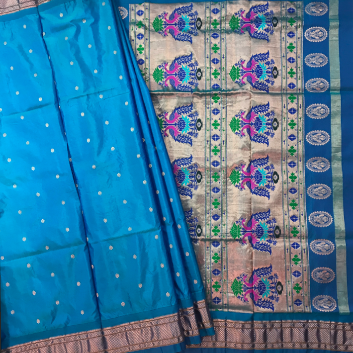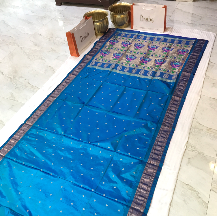 The phenomenal combination of blue Paithani with a very beautiful self coloured border is Pratha's favorite. The delicate floral butti add the needed amount of grace which makes it perfect for any and every special occasion of yours!