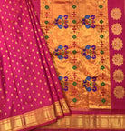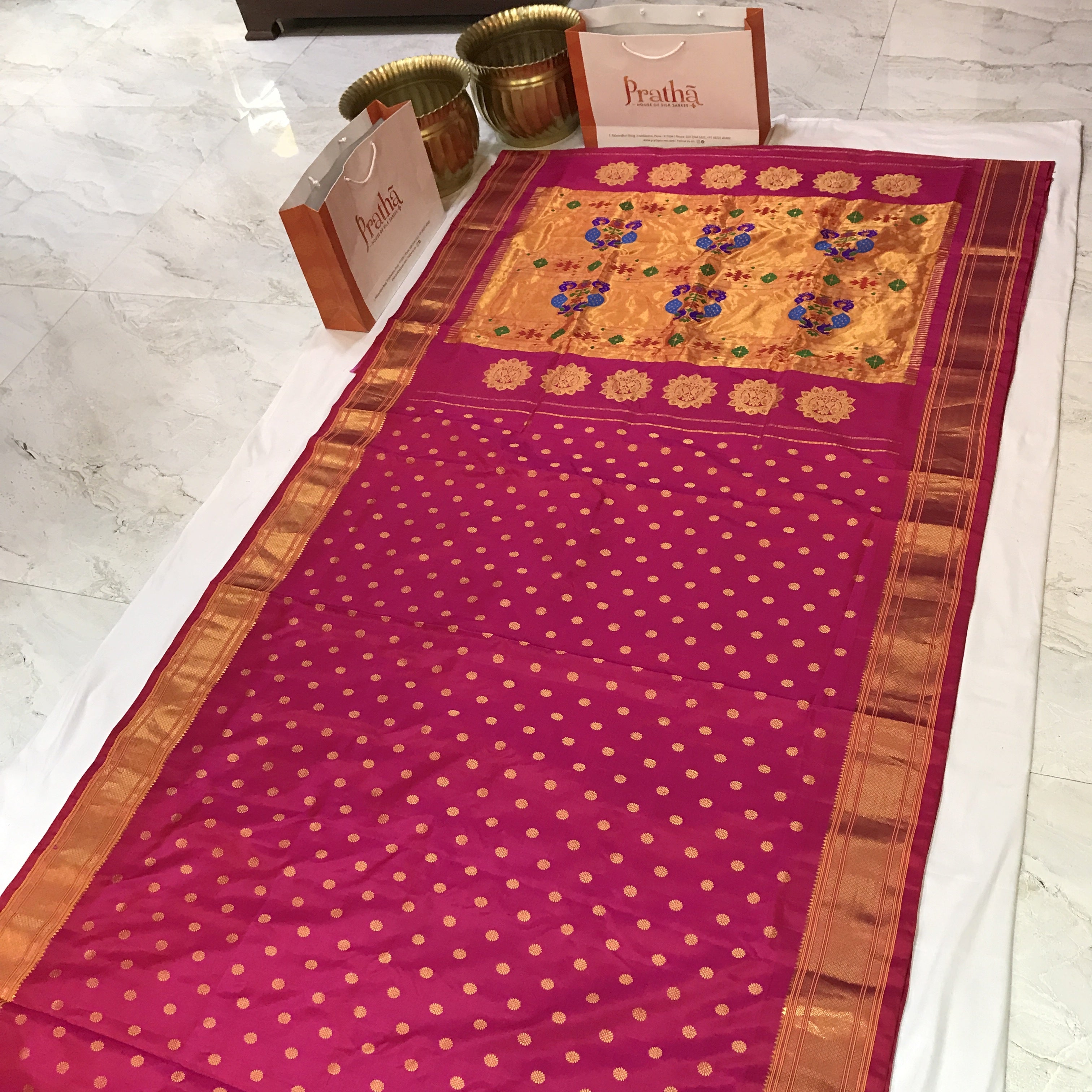 This shade of pink , a very popular and important colour in many Indian wedding traditions , in a handwoven Paithani looks great ! This stunning Paithani flaunts beautiful butti and the classic peacock ( motifs ) zari pallu . Paithani's in one single colour are sought after! Pratha happily presents these in beautiful colours.