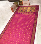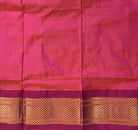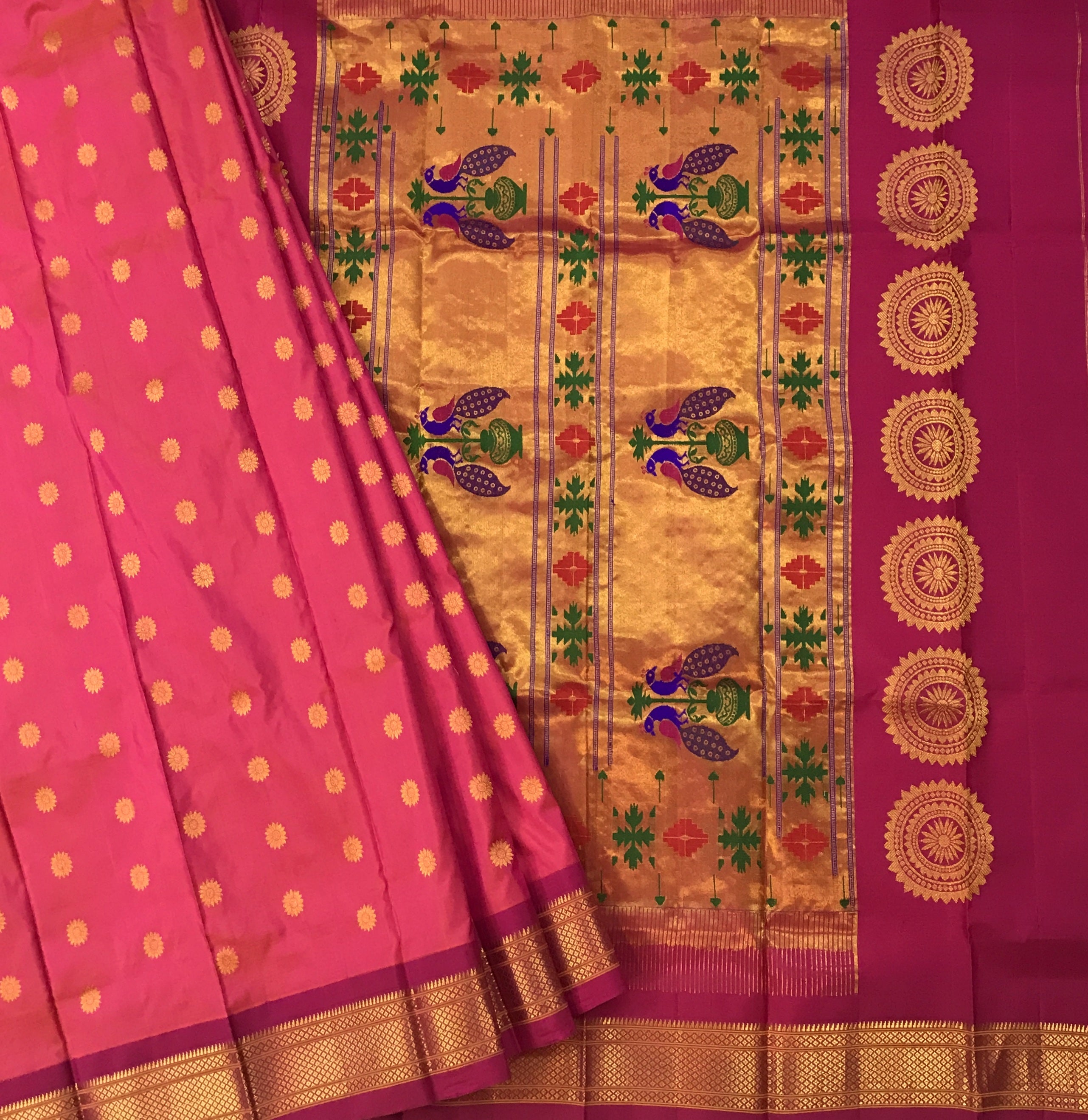 The phenomenal combination of peach pink Paithani with a very beautiful magenta border is Pratha's favorite. The delicate floral butti add the needed amount of grace which makes it perfect for any and every special occasion of yours!