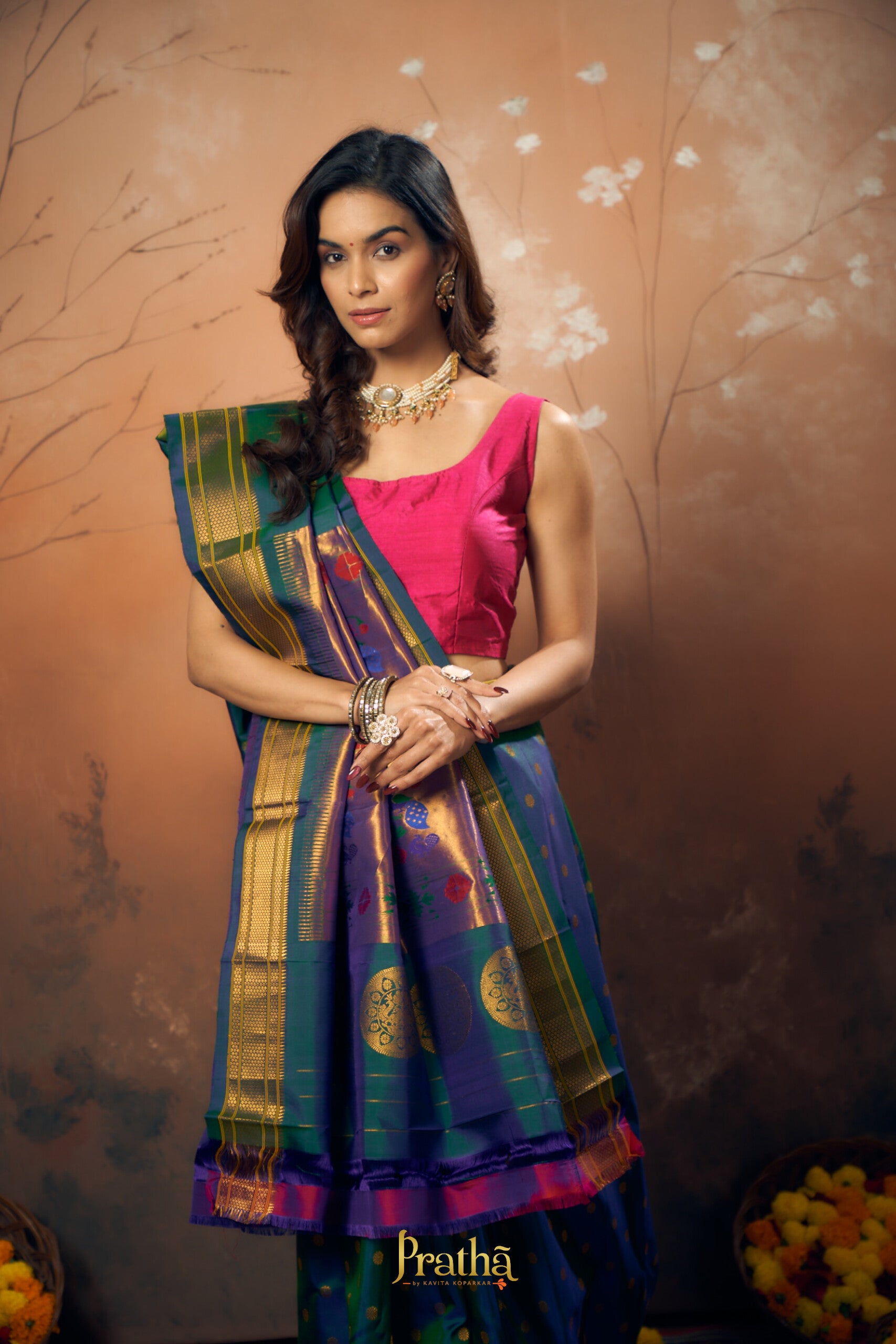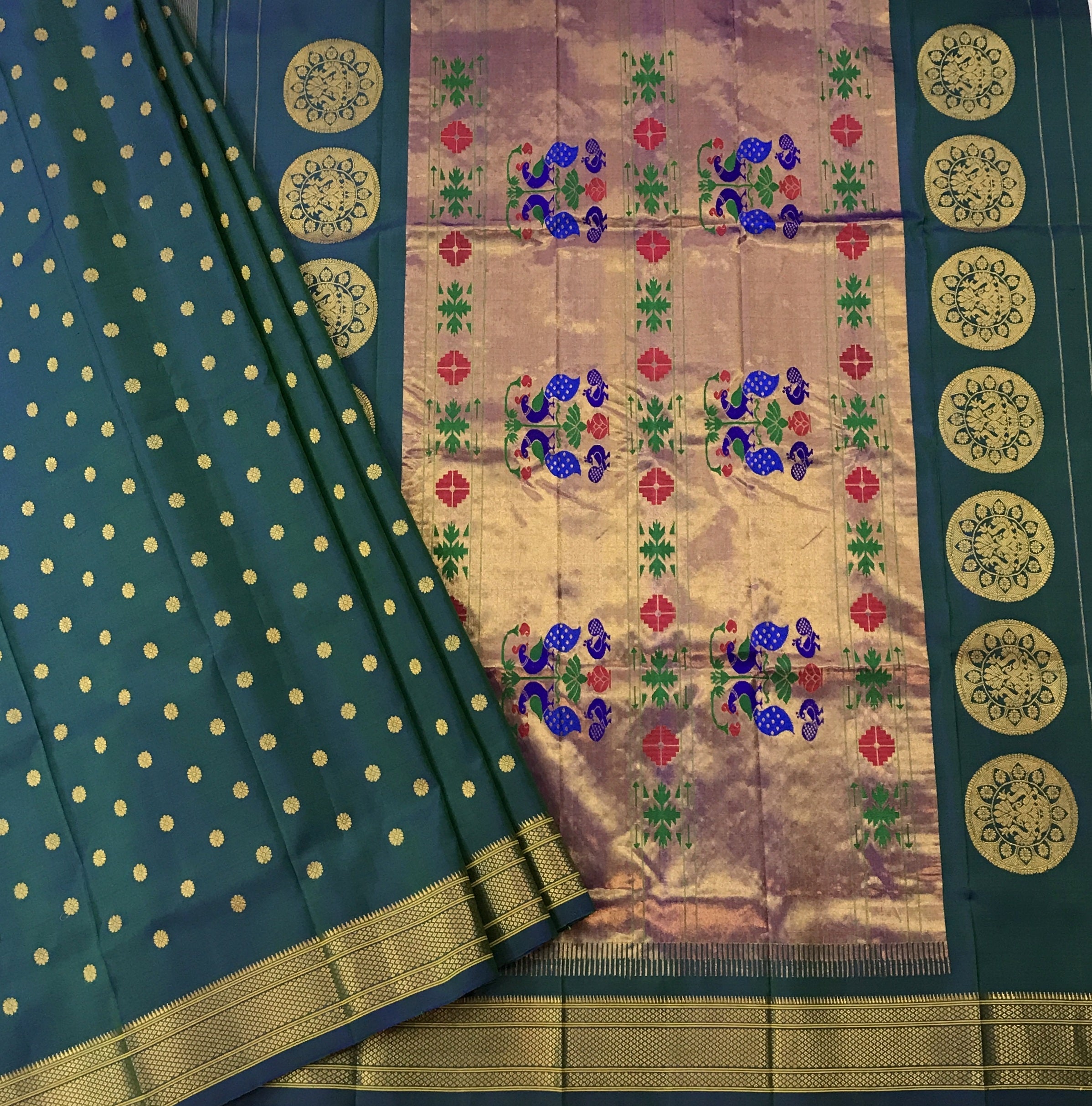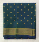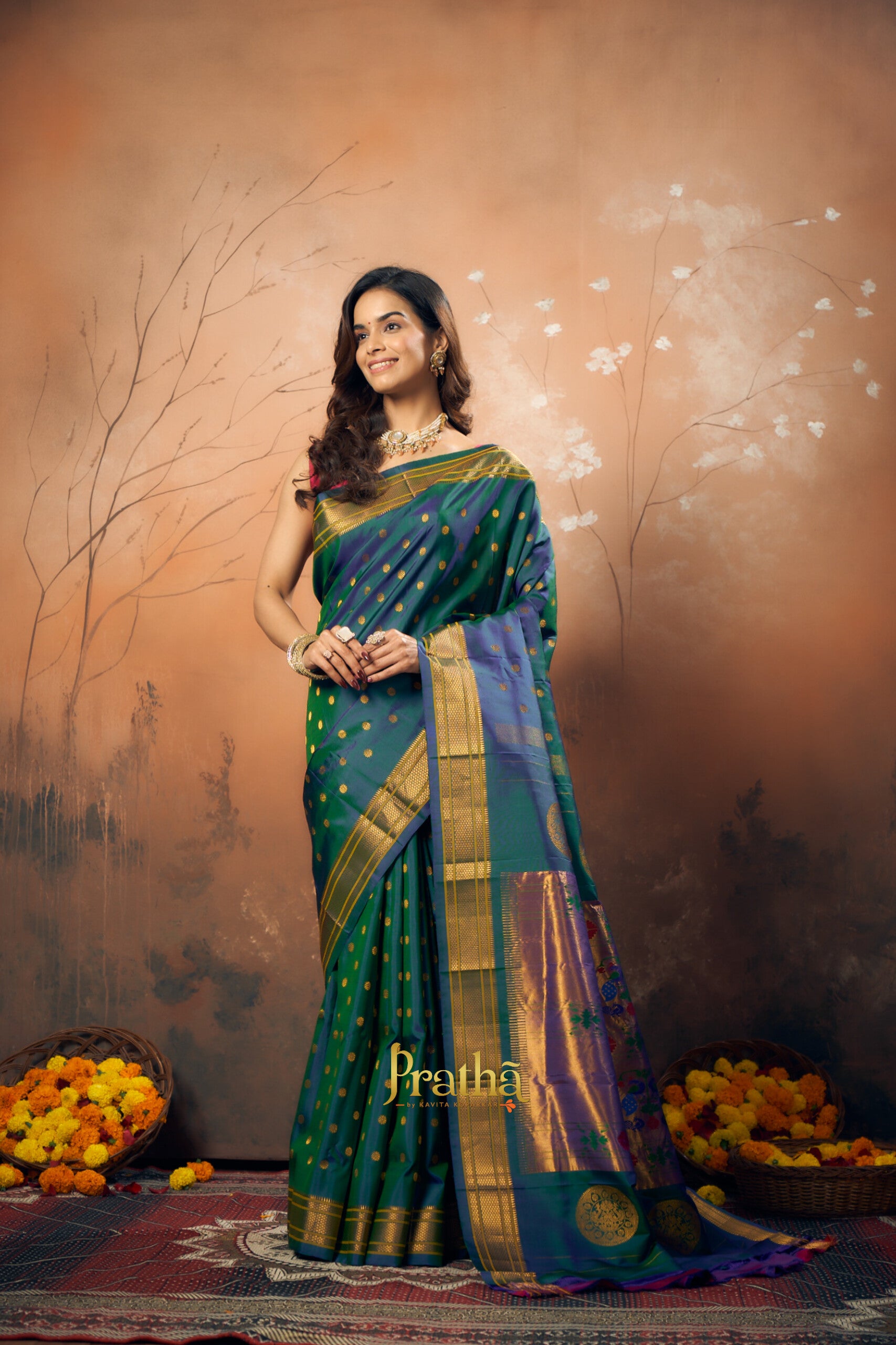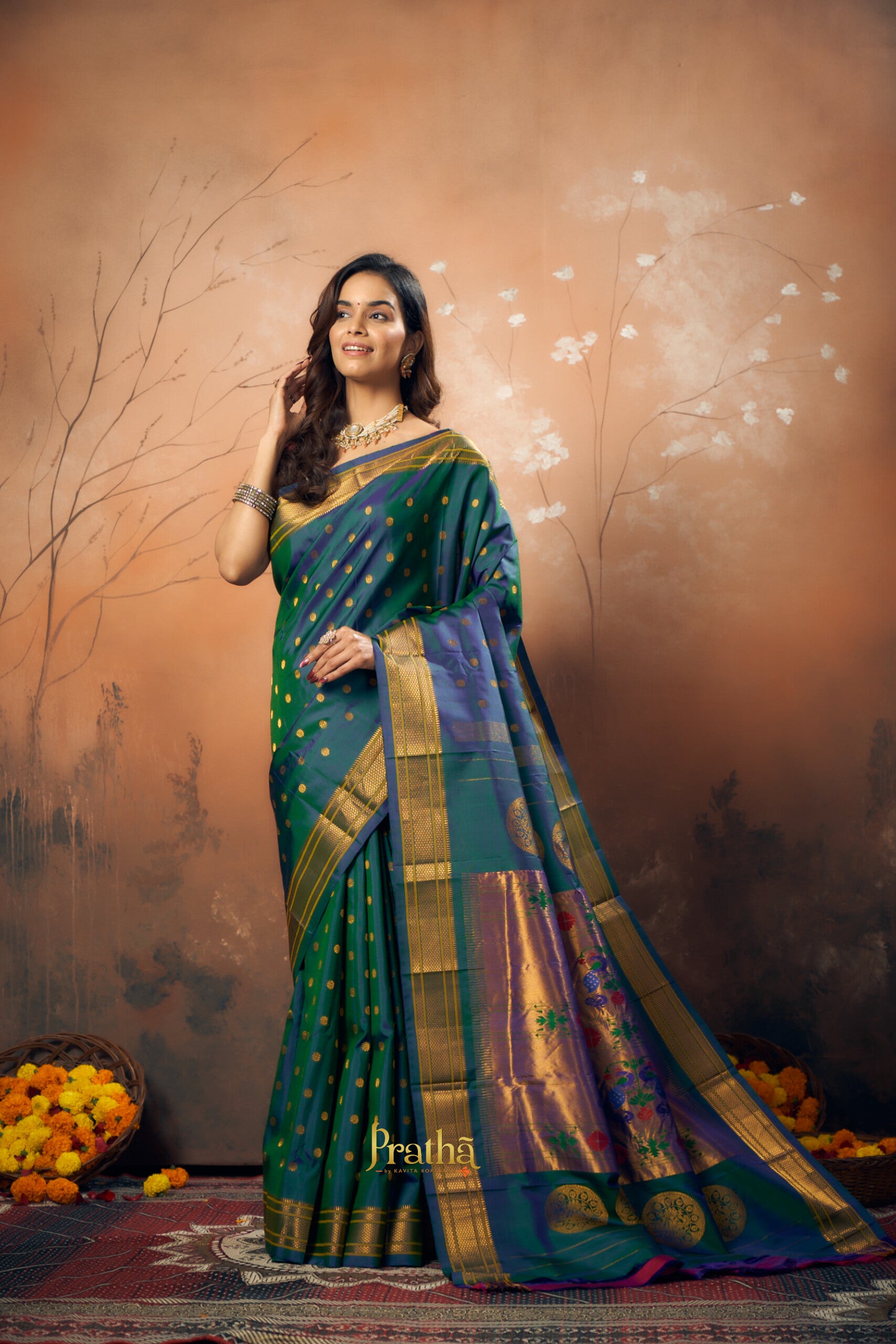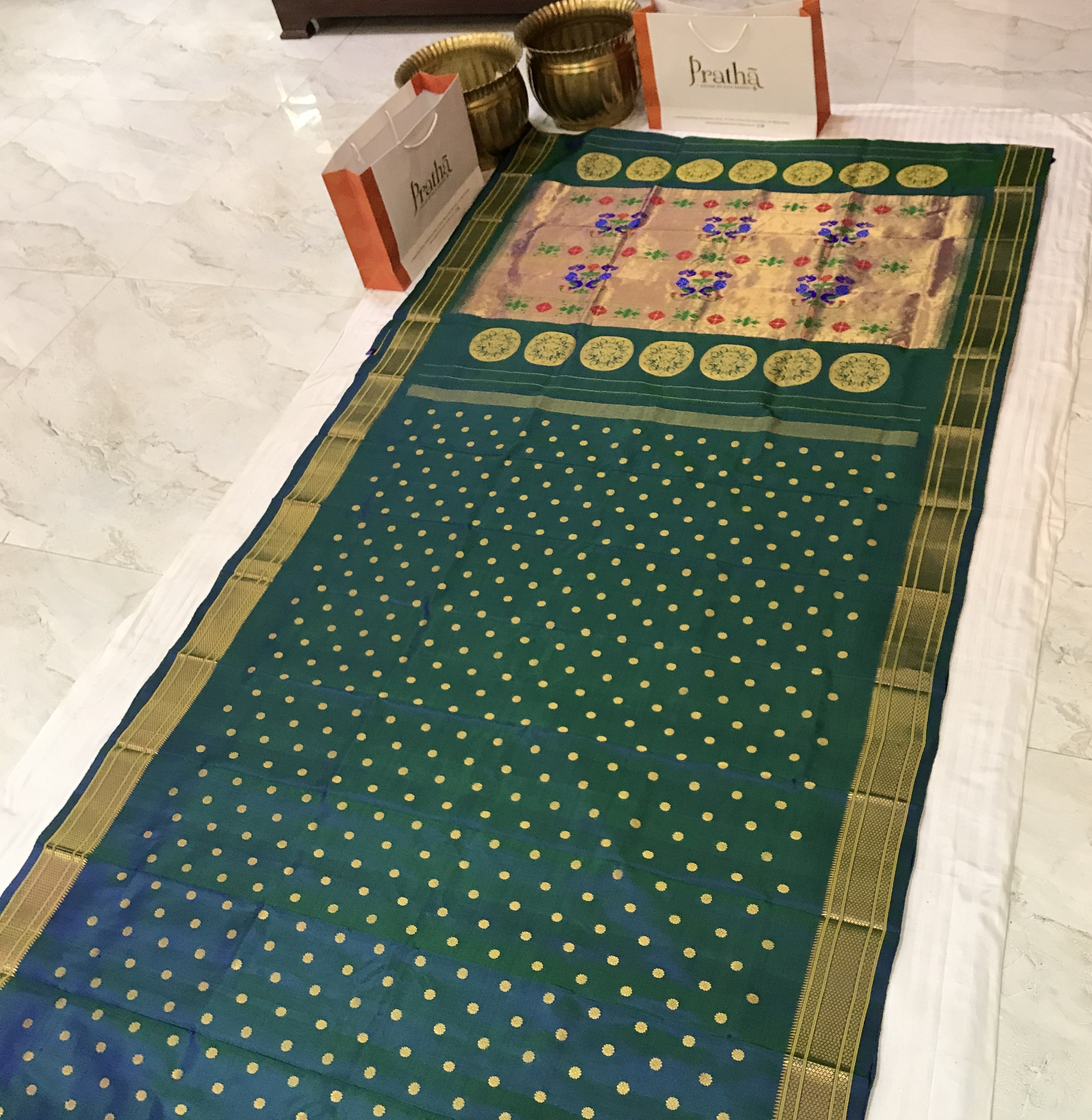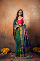 This shade of peacock, a very popular and important colour in many Indian wedding traditions , in a handwoven Paithani looks great ! This stunning Paithani flaunts beautiful butti and the classic peacock ( motifs ) zari pallu . Paithani's in one single colour are sought after! Pratha happily presents these in beautiful colours.