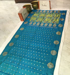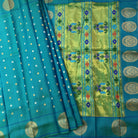 A stunning Paithani that blends tradition with vibrant elegance! The rich turquoise-blue body is adorned with delicate golden polka buttis, giving it a graceful and festive charm. The highlight of this saree is its captivating contrast pallu in a radiant shade of golden green, intricately woven with colourful Paithani motifs of peacocks and floral vines — a signature that adds grandeur and beauty. The broad zari border with traditional circular motifs enriches the look, making this saree a showstopper for weddings, cultural ceremonies, and festive occasions.