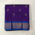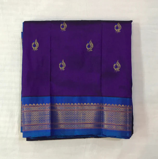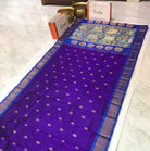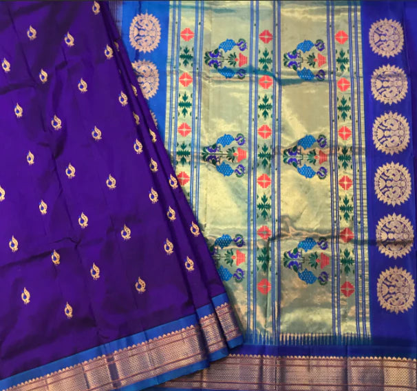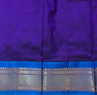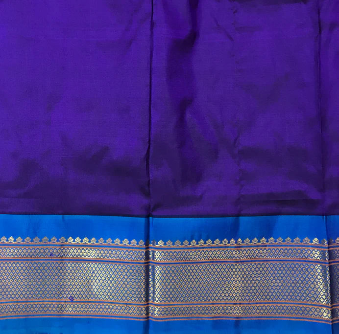 A supreme Paithani weave, in this stunning, beautiful shade of purplish blue is a treat to your eyes! This, with a beautiful shade of bright blue contrast looks incomparable! Do not miss the peacock butti highlighted in blue silk thread throughout this Paithani! The traditional tissue pallu with elaborate peacock motifs looks graceful. This is a perfect pick for those who are looking for a unique Paithani to add their collections!