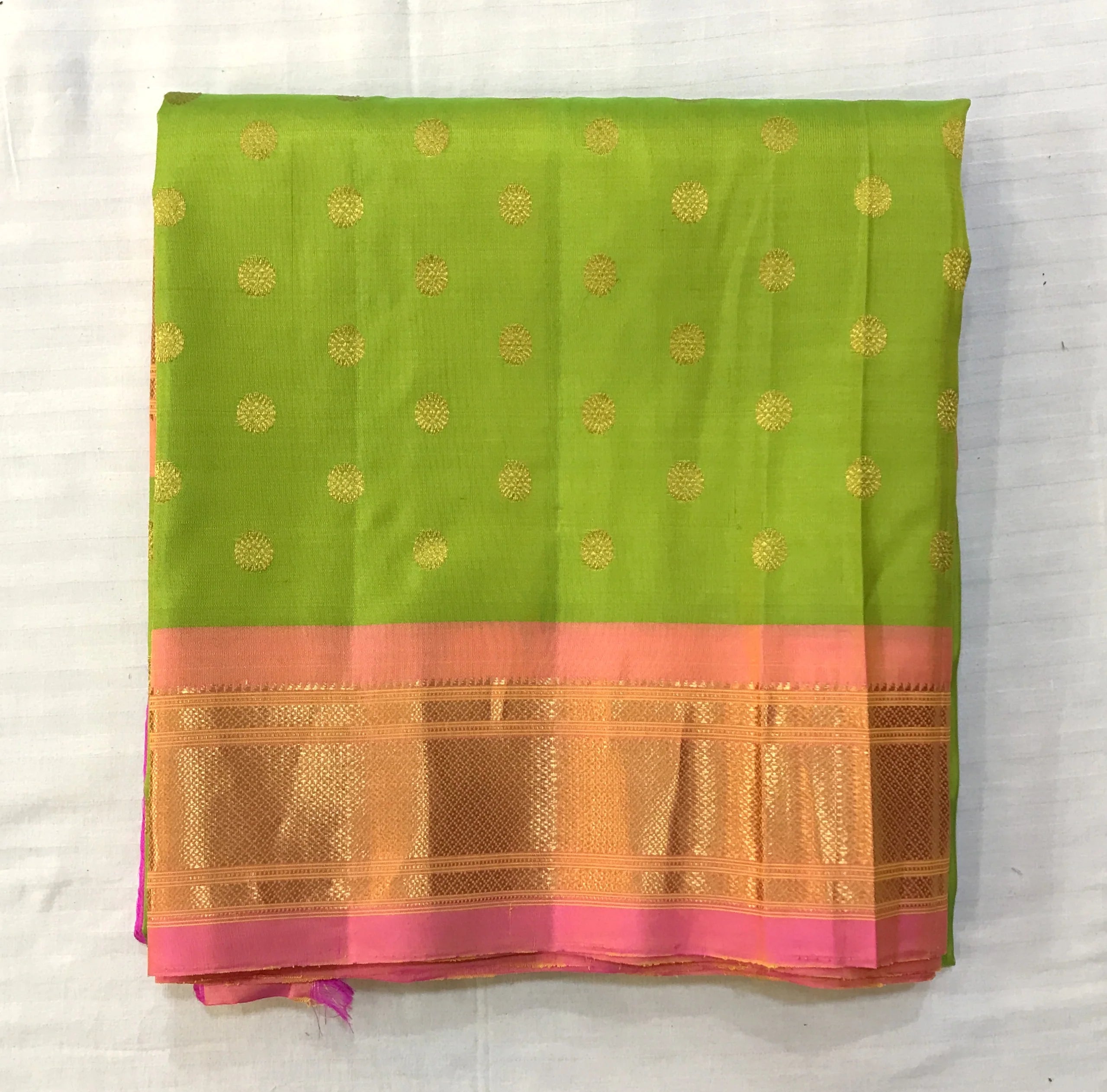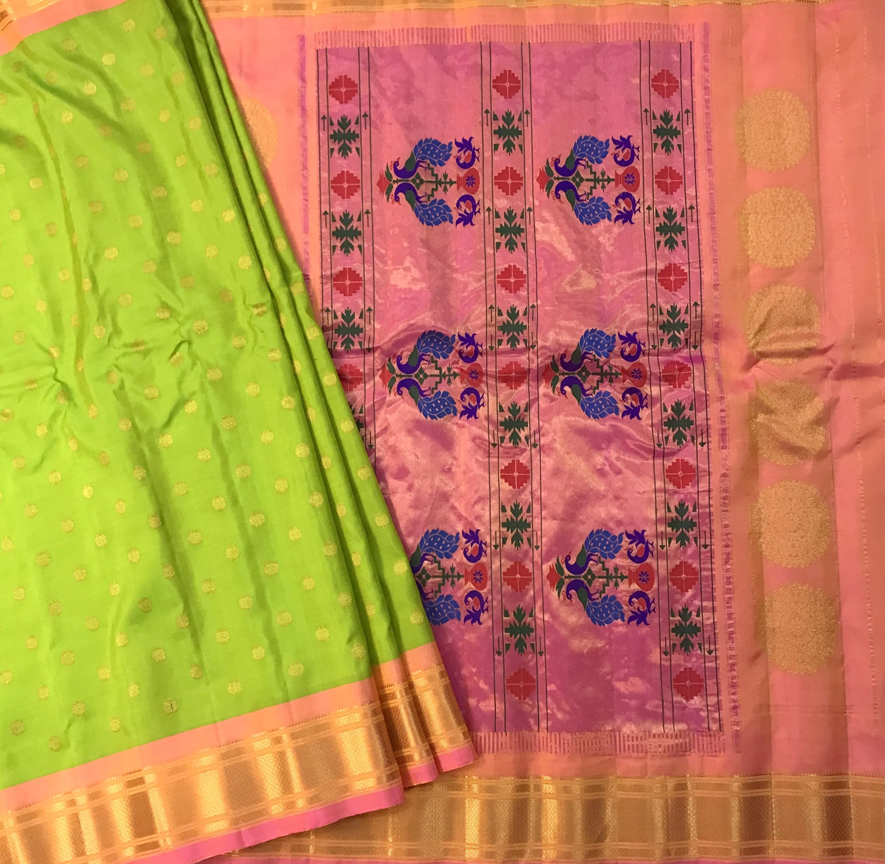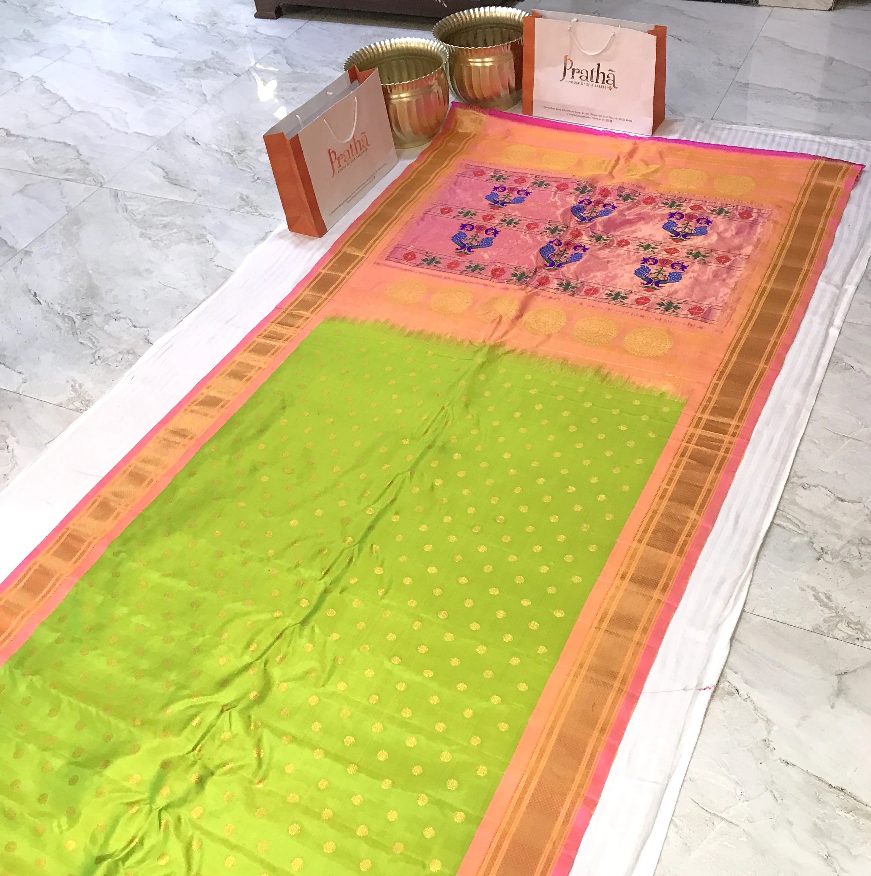 The phenomenal combination of Parrot green Paithani with a very beautiful light peach pink border is Pratha's favorite. The delicate flower butti add the needed amount of grace which makes it perfect for any and every special occasion of yours!