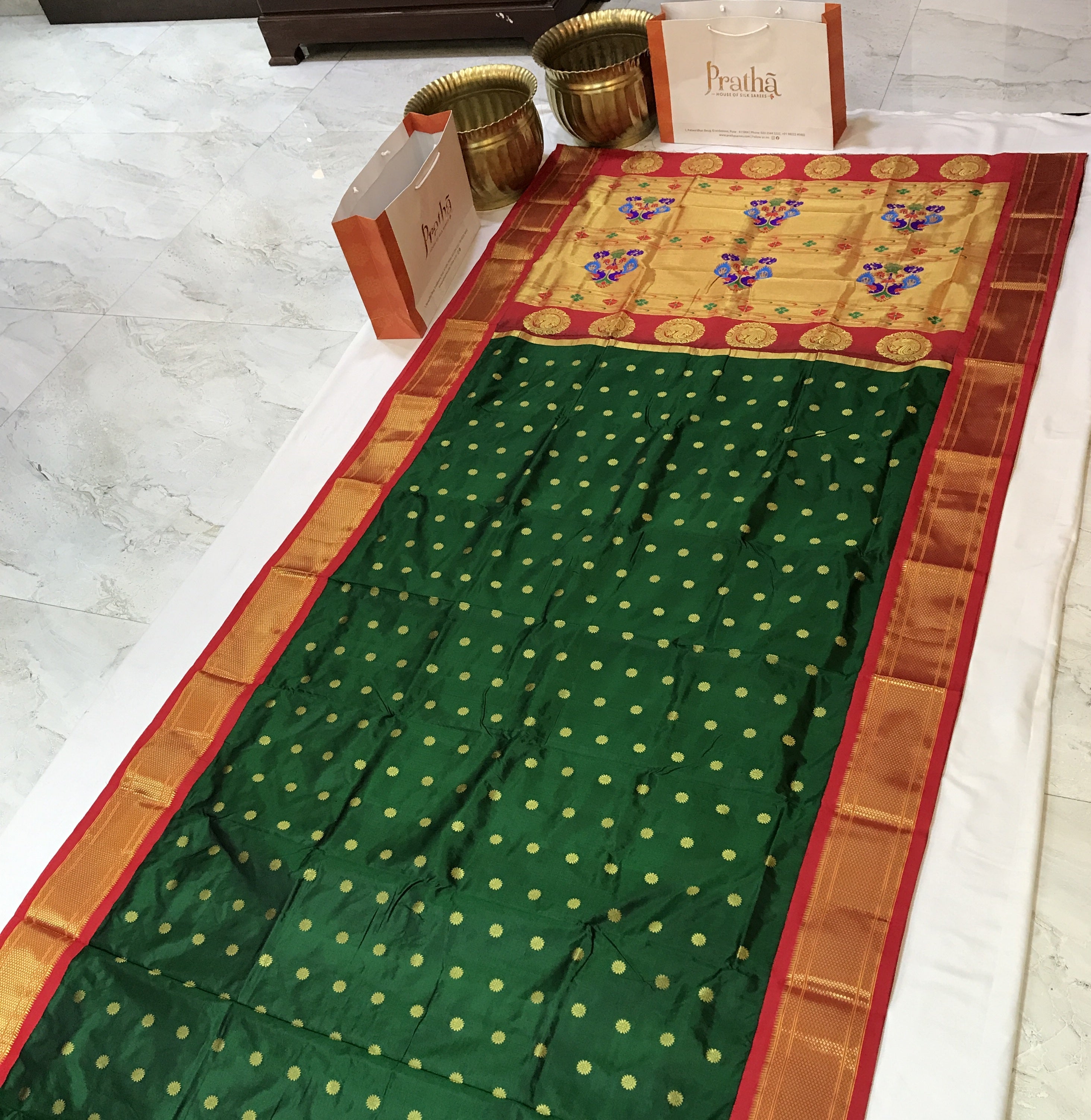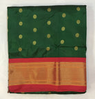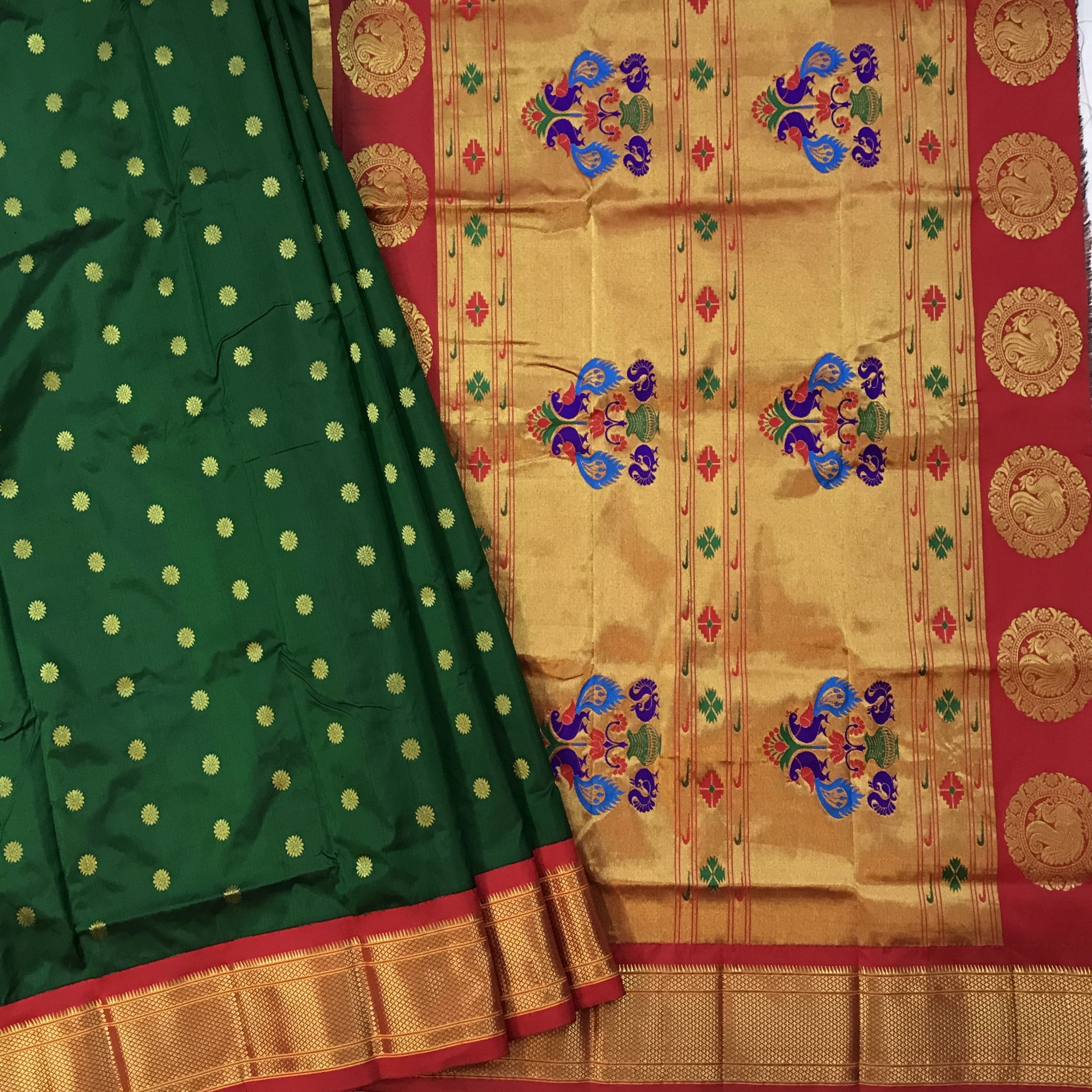 A classy bottle green coloured power loom Paithani, with its added class by the intricate floral buttis(motifs), is a piece of grandeur. The contrast created with the red border and an golden zari pallu looks ethereal. This saree works wonders for any occasion! Do not miss the peacock ( motifs ) design pallu highlighted in multicolored silk thread throughout this Paithani.