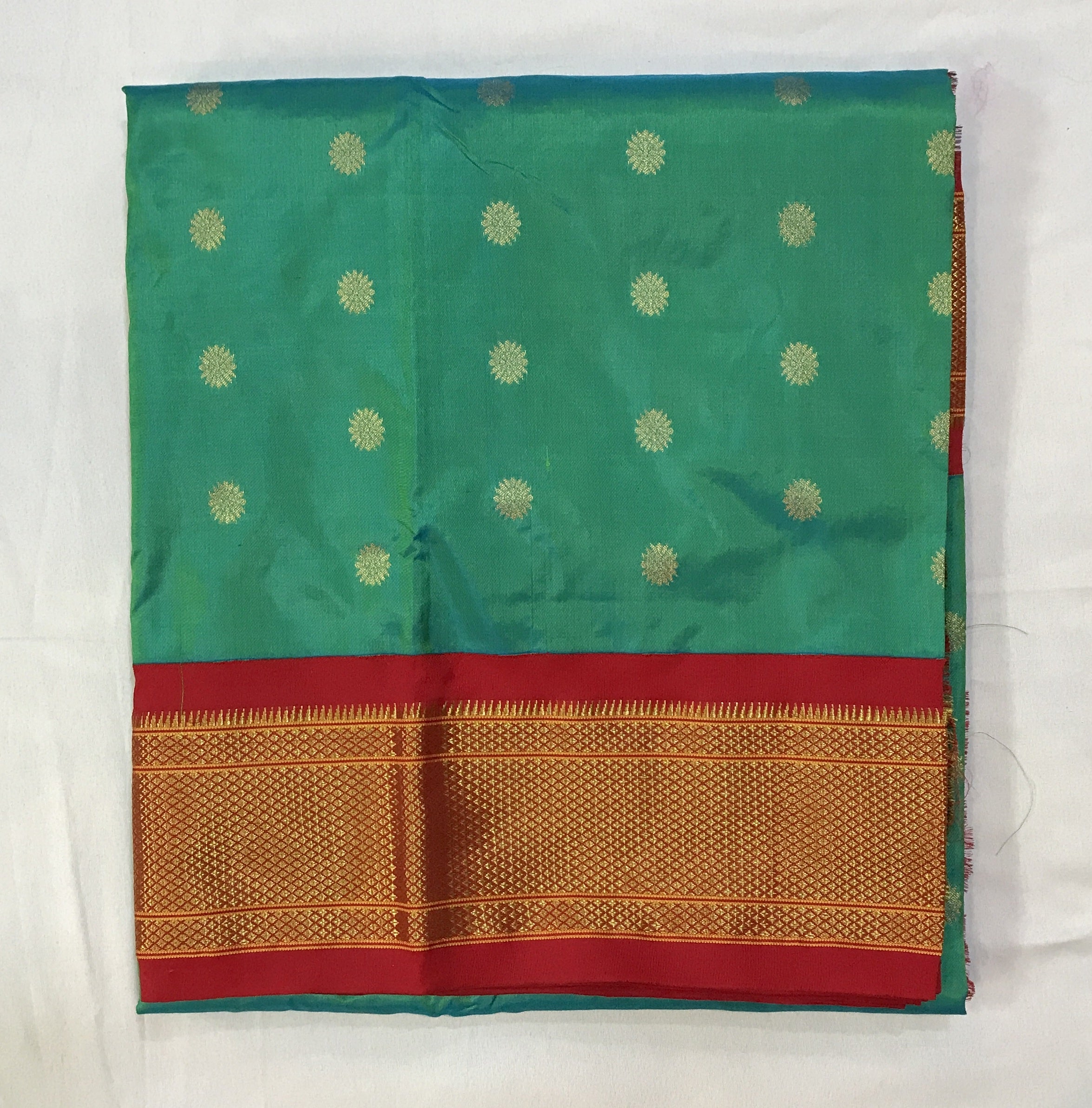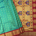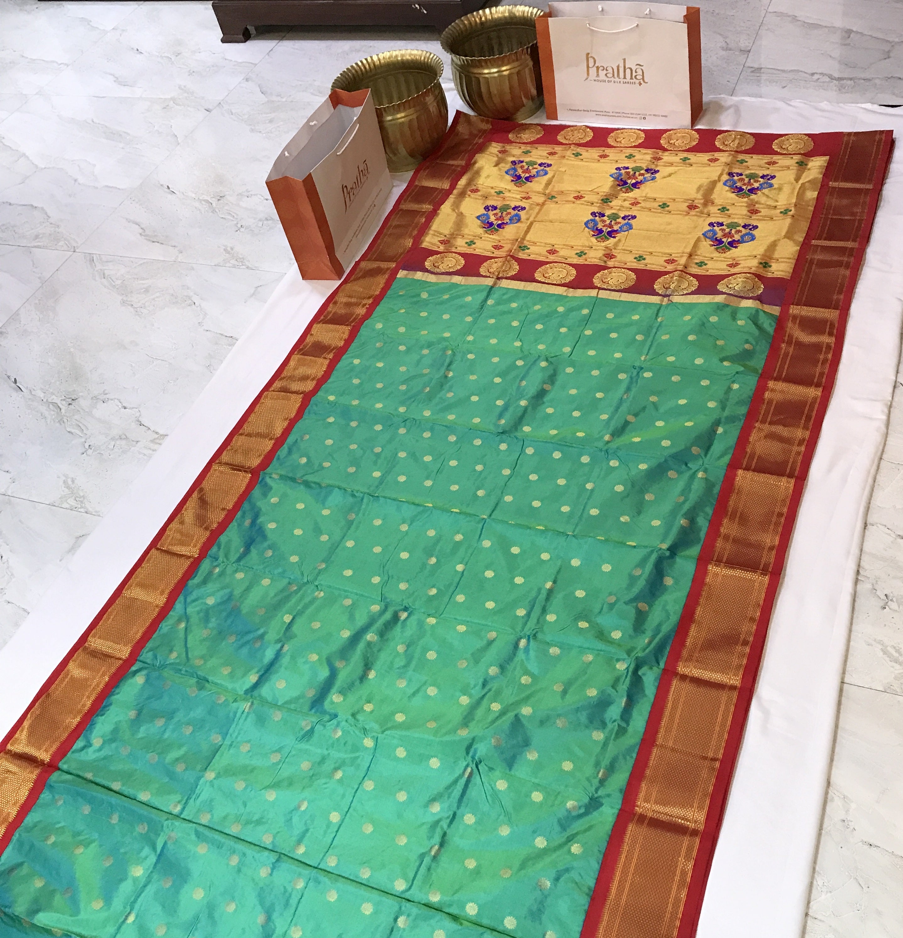 This fresh shade of green, in excellent pure silk saree with the most amazing red coloured golden zari border is a classy combination for power loom Paithani. This stunning Paithani flaunts beautiful floral butti ( motifs) of golden zari and beautiful golden zari pallu with peacock motifs add grace to this festive saree. Pratha happily presents these in beautiful colours.