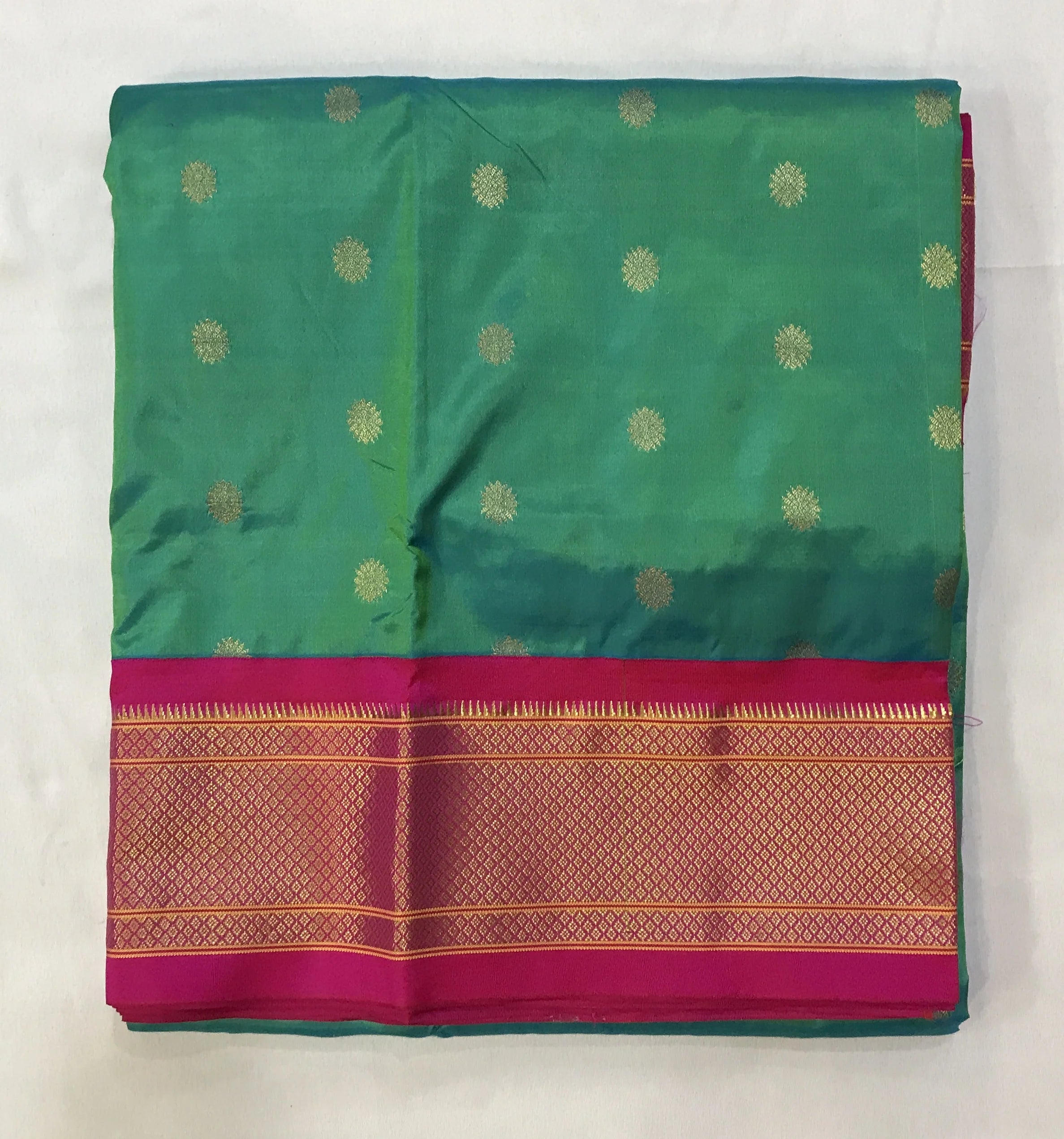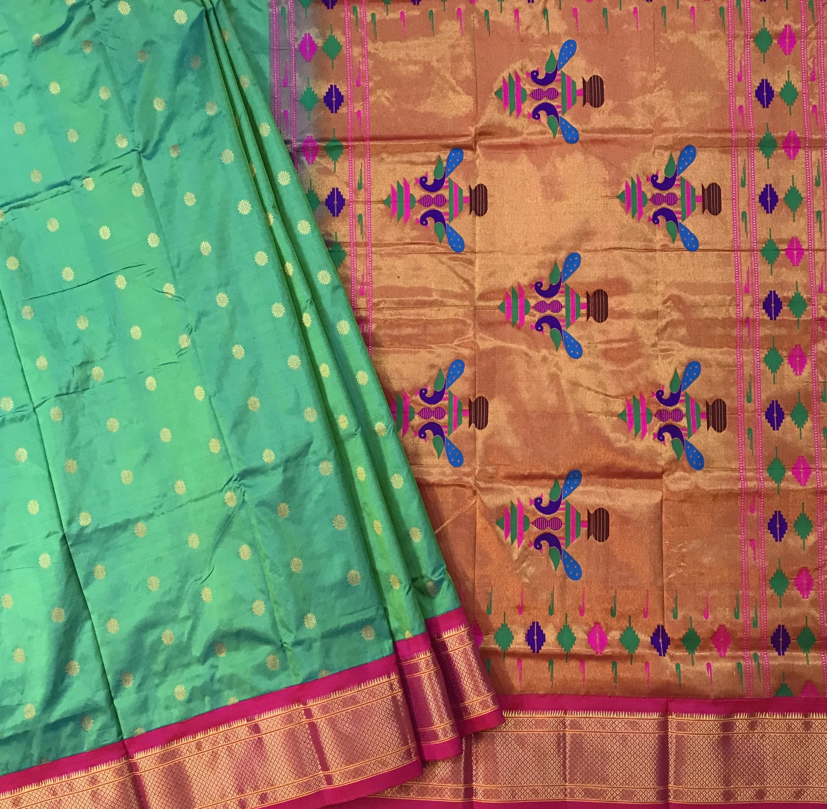 This fresh shade of green, in excellent pure silk saree with the most amazing pink coloured golden zari border is a classy combination for power loom Paithani. This stunning Paithani flaunts beautiful floral butti ( motifs) of golden zari and beautiful golden zari pallu with peacock motifs add grace to this festive saree. Pratha happily presents these in beautiful colours.