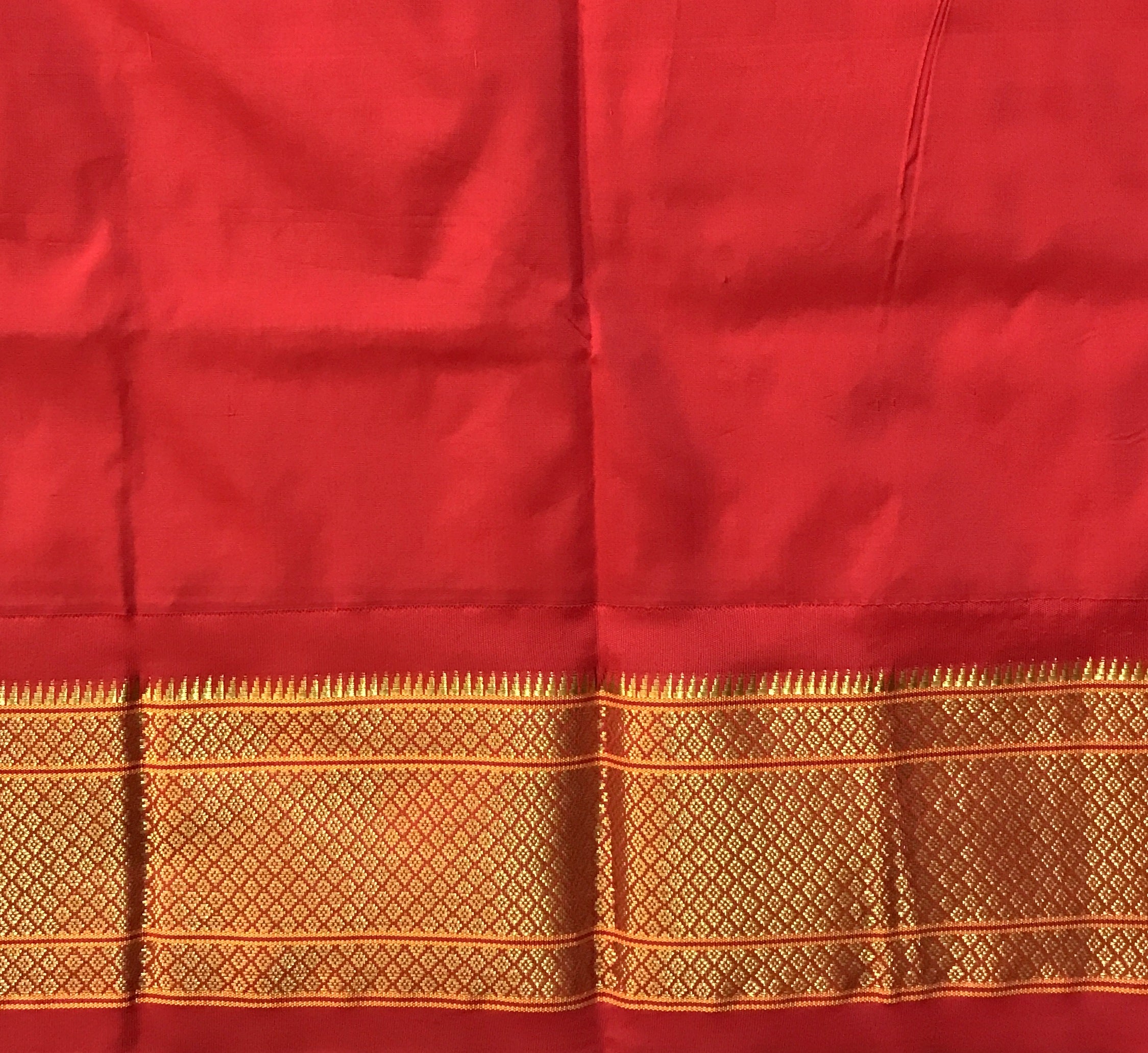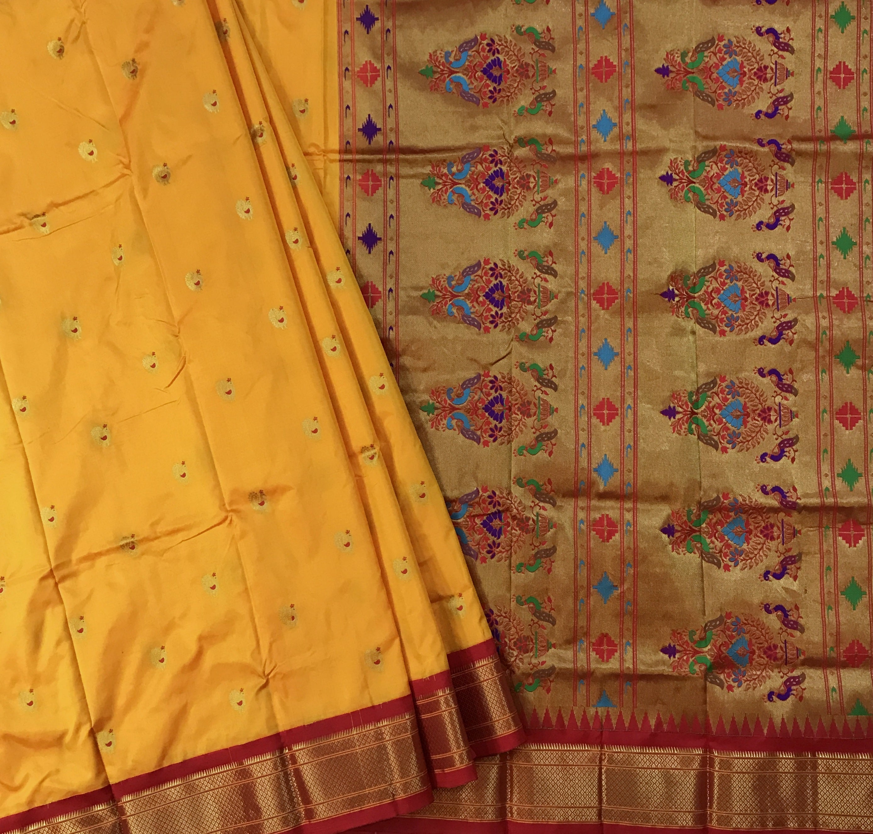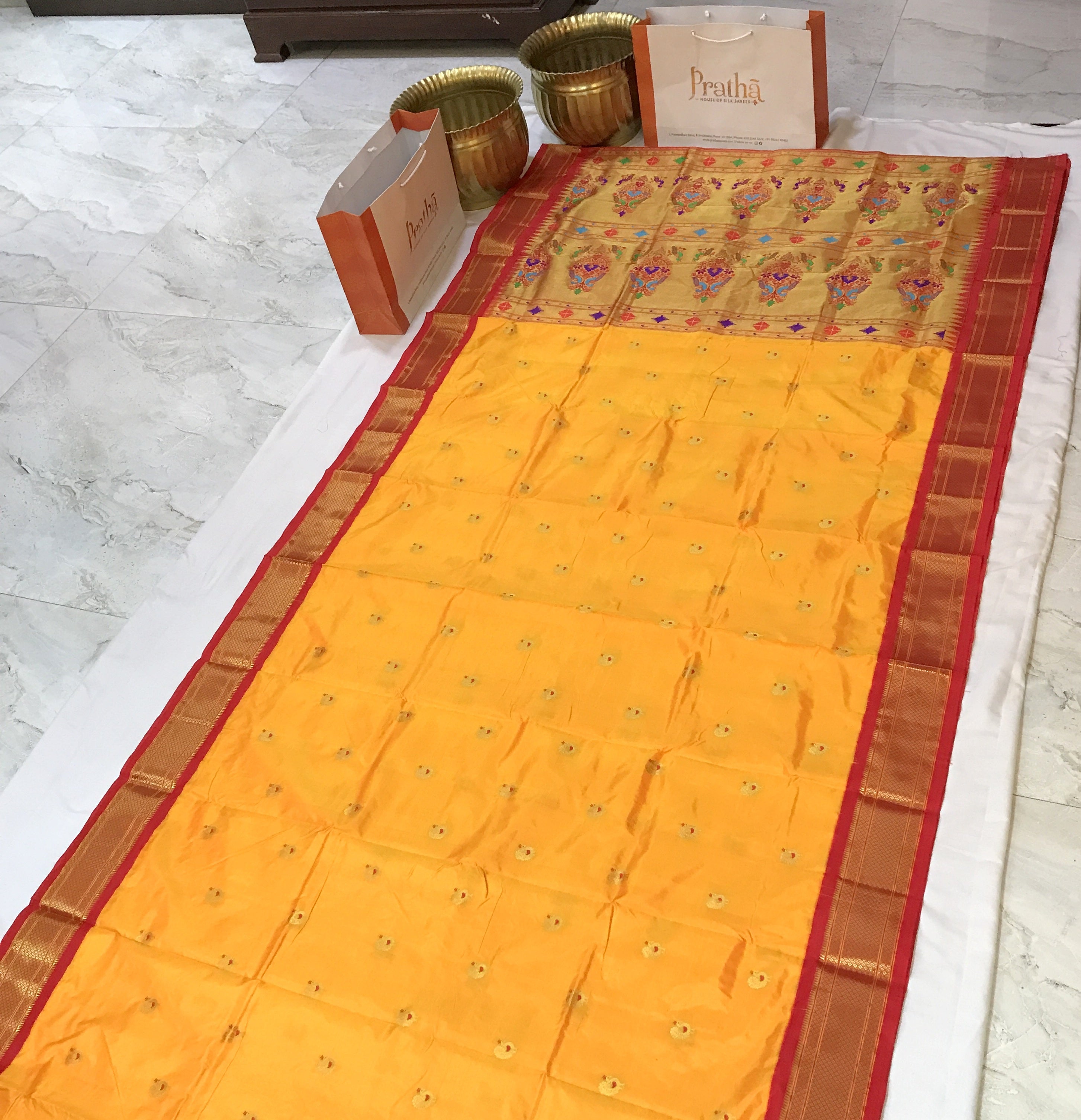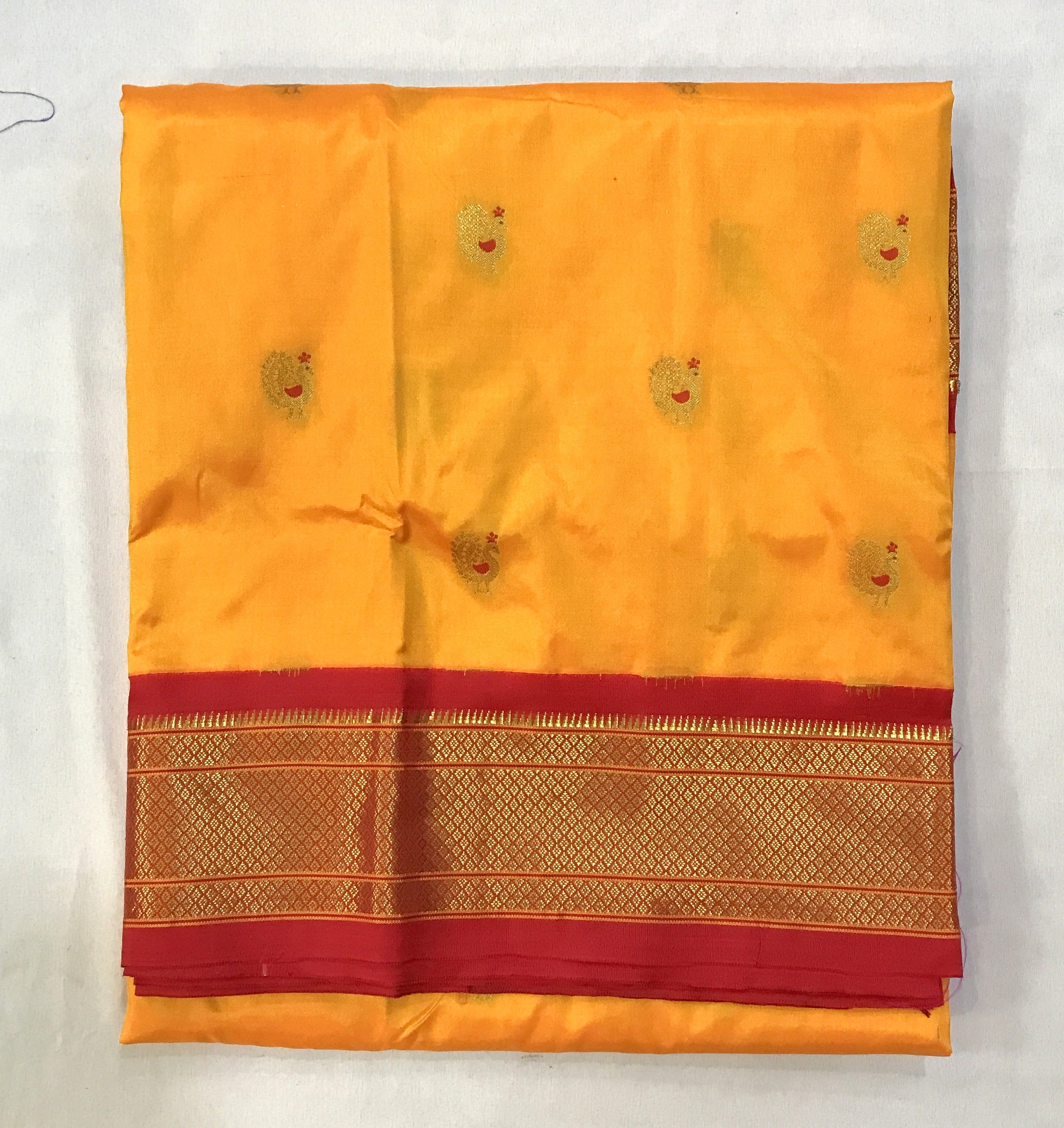 A very beautiful shade of mango yellow. This stunning excellent pure silk power loom Paithani with red coloured golden zari border is just class apart! The finely spread floral butti and its traditional pallu just stand true to its roots!