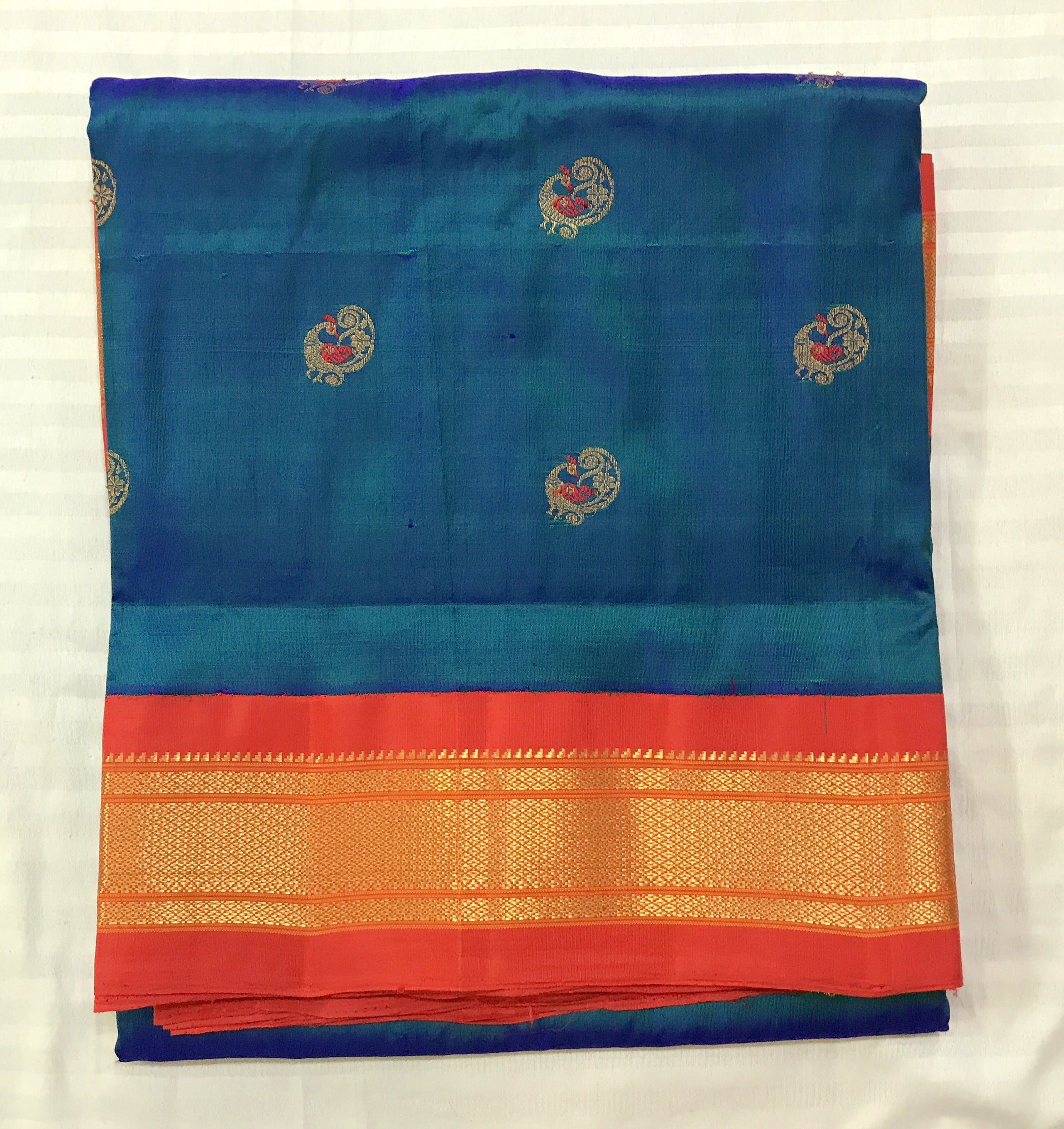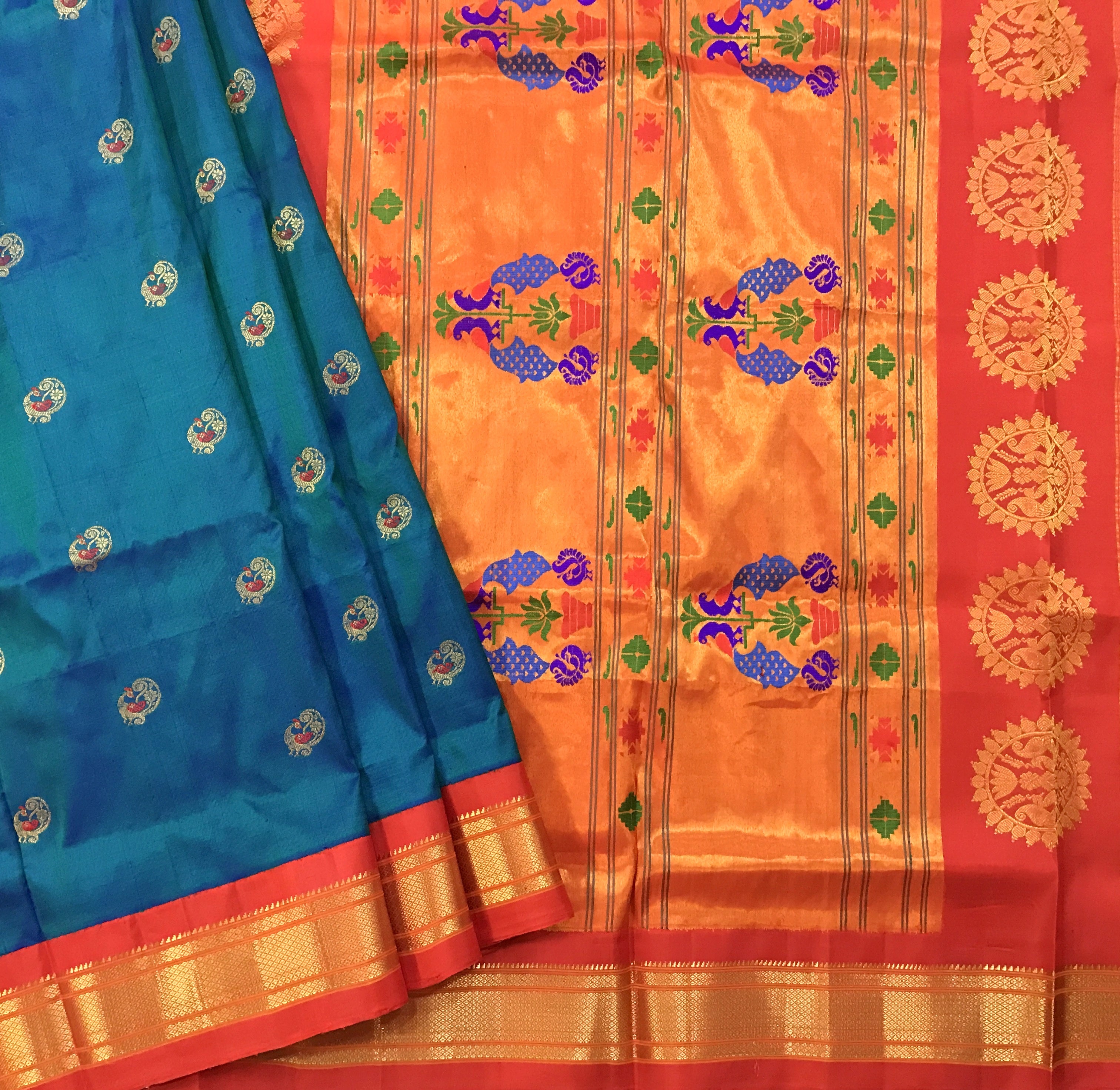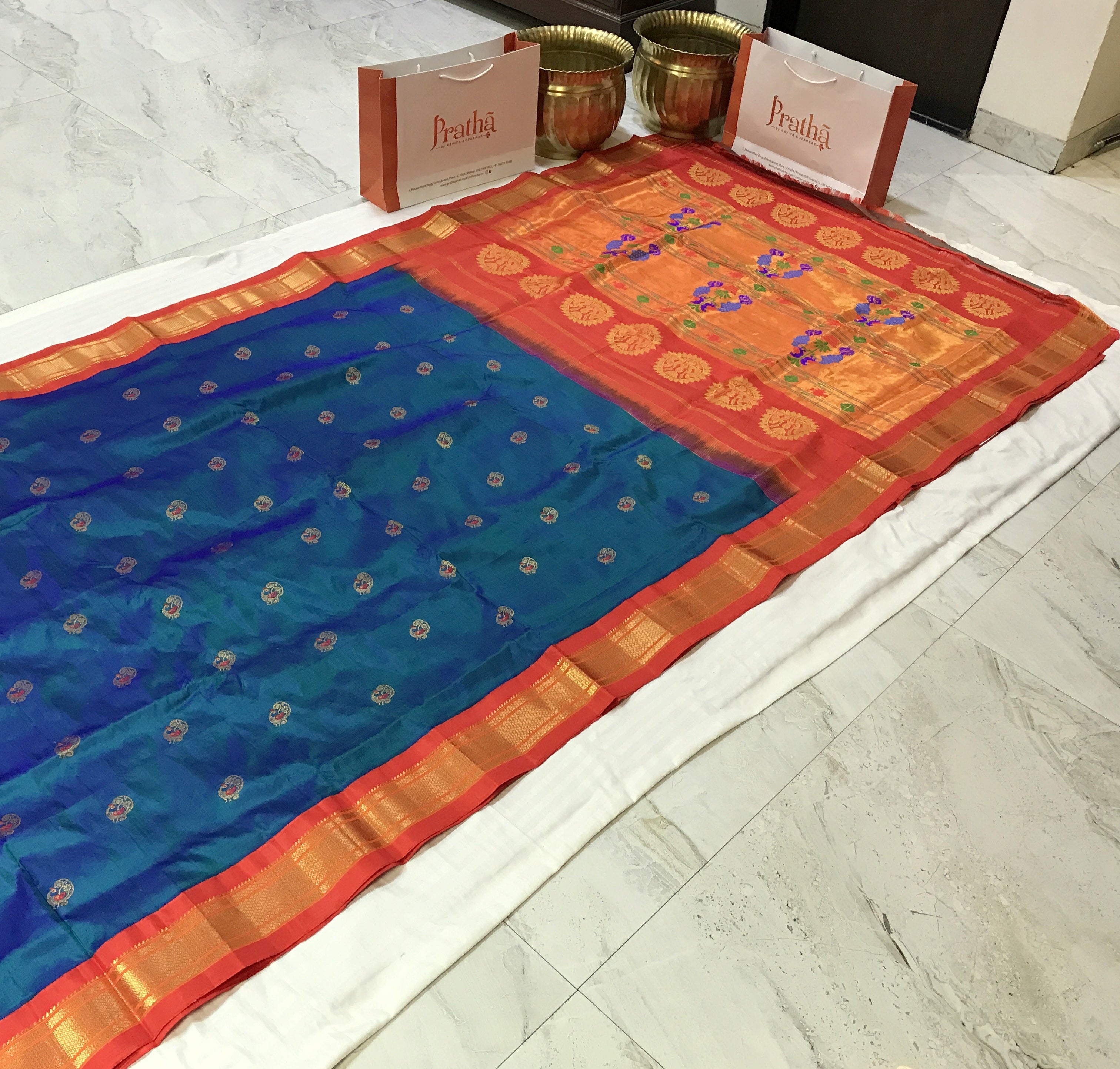 This is an extremely outstanding shade which is a beautiful mix of peacock. This Paithani is an incredible weave! This colour always wins hearts especially when it teams up with a beautiful fresh red at its border and pallu. This classic tissue pallu of this saree stands true to the Paithani tradition. Delicate peacock butti highlighted with red silk adds to the beauty of this weave.