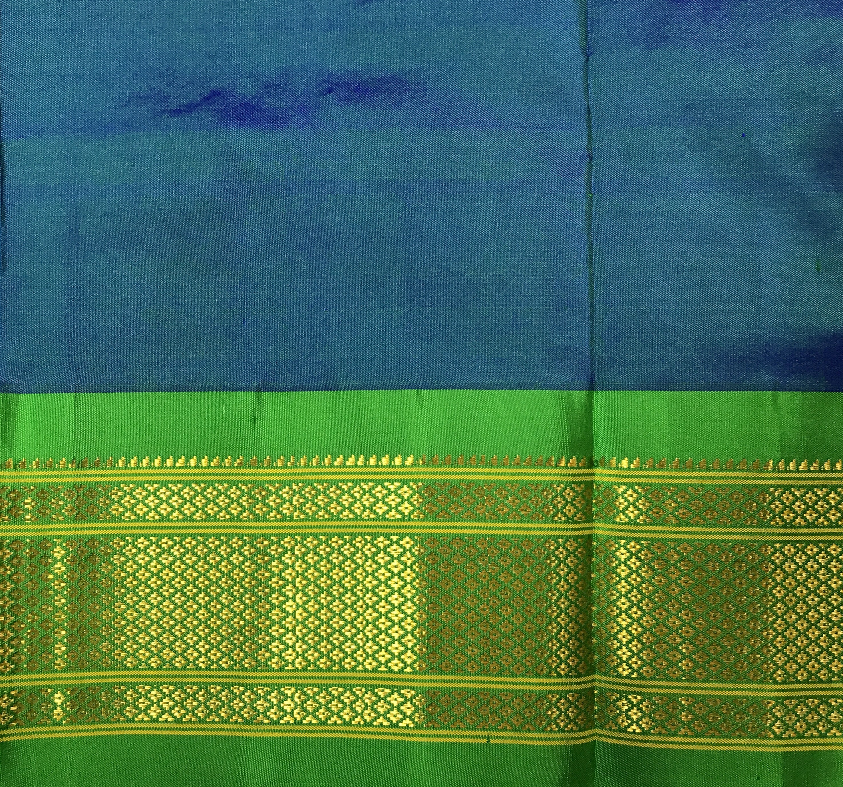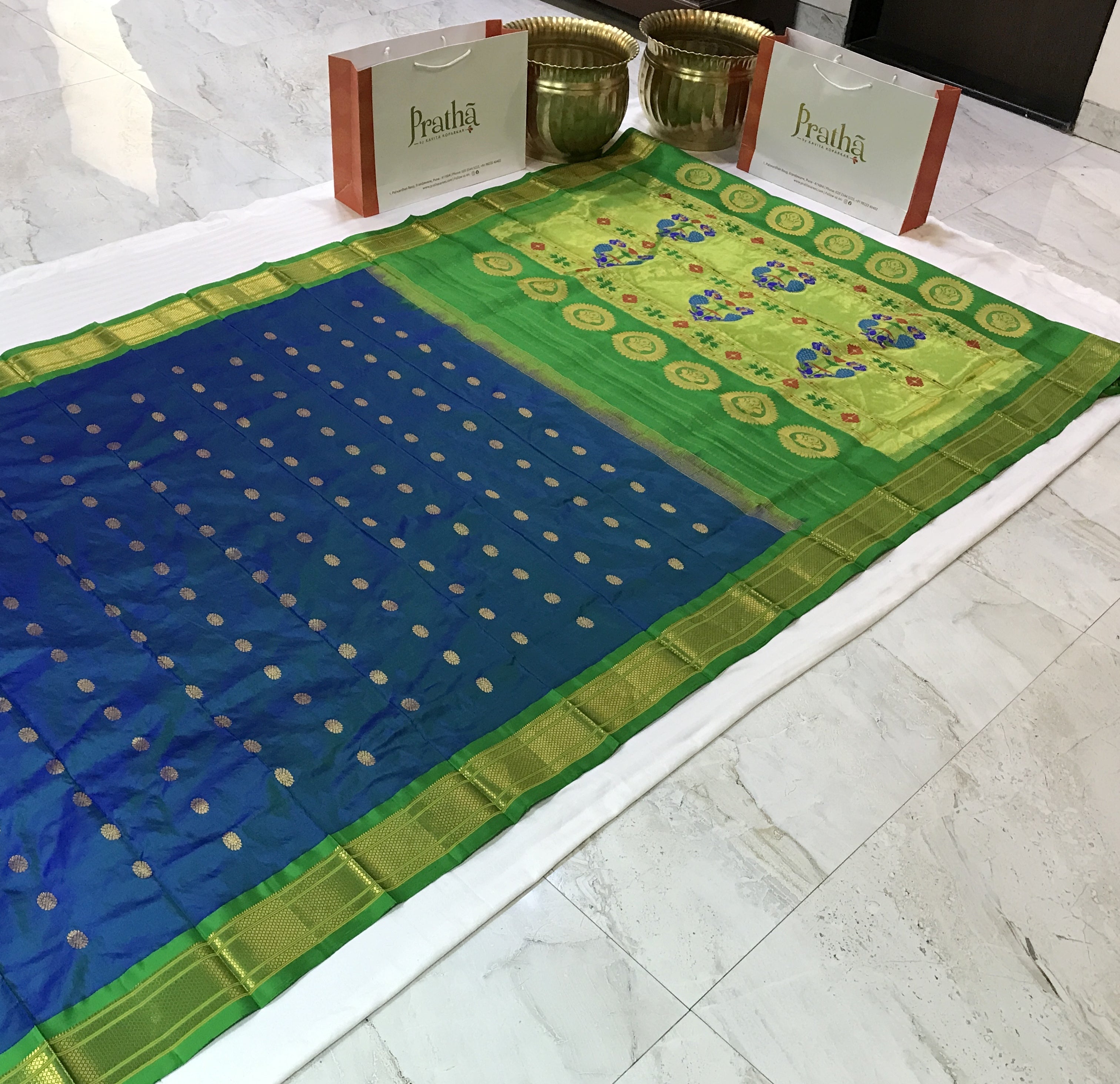 This weave is a stunner with its peacock blue Paithani with a complementing fresh green border. This Paithani has floral butti all over with a traditional border, a perfect balance of classic and unusual. This is one of Pratha's favorite!