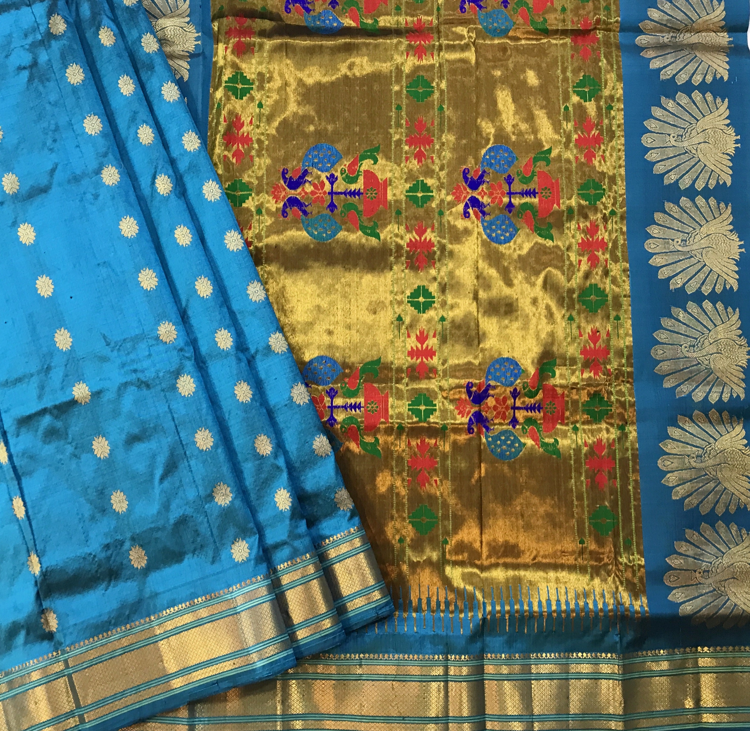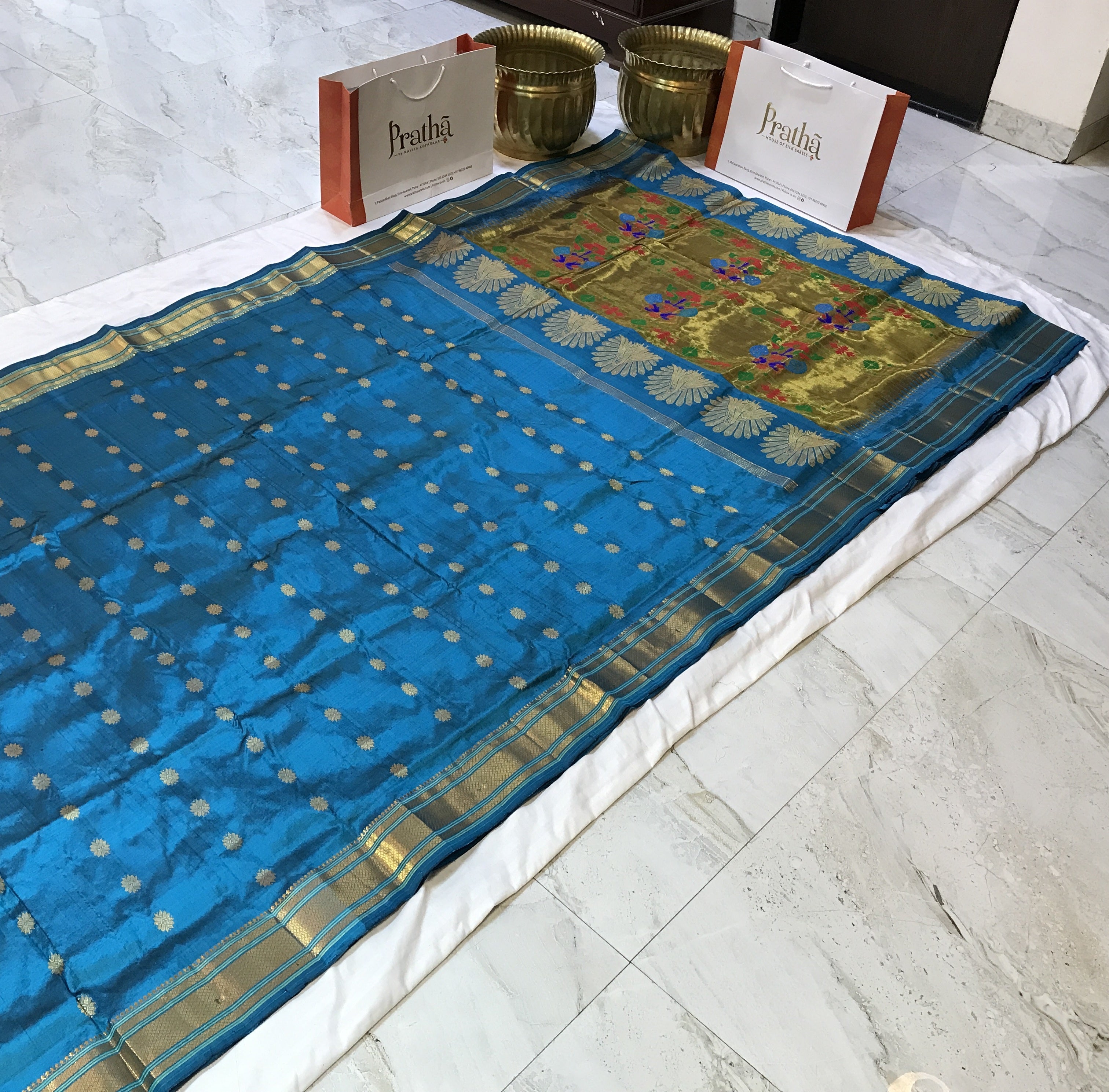 A very pretty shade of blue, in pure silk with the most amazing golden zari border is a classy combination for power loom Paithani. This stunning Paithani flaunts beautiful floral butti ( motifs) of golden zari thread and charming golden zari pallu with peacock motifs add grace to this festive saree. Pratha happily presents these in beautiful colours.
