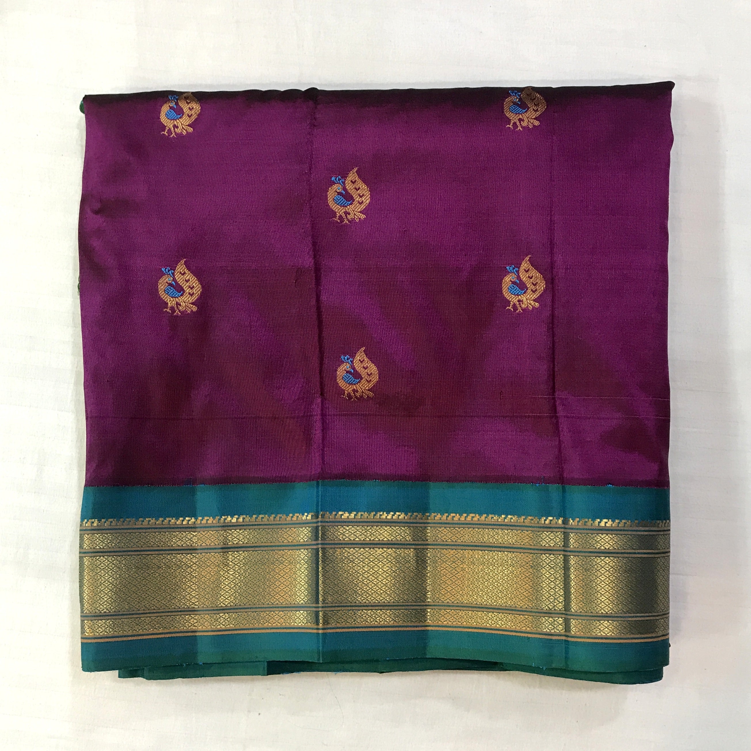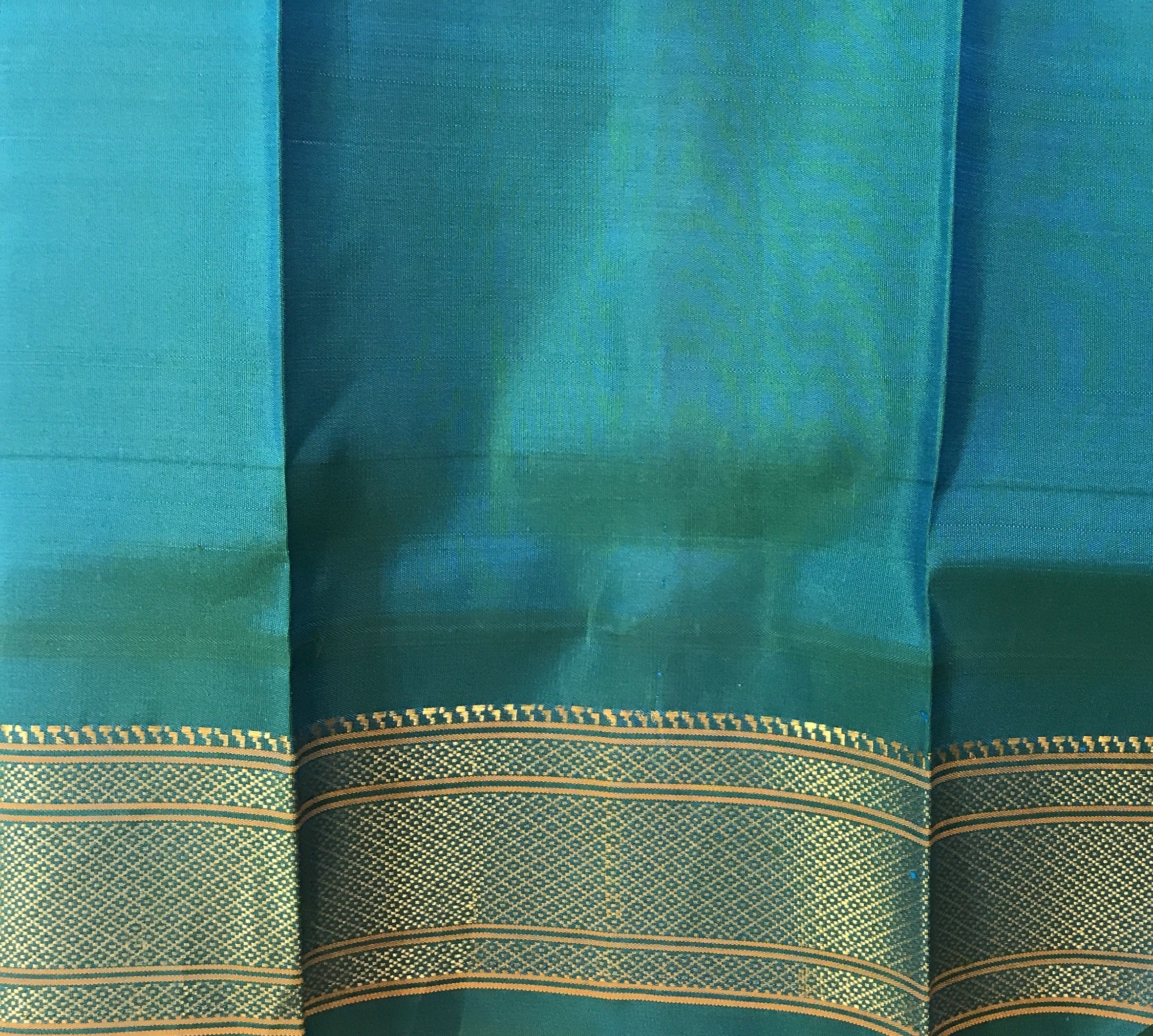 Blouse Colour: Contrast ( Peacock with golden zari border )