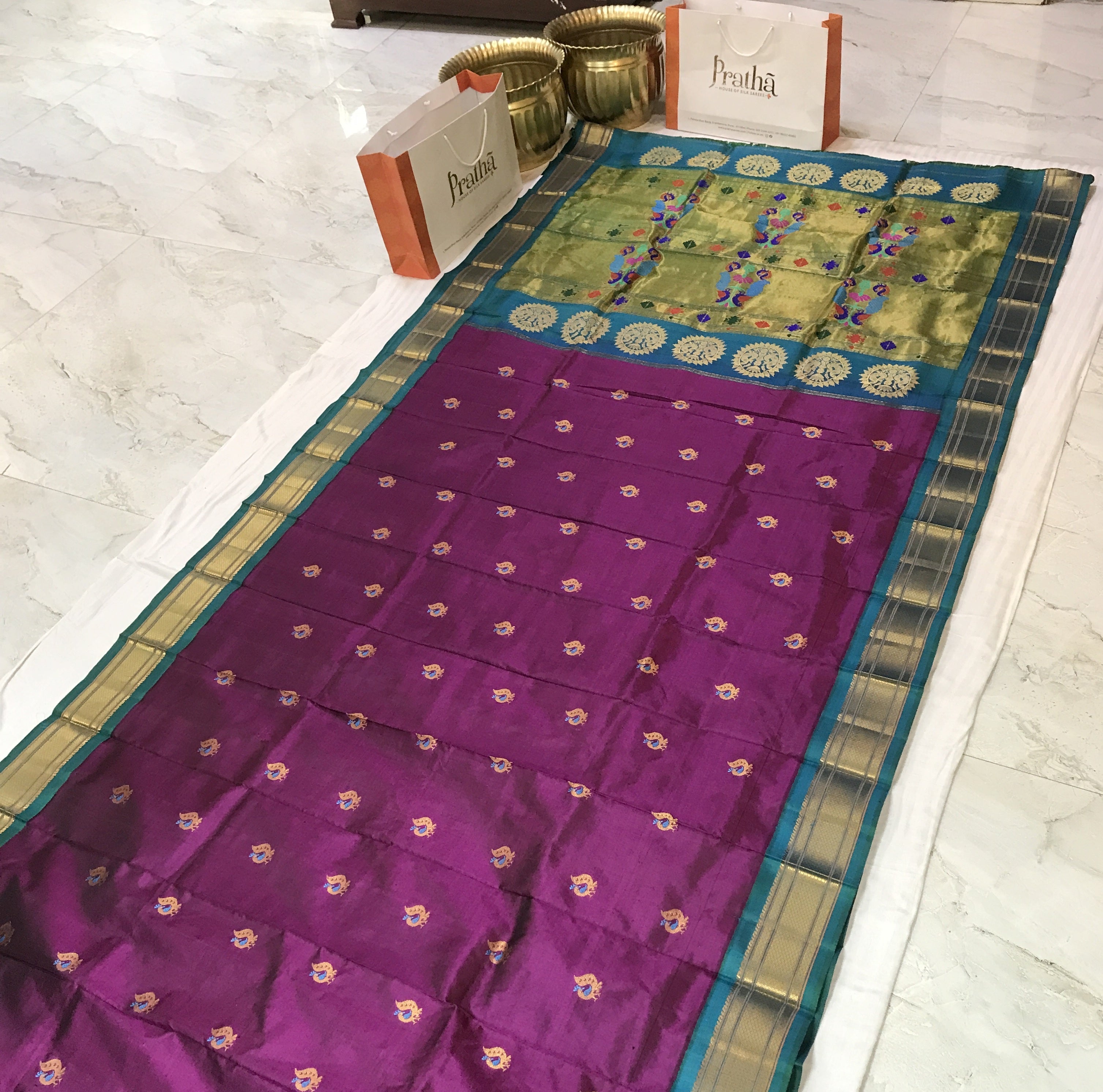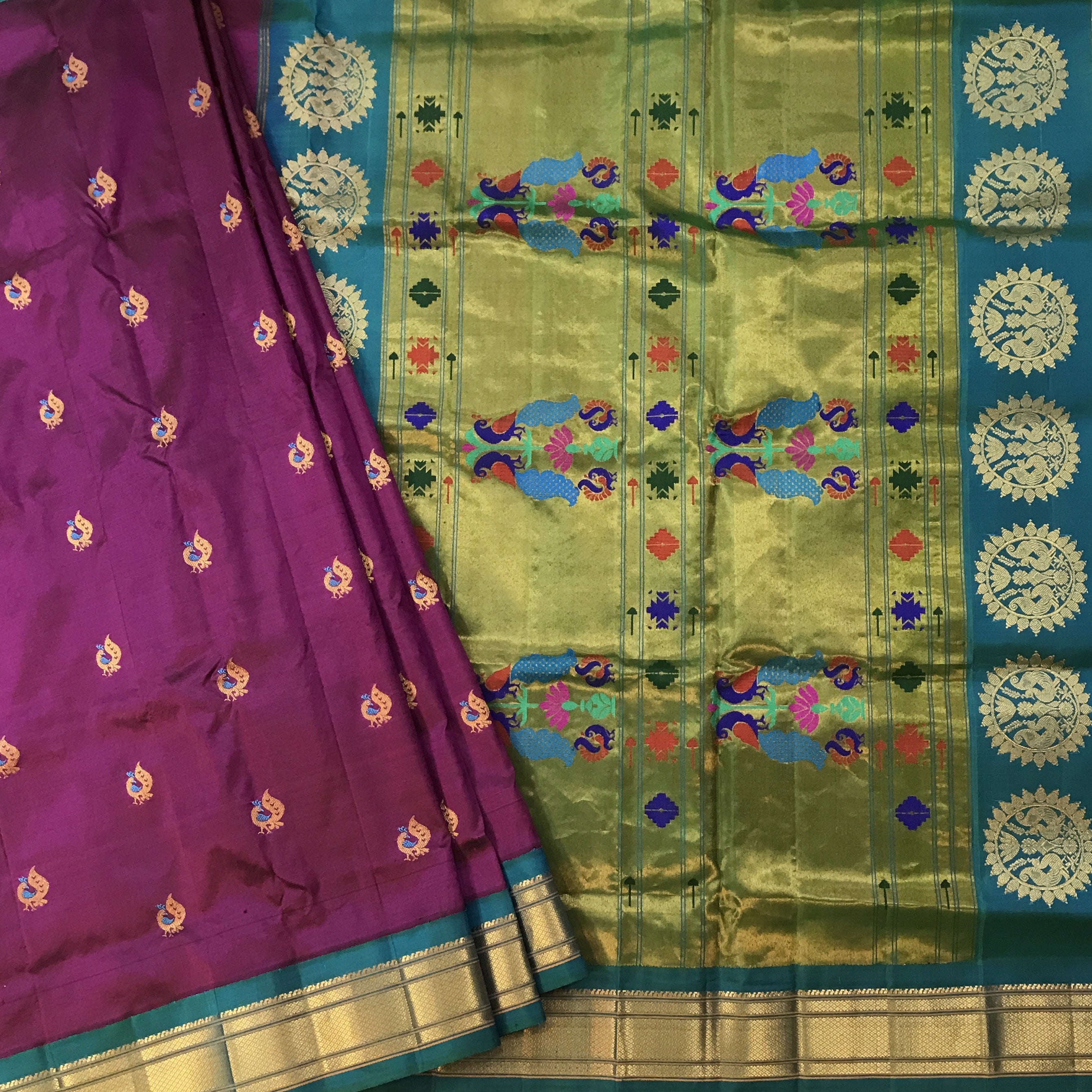 A supreme Paithani weave, in this stunning, beautiful shade of shining magenta is a treat to your eyes! This, with a beautiful contrast peacock border looks incomparable! Do not miss the peacock butti highlighted in blue silk thread throughout this Paithani! The traditional tissue pallu with elaborate peacock motifs looks graceful. This is a perfect pick for those who are looking for a unique Paithani to add their collections!