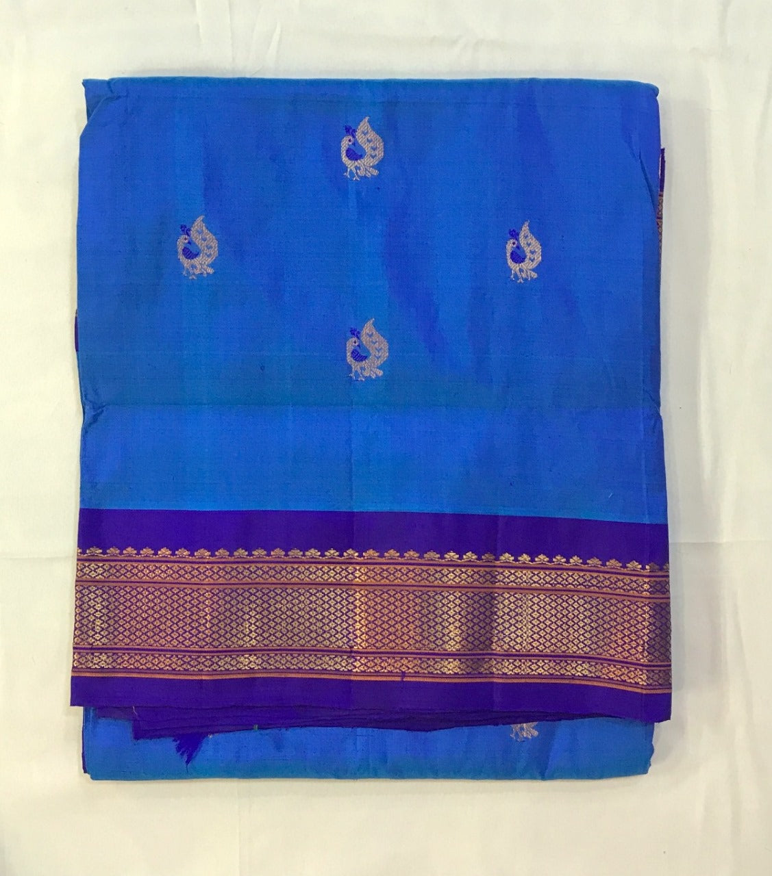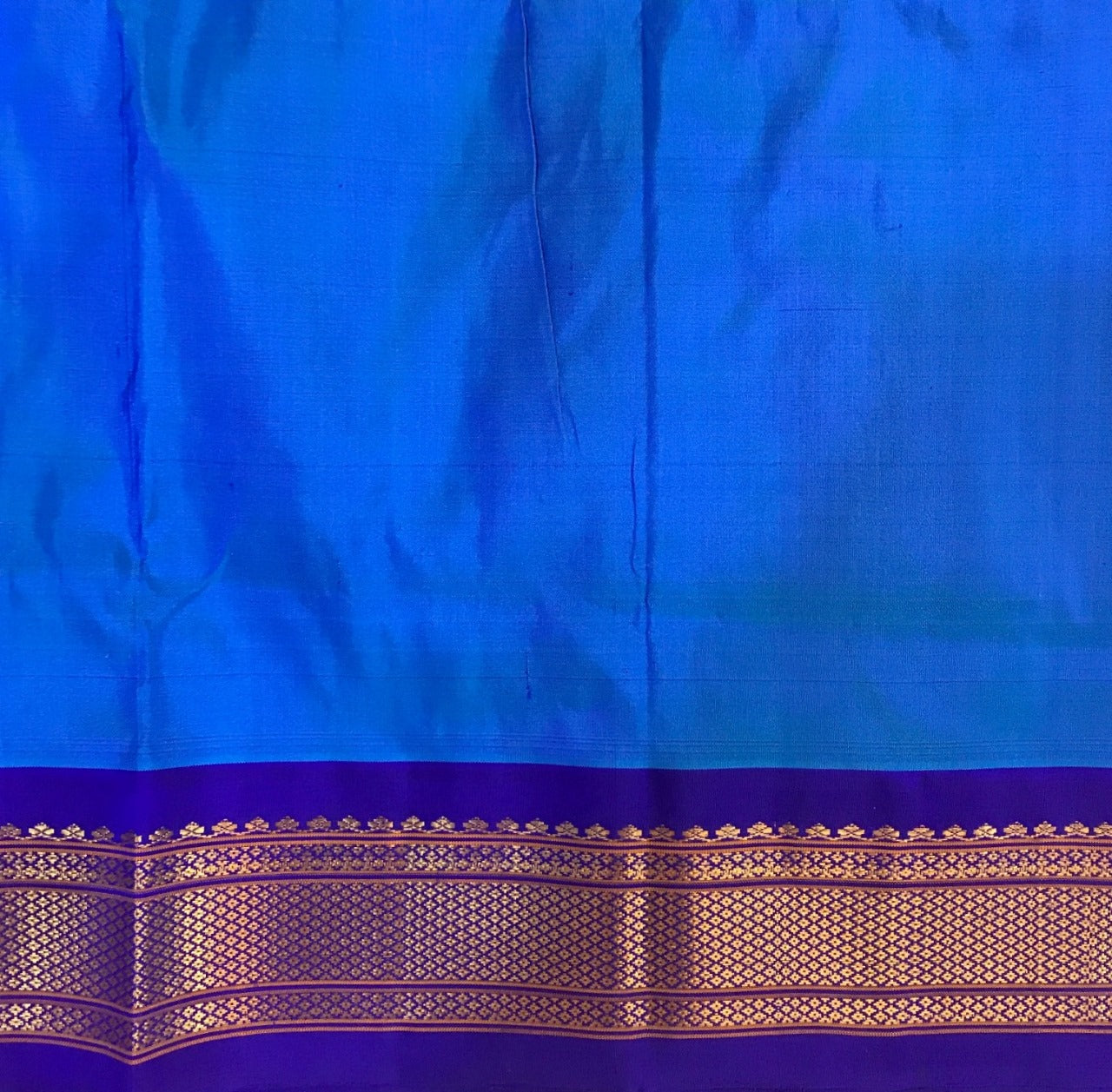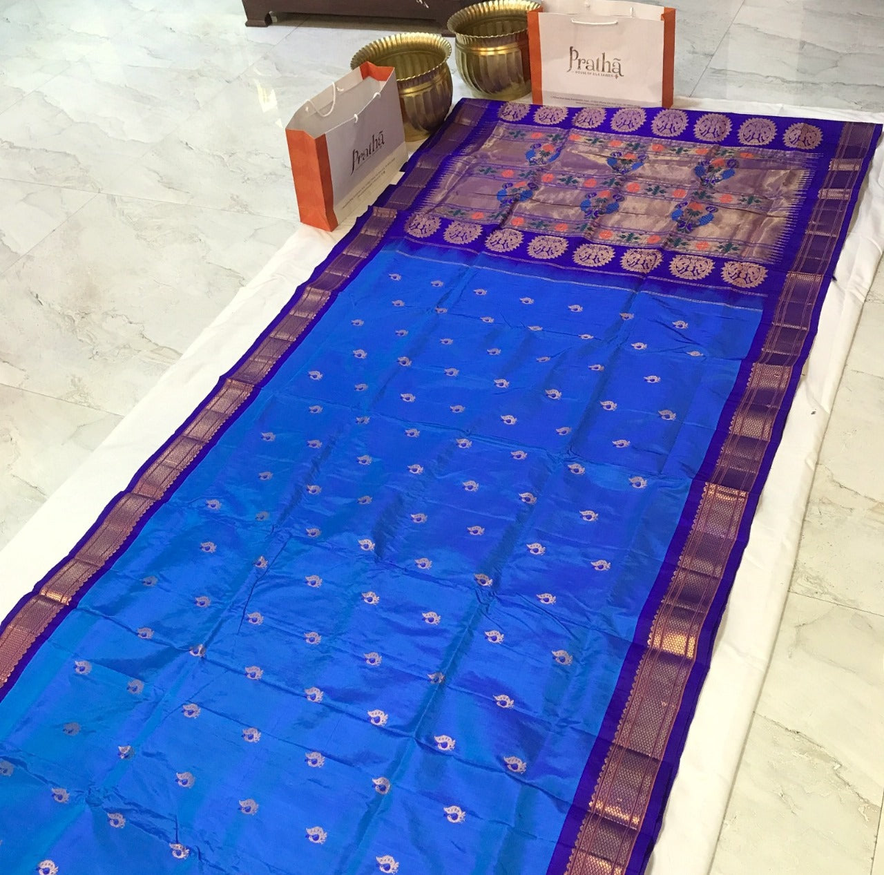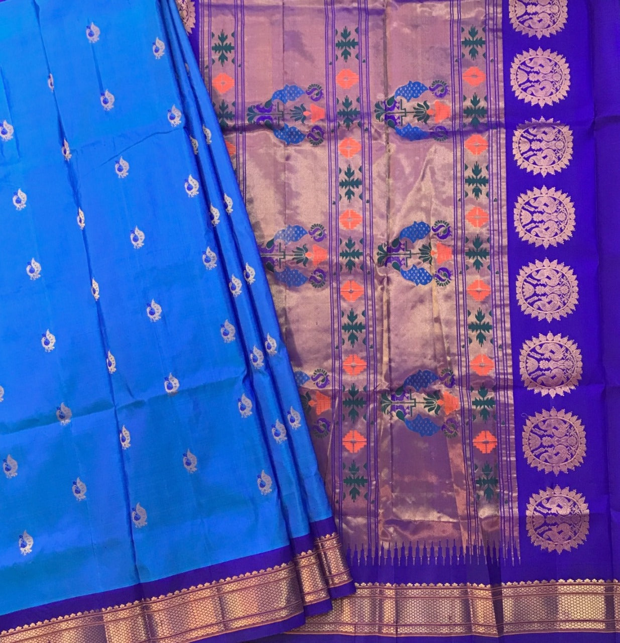 A supreme Paithani weave, in this stunning, beautiful shade of bright blue is a treat to your eyes! This, with a beautiful shade purple of contrast looks incomparable! Do not miss the peacock butti highlighted in blue silk thread throughout this Paithani! The traditional tissue pallu with elaborate peacock motifs looks graceful. This is a perfect pick for those who are looking for a unique Paithani to add their collections!