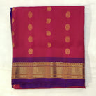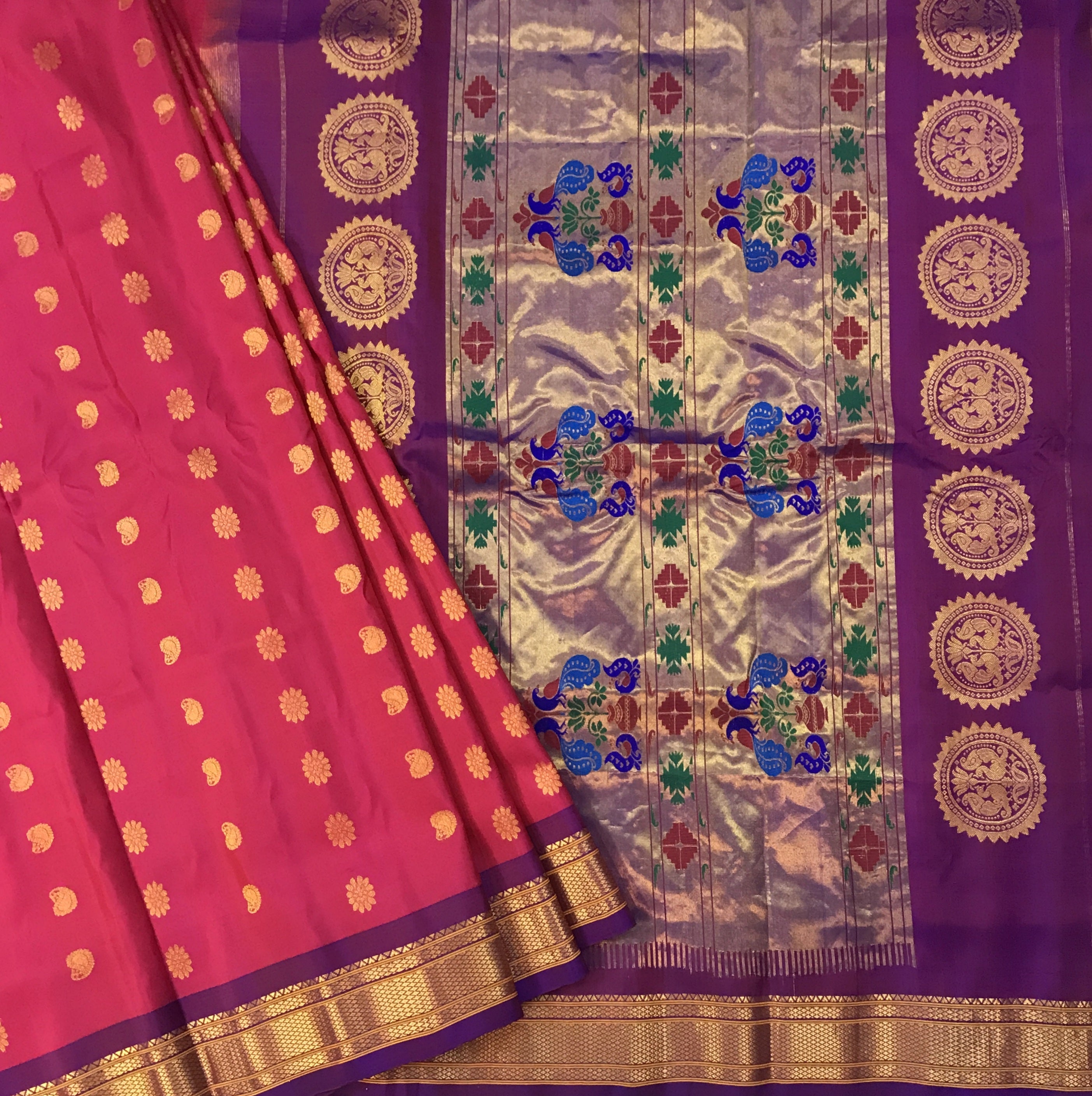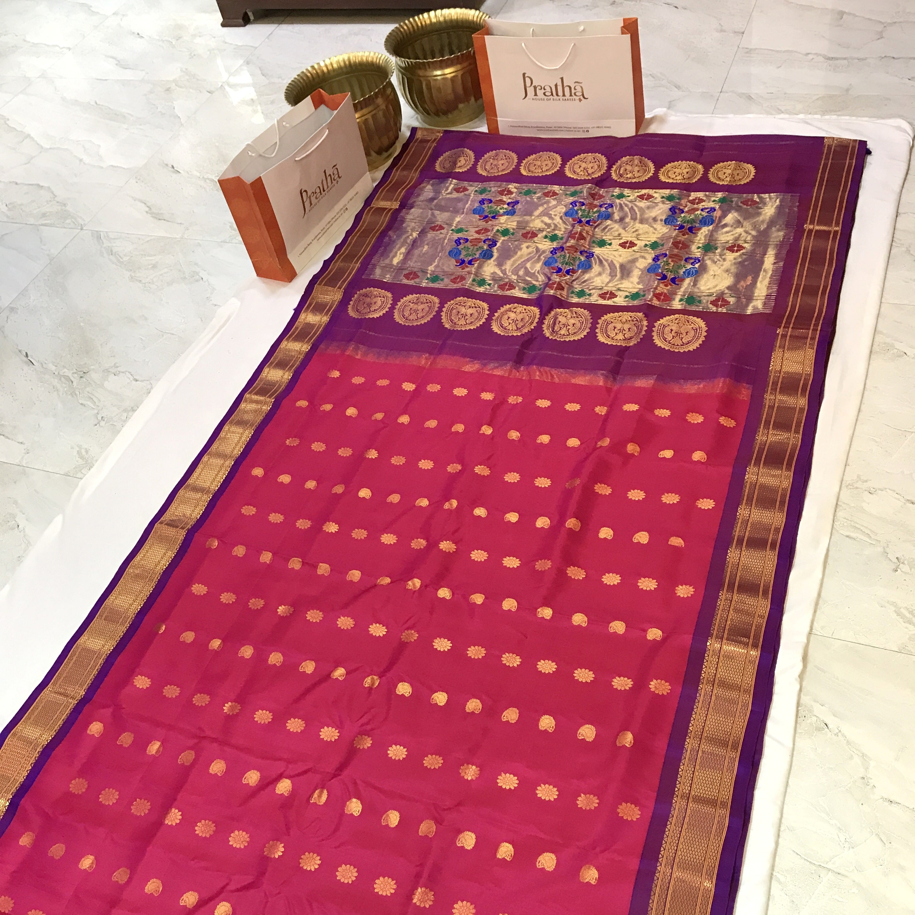 This weave is a stunner with its Pink Paithani with a complementing fresh purple contrast coloured border. This Paithani has alternate floral-koyari designer butti all over with a traditional border, a perfect balance of classic and unusual. This is one of Pratha's favorite!