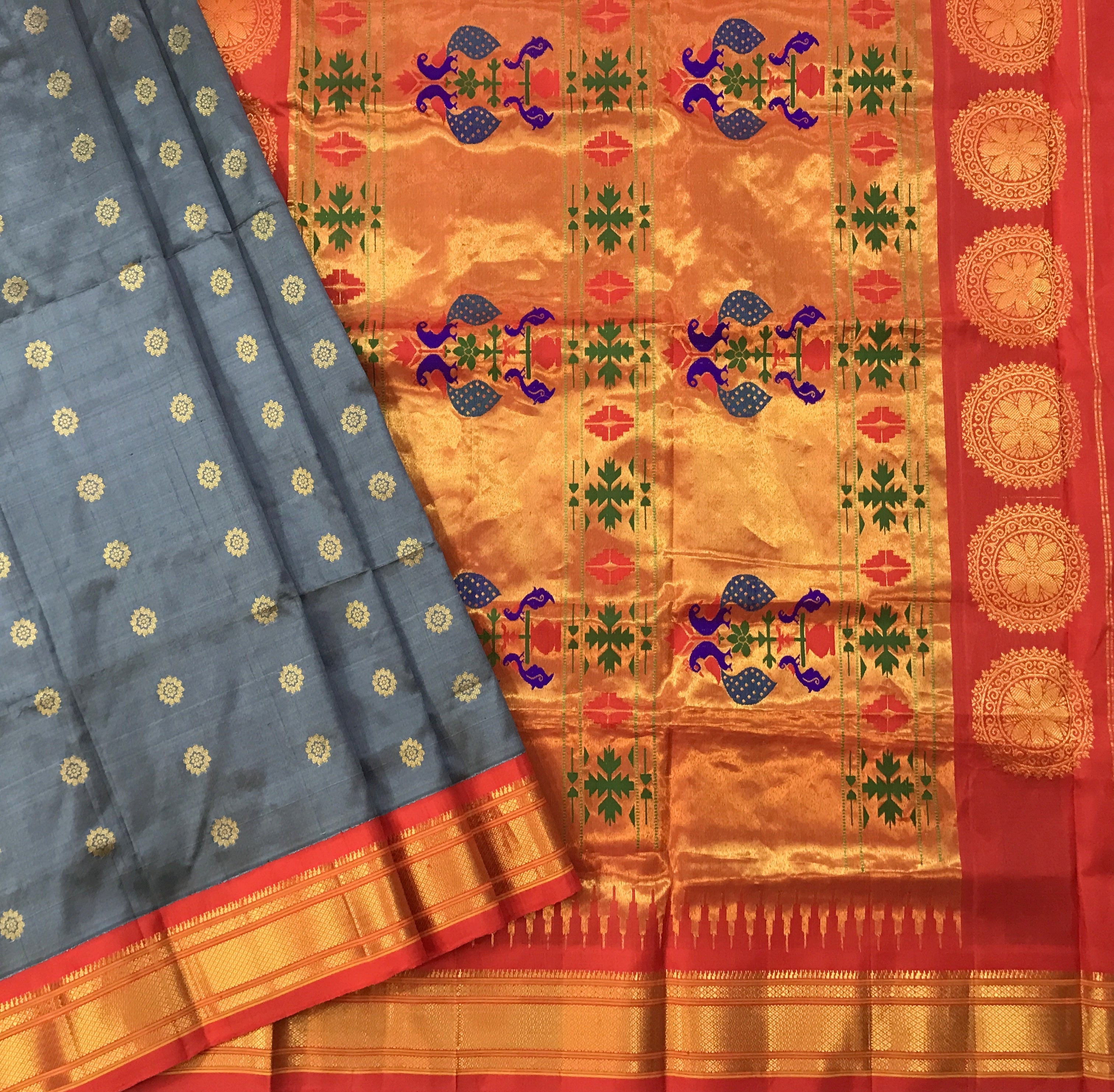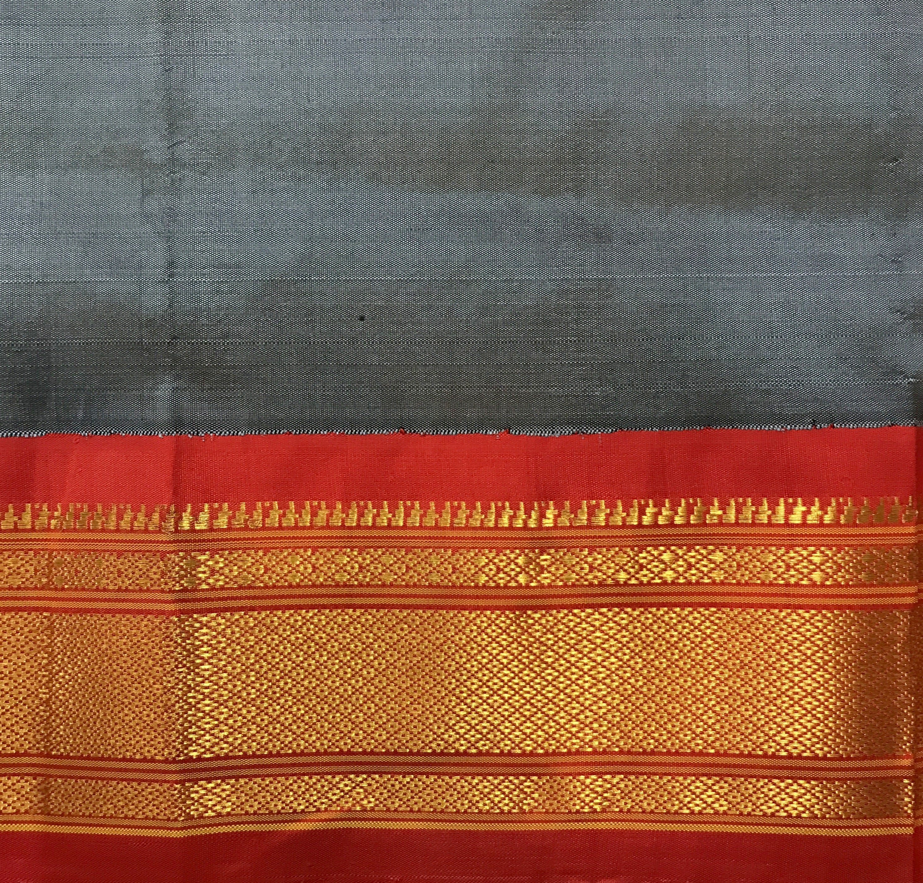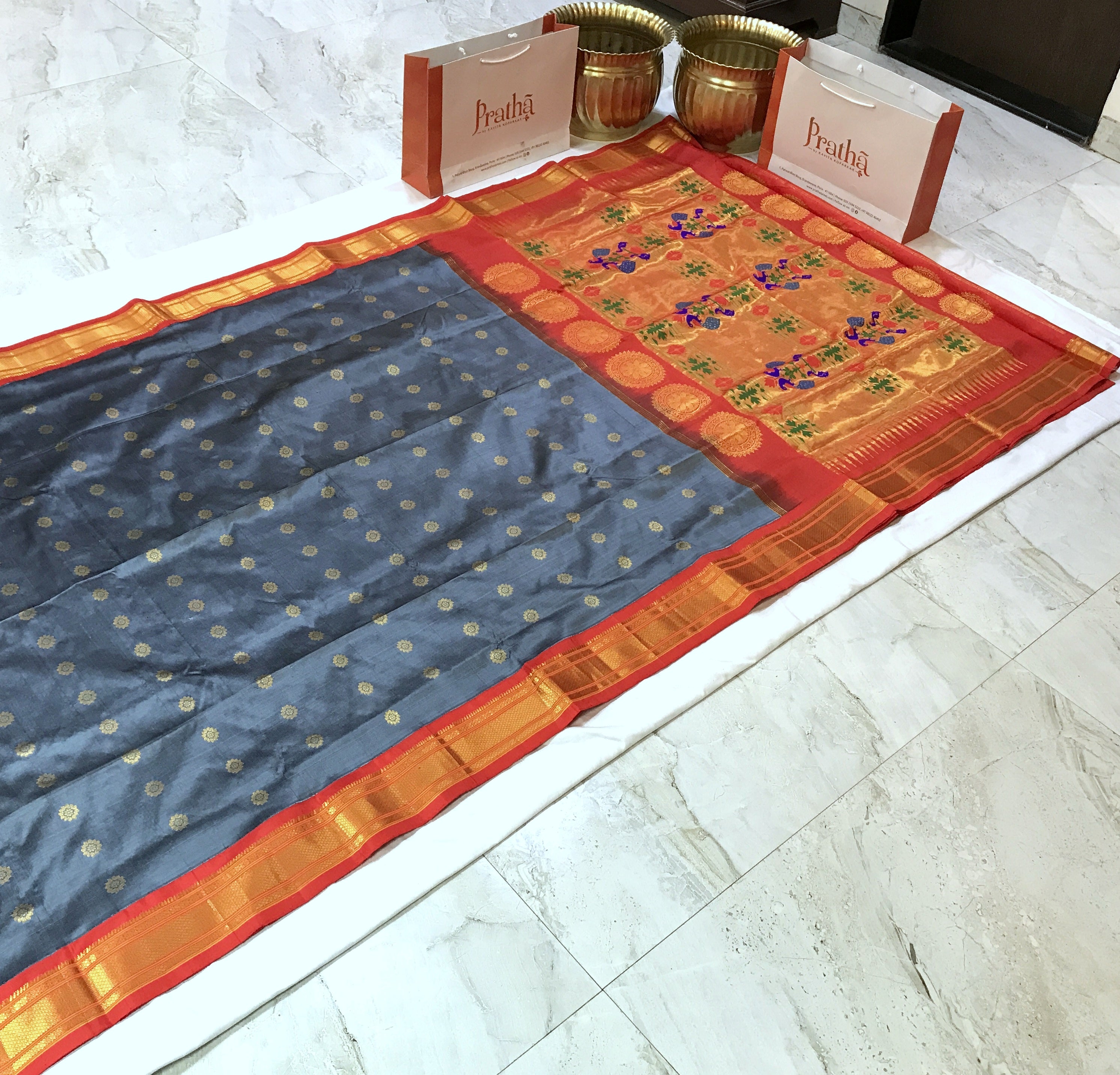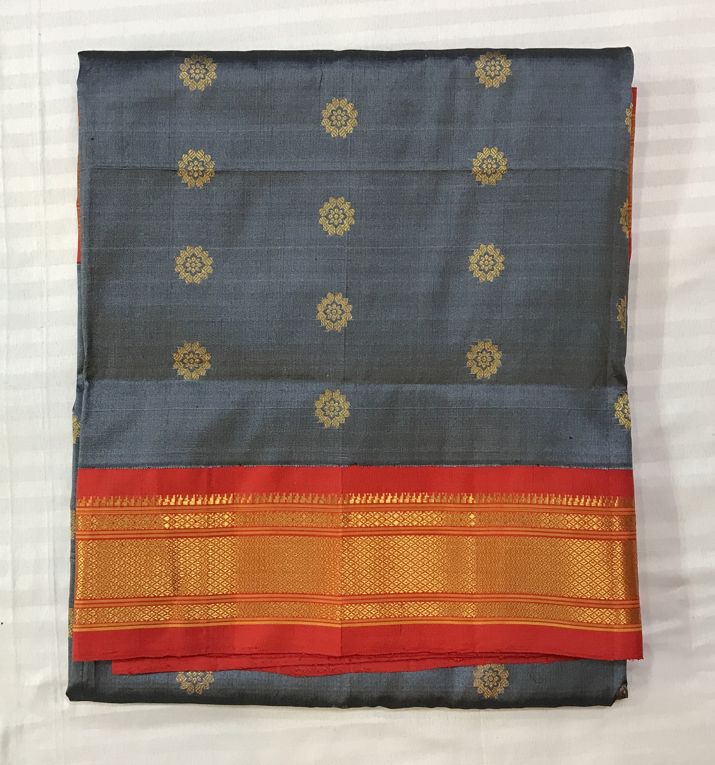 An epic combination of grey with a red coloured border, is here. The intricately detailed floral butti(motifs) are spread all the saree in golden zari thread looks great. Glance at the beautiful multicolored peacocks motifs zari pallu widely scattered over the golden border.