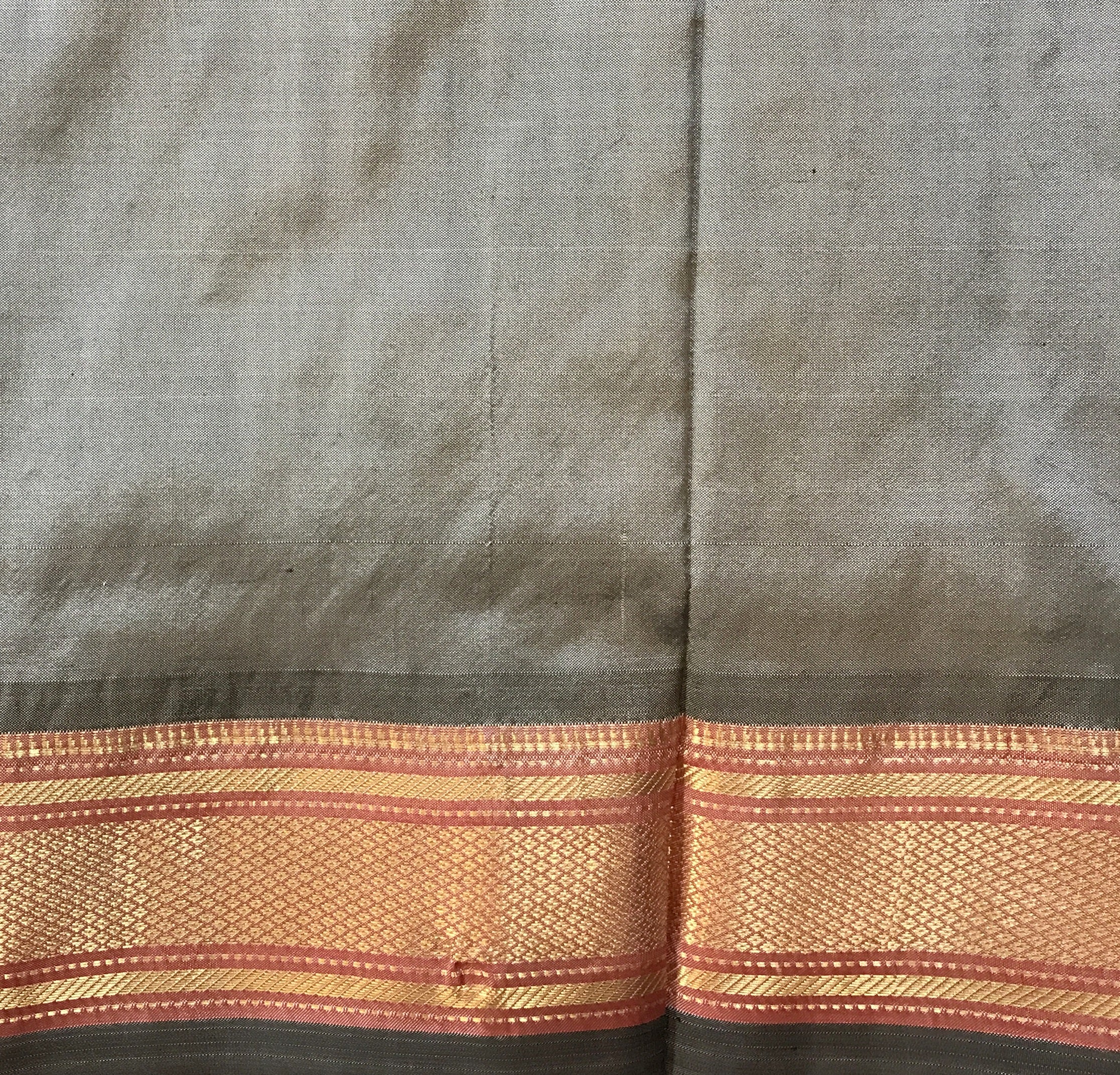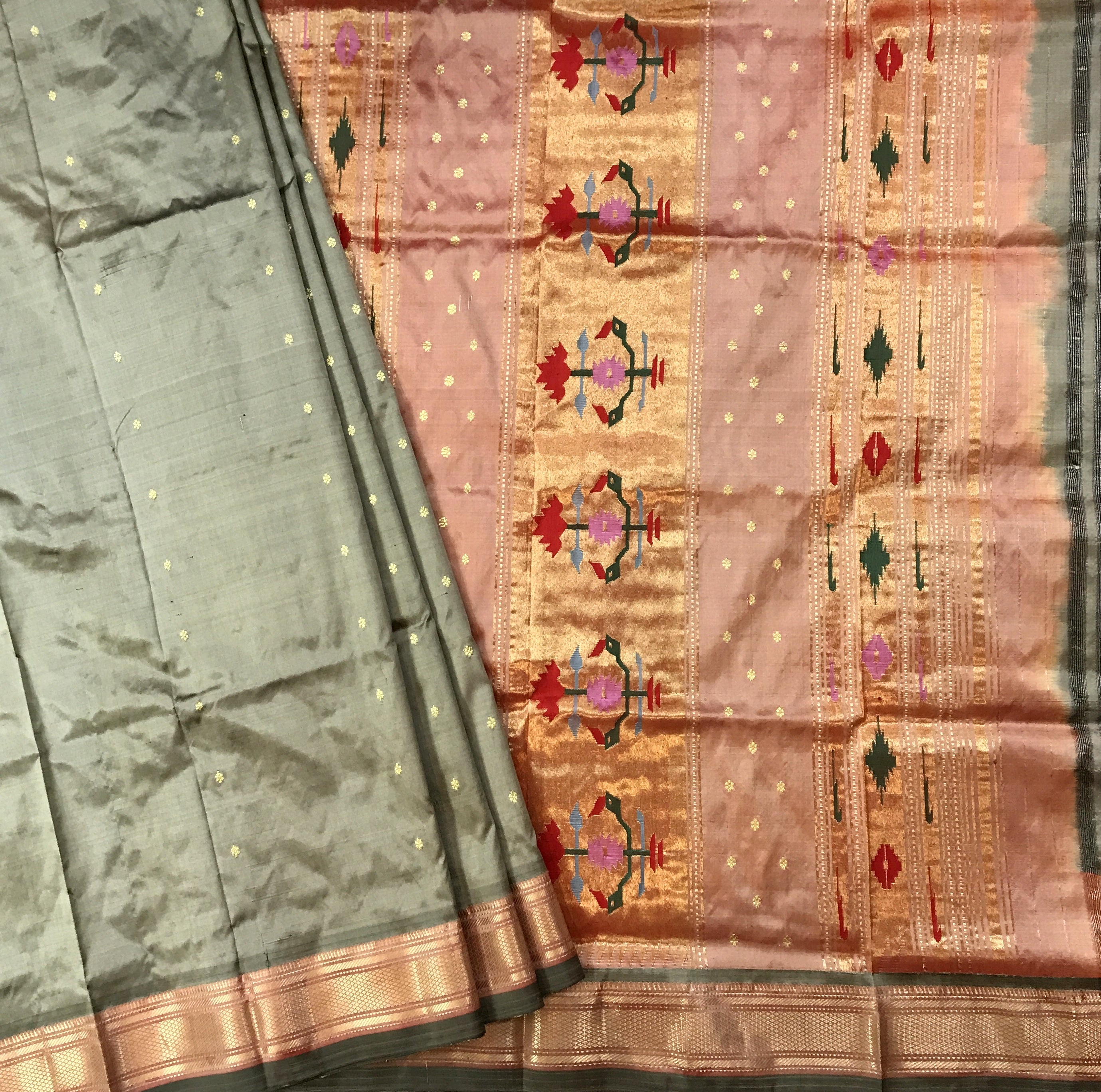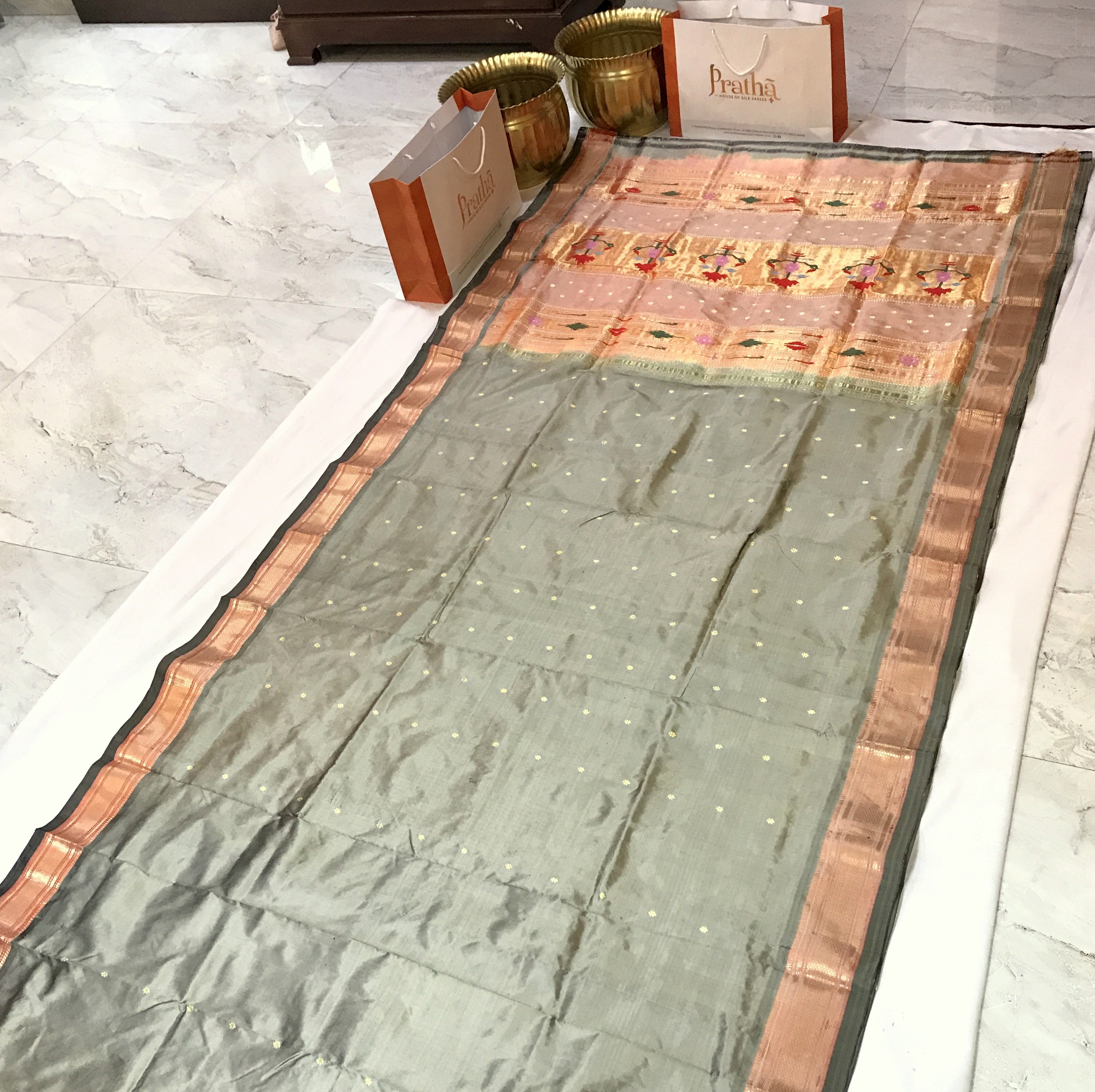 A very outstanding shade of grey with peach coloured golden zari border in traditional Paithani. Do not miss the floral butti highlighted in golden zari thread throughout this Paithani. The traditional tissue pallu with elaborate lotus motifs looks graceful. This is a perfect pick for those who are looking for a unique Paithani to add to their collection.