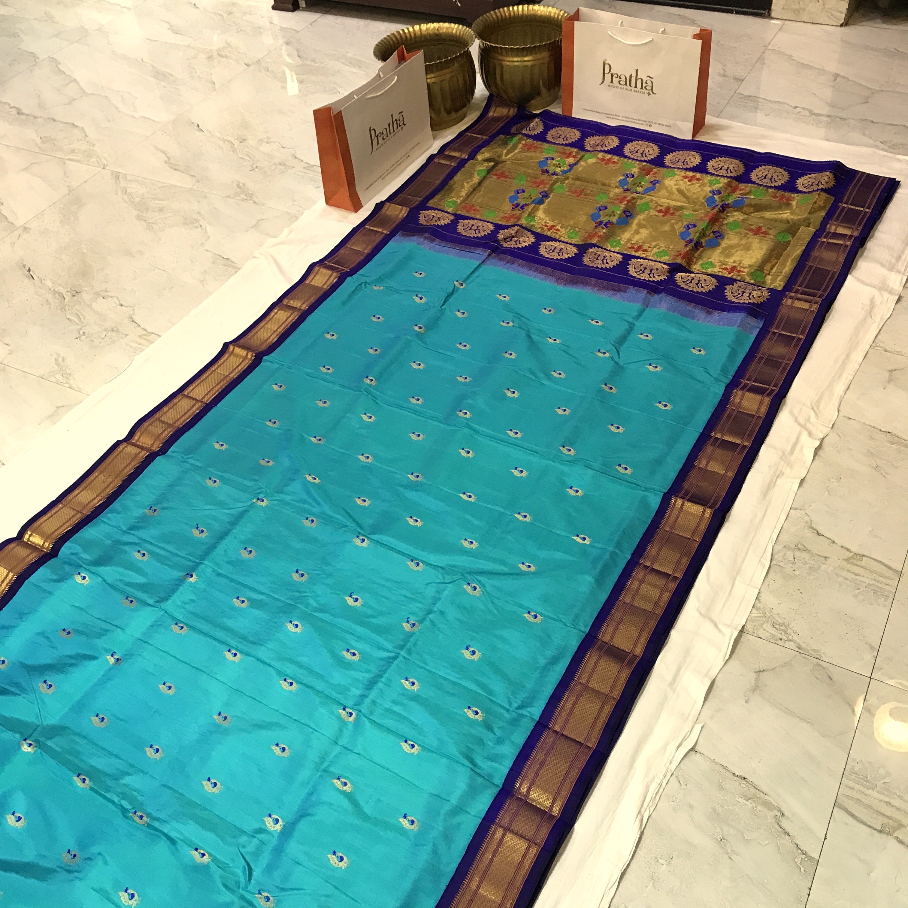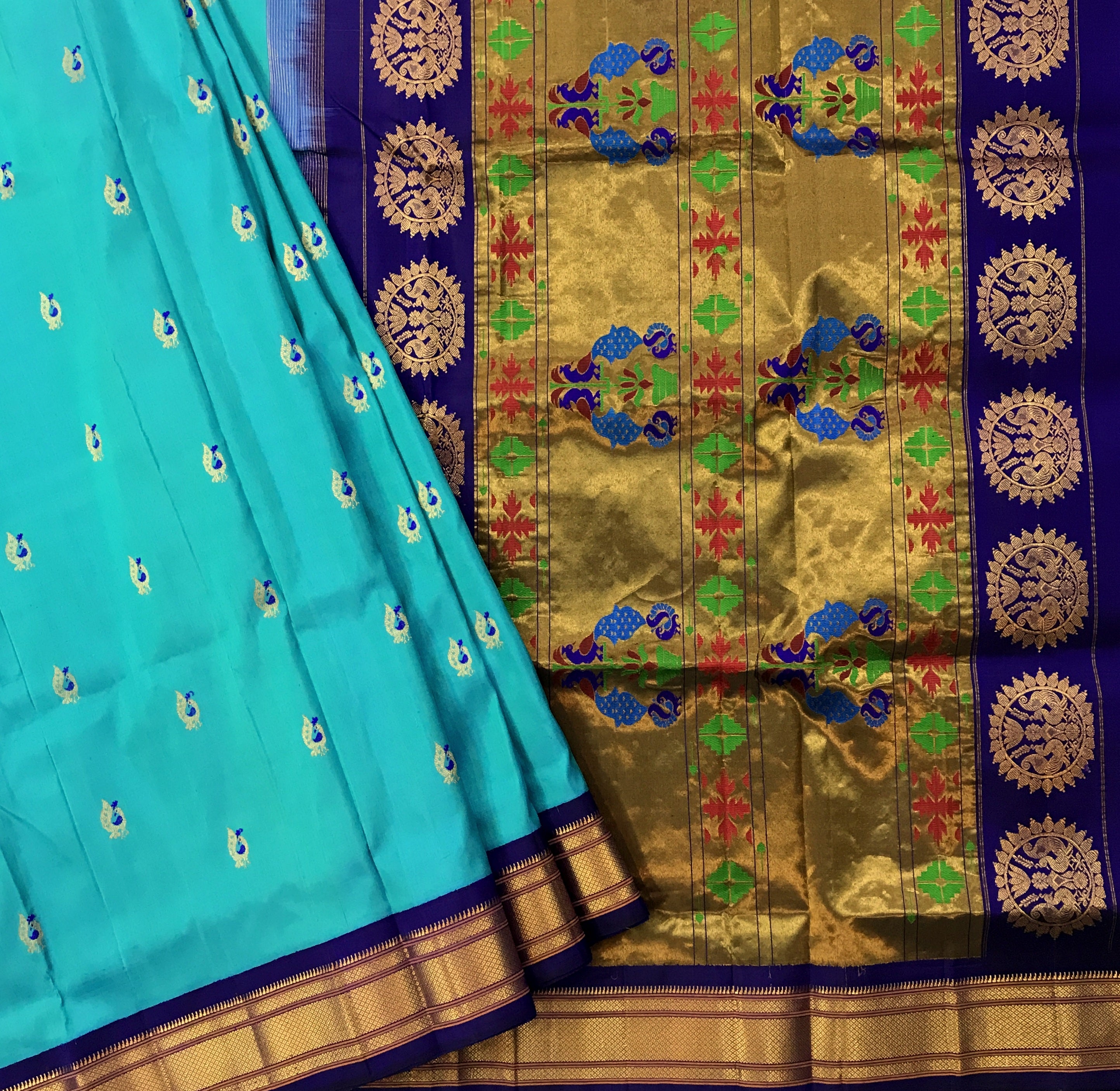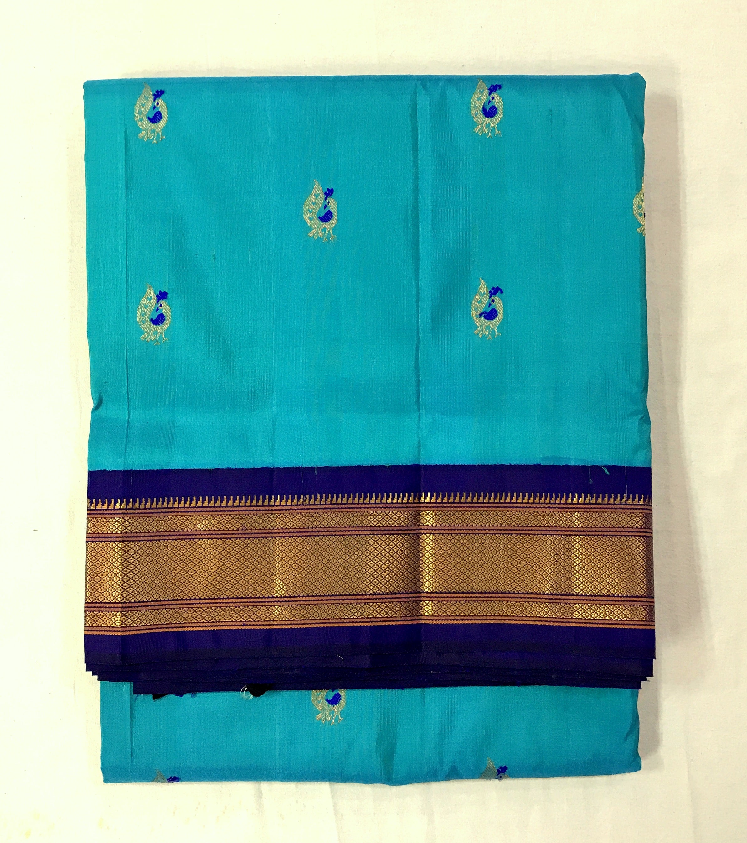 Blouse Colour:Contrast( Blue with golden zari border )