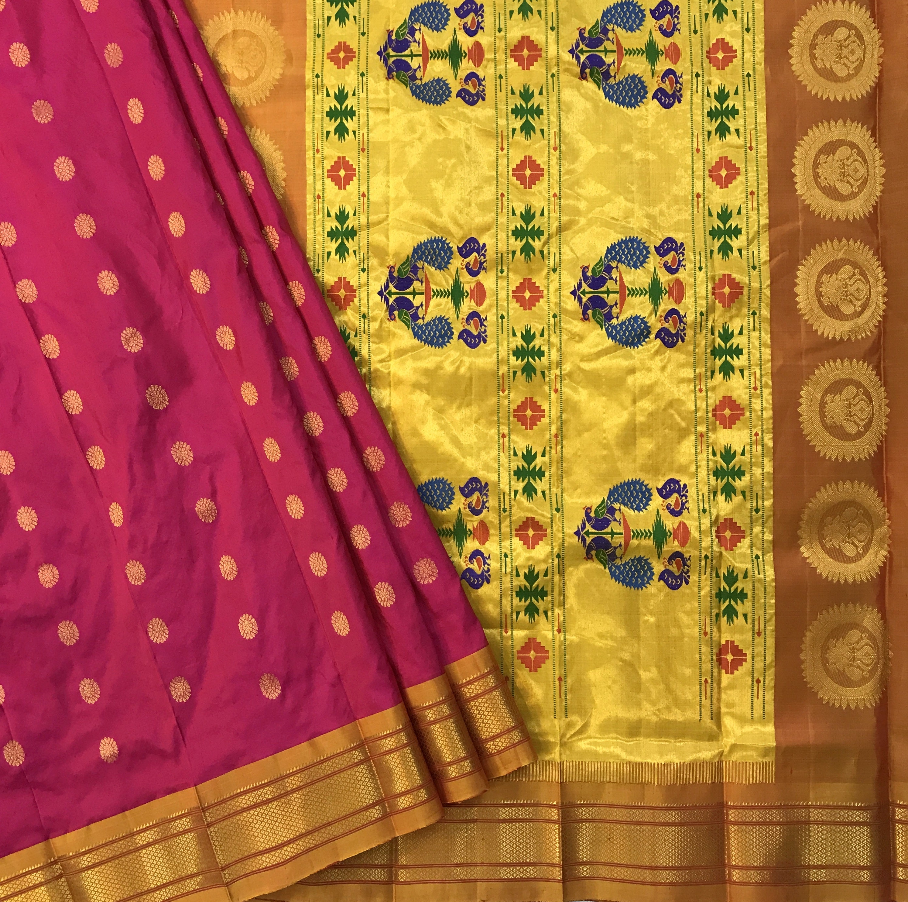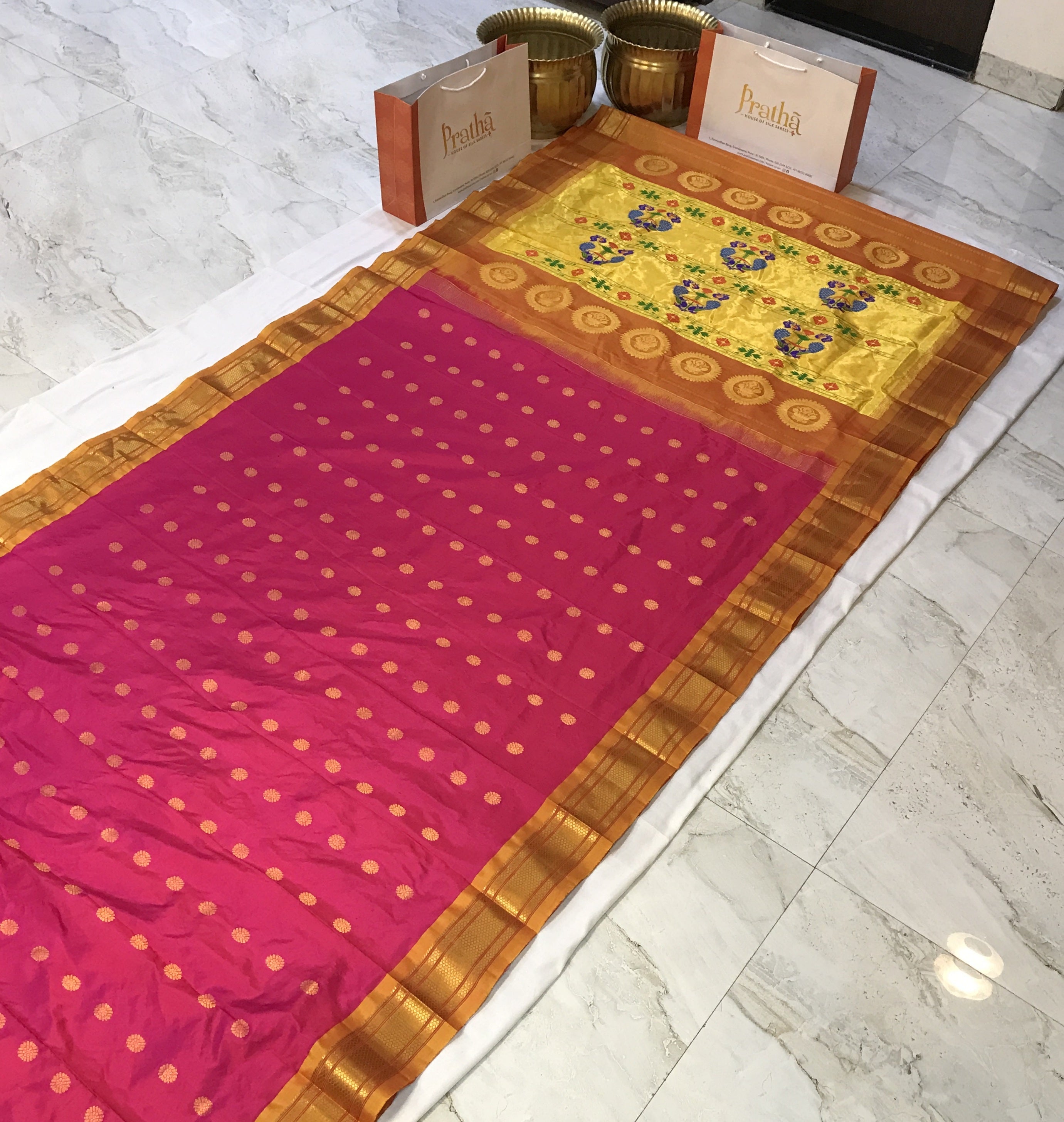 The phenomenal combination of Pink Paithani with a very beautiful mango-yellow border is Pratha's favorite. The delicate flower butti add the needed amount of grace which makes it perfect for any and every special occasion of yours!