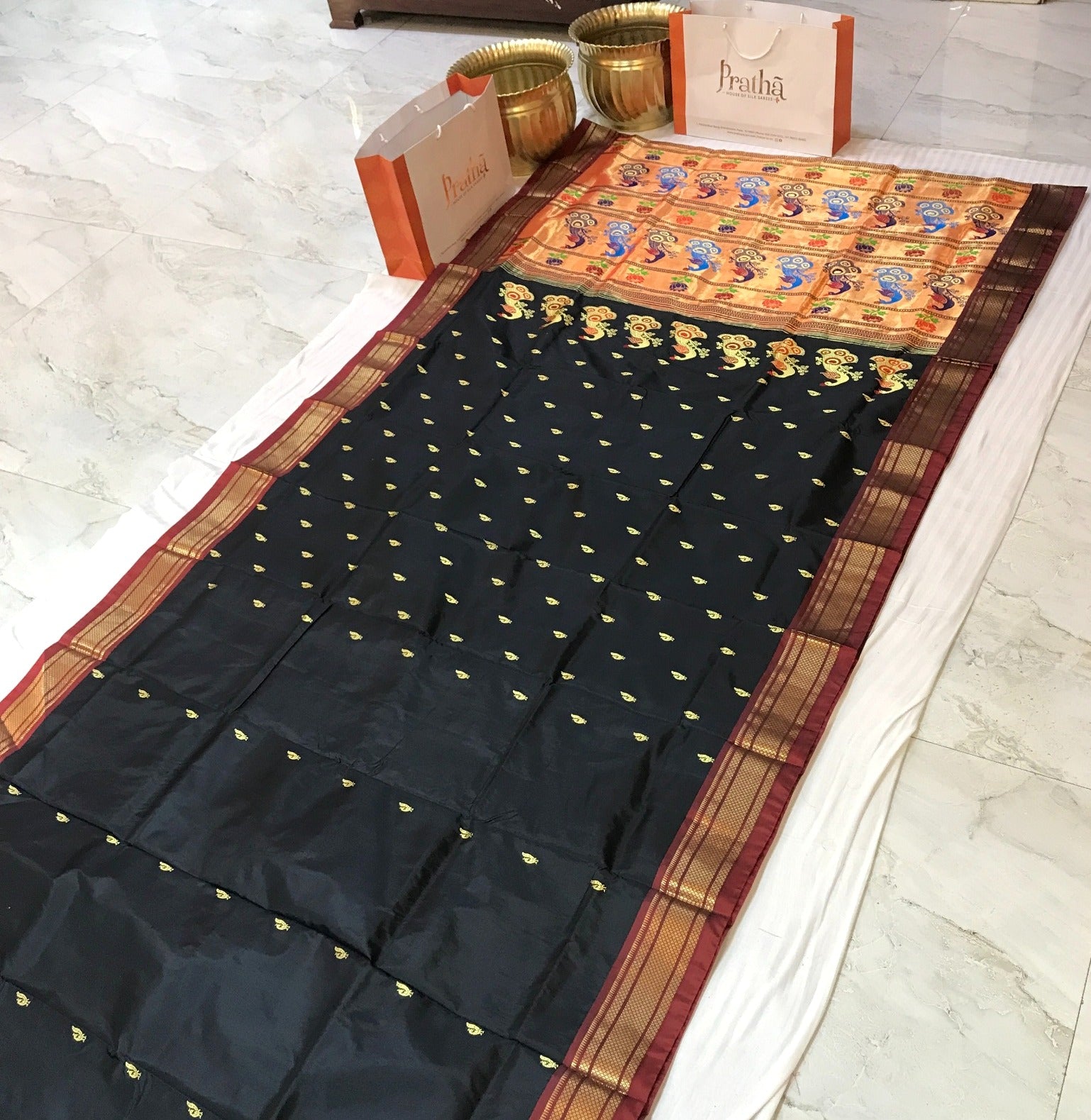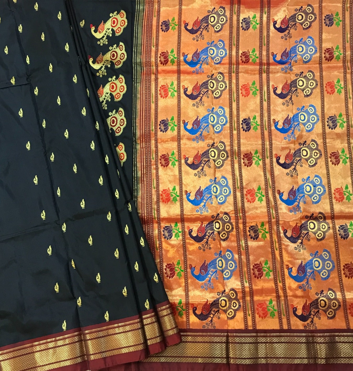 A supreme Paithani weave in this stunning, beautiful shade of black is a treat to your eyes! This with a beautiful shade of brown contrast border looks incomparable! Do not miss the peacock butti highlighted in silk thread throughout this Paithani! The traditional tissue pallu with elaborate peacock motifs looks graceful. This is a perfect pick for those who are looking for a unique Paithani to add their collections!