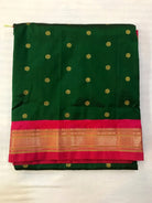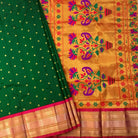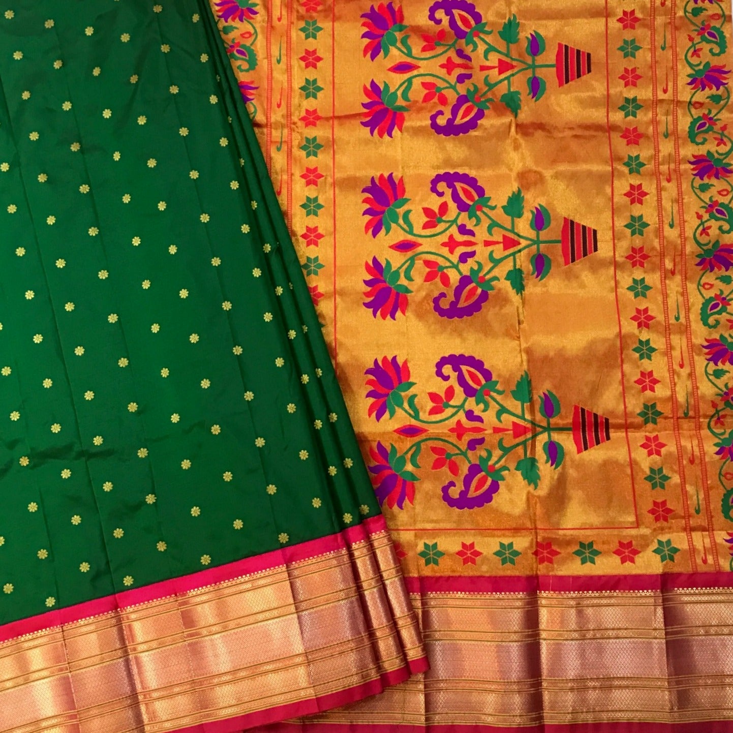 A supreme Paithani weave, in this stunning, beautiful shade of shining bottle-green is a treat to your eyes! This, with a beautiful shade of pink border looks incomparable! Do not miss the small floral butti throughout this Paithani! The traditional multicoloured pallu looks graceful. This is a perfect pick for those who are looking for a unique Paithani to add their collections!