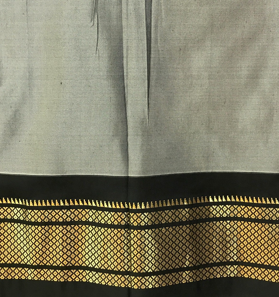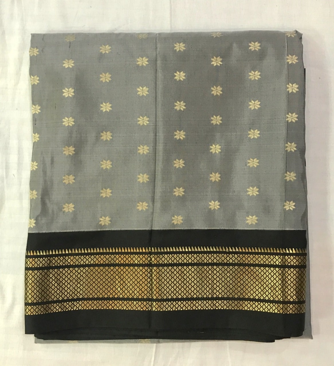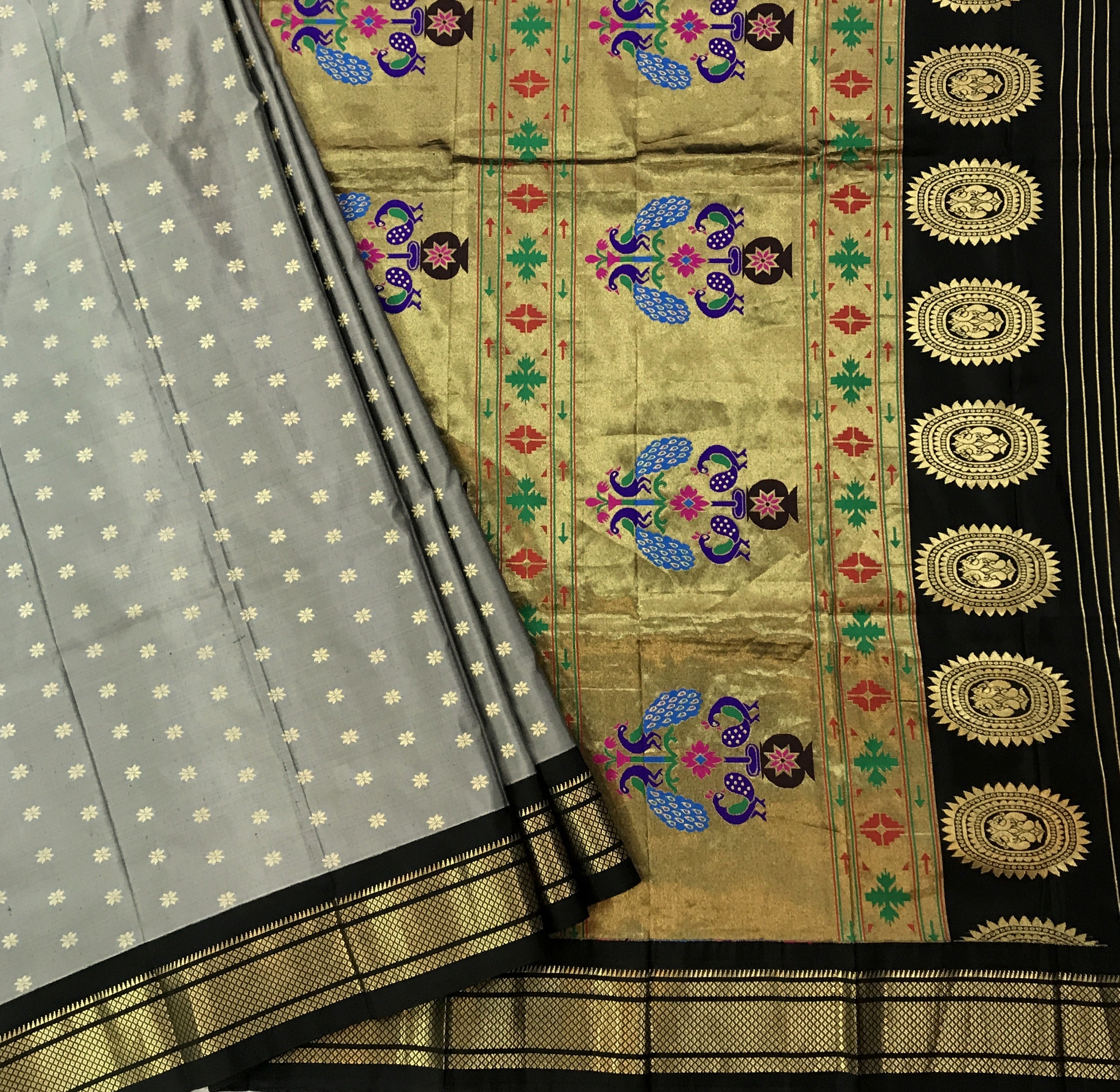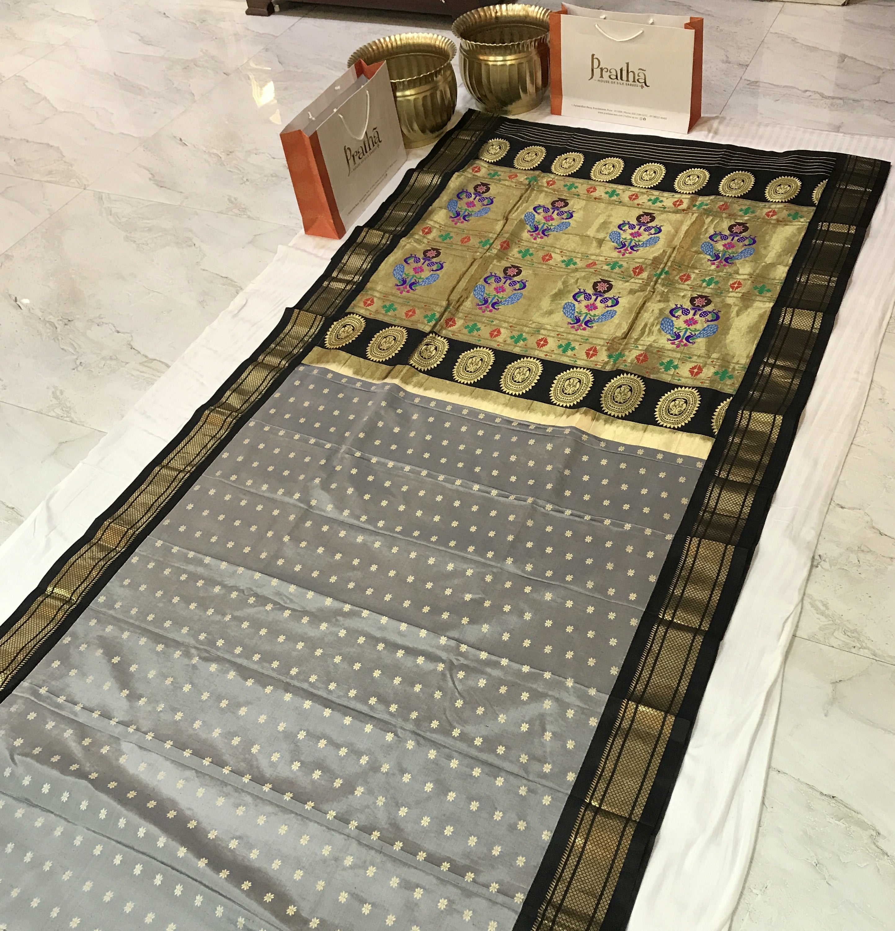 A supreme Paithani weave, in this stunning, beautiful shade of grey is a treat to your eyes! This, with a beautiful shade of black border looks incomparable! Do not miss the small floral golden zari butti throughout this Paithani! The traditional tissue pallu with elaborate peacock motifs looks graceful. This is a perfect pick for those who are looking for a unique Paithani to add their collections!