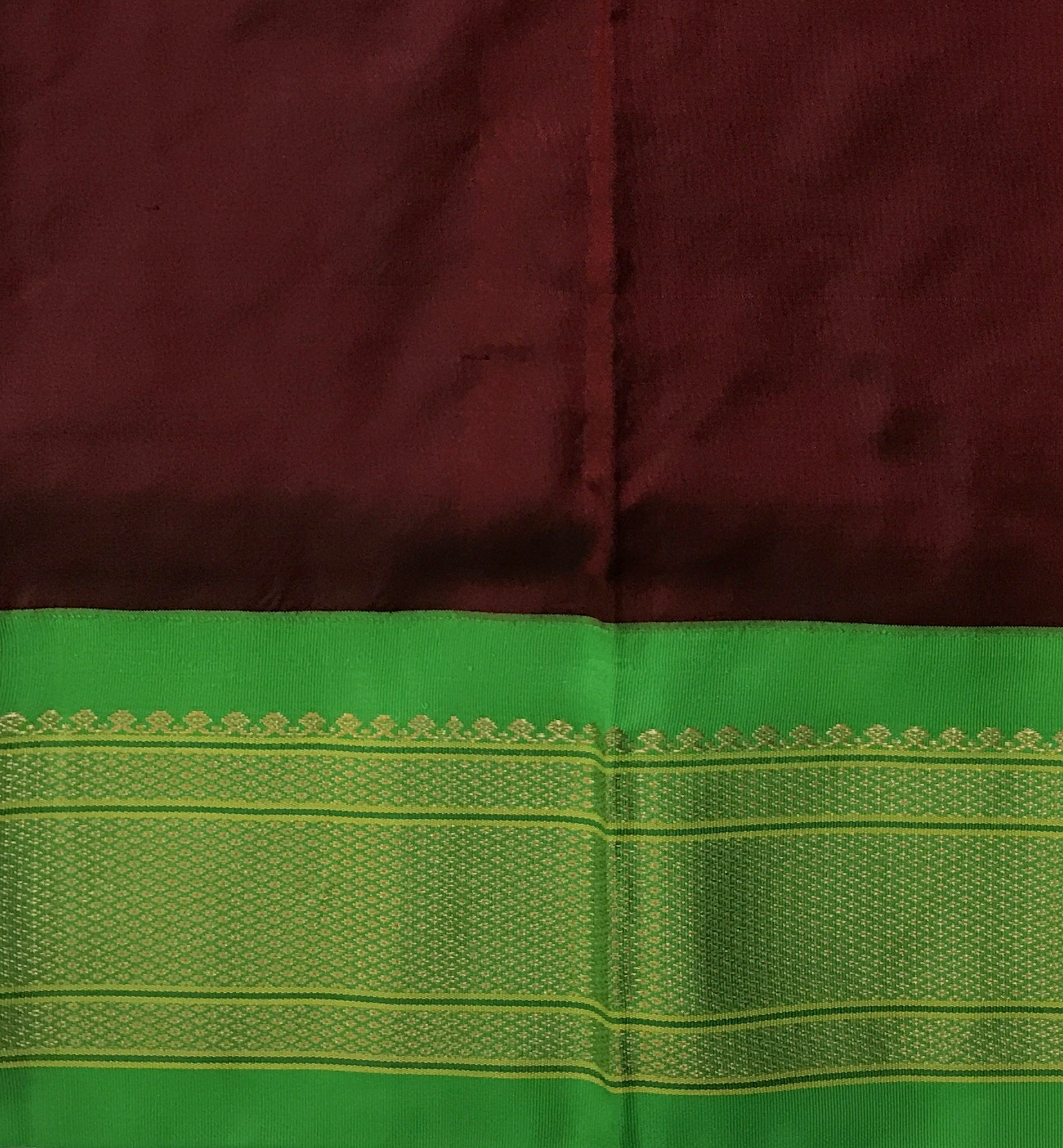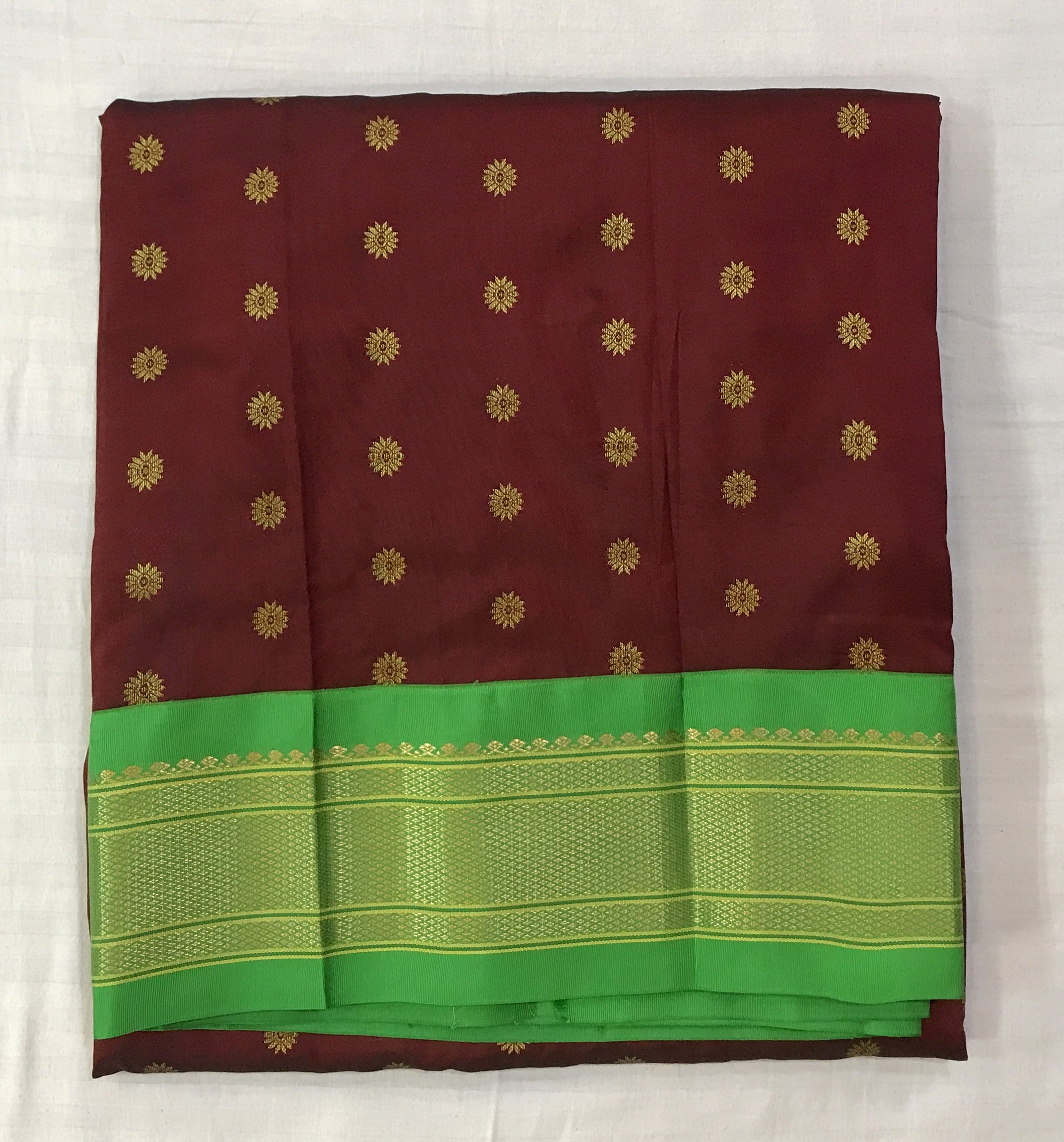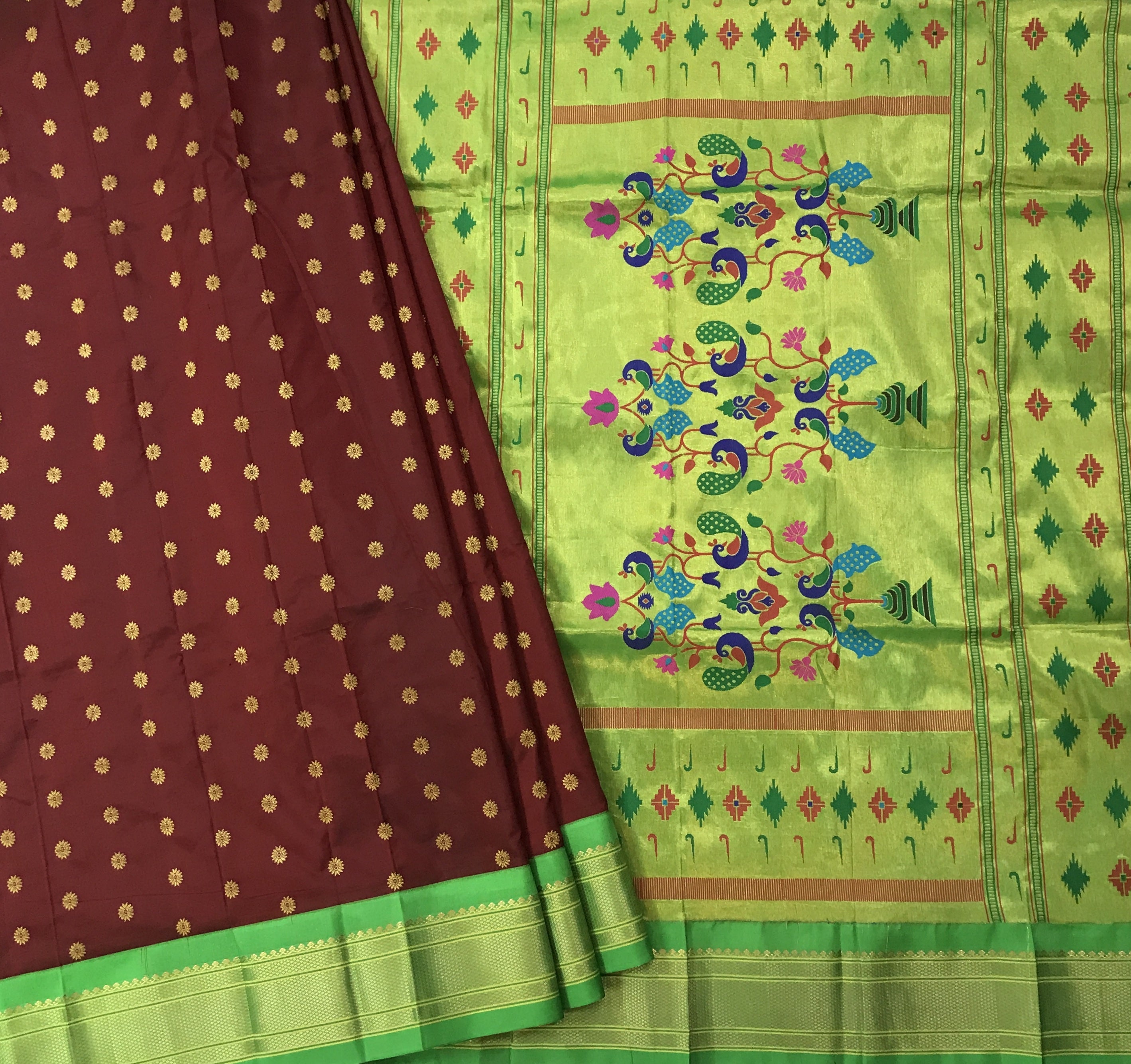 An ethereal shade of maroon, this one is a unique blend of royal and maroon creating a rich shade of a 'deep red'. Not too dark, not too bright: This stunning power loom Paithani with green coloured golden zari border is just class apart! The finely spread floral butti and its traditional pallu just stand true to its roots!