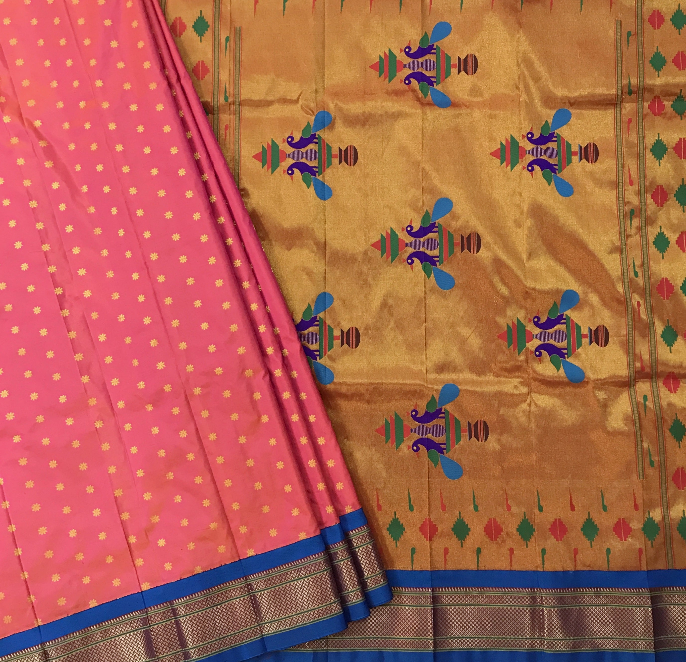 This fresh shade of pink , in excellent pure silk saree with the most amazing blue coloured golden zari border is a classy combination for power loom Paithani. This stunning Paithani flaunts beautiful floral butti ( motifs) of golden zari and beautiful golden zari pallu with peacock motifs add grace to this festive saree. Pratha happily presents these in beautiful colours.