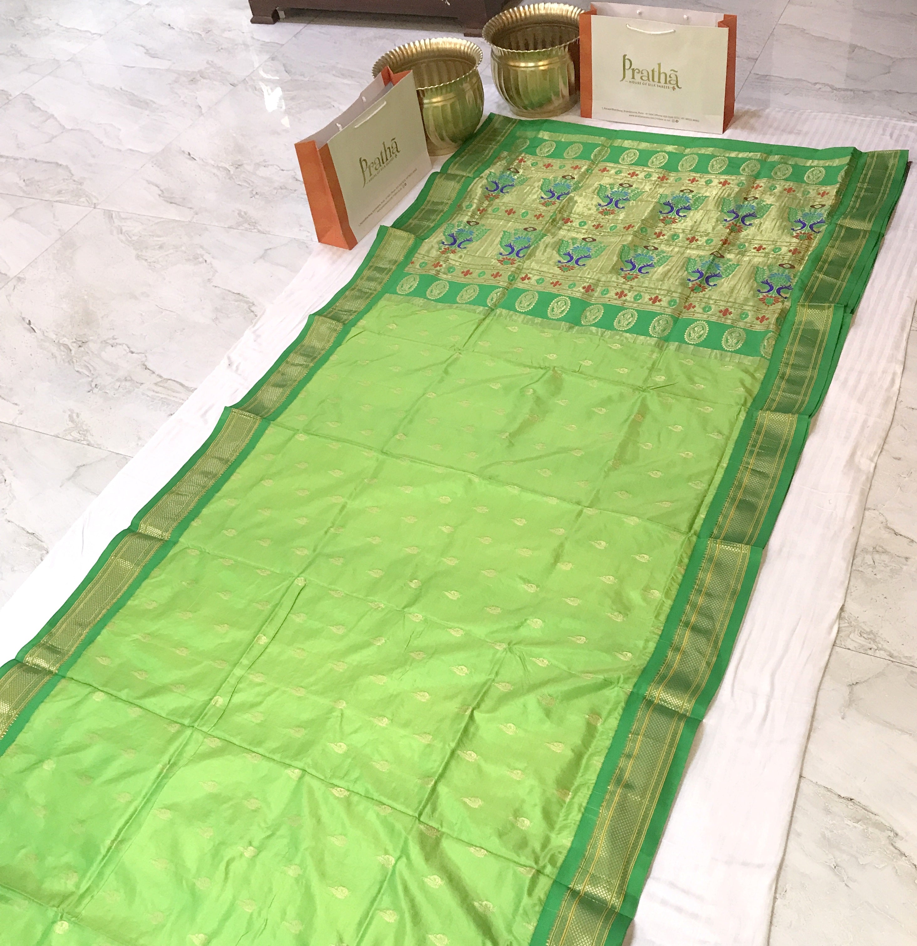A classy parrot green coloured power loom Paithani, with its added class by the intricate peacock buttis(motifs), is a piece of grandeur. The contrast created with the bright green border and an golden zari pallu looks ethereal. This saree works wonders for any occasion! Do not miss the peacock ( motifs ) design pallu highlighted in multicolored silk thread throughout this Paithani.