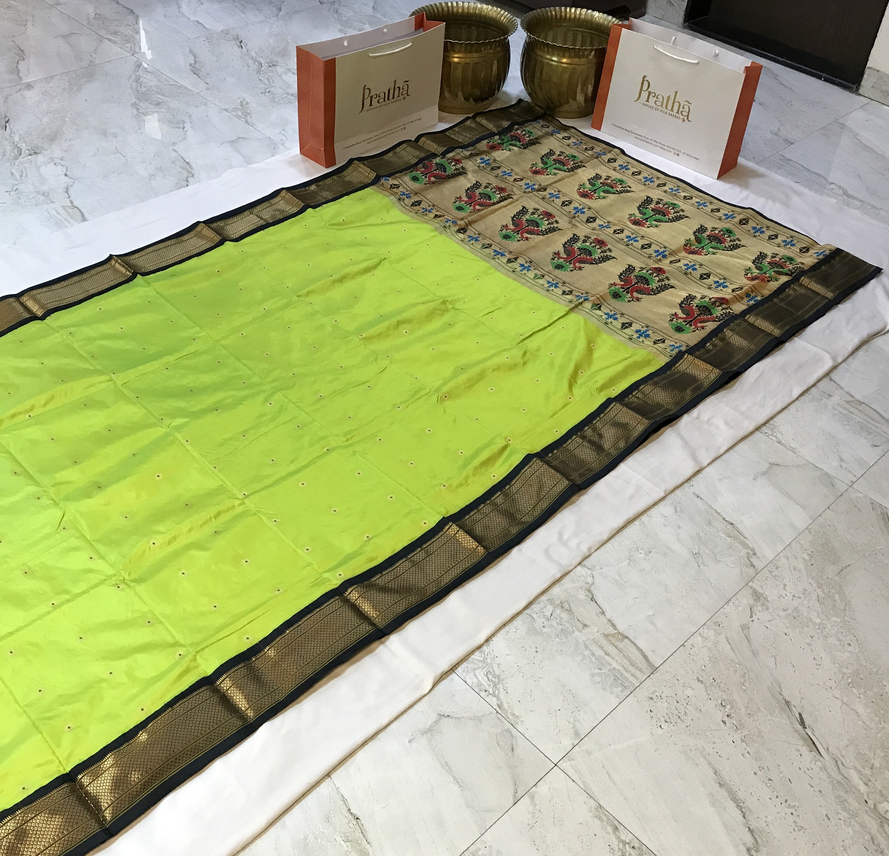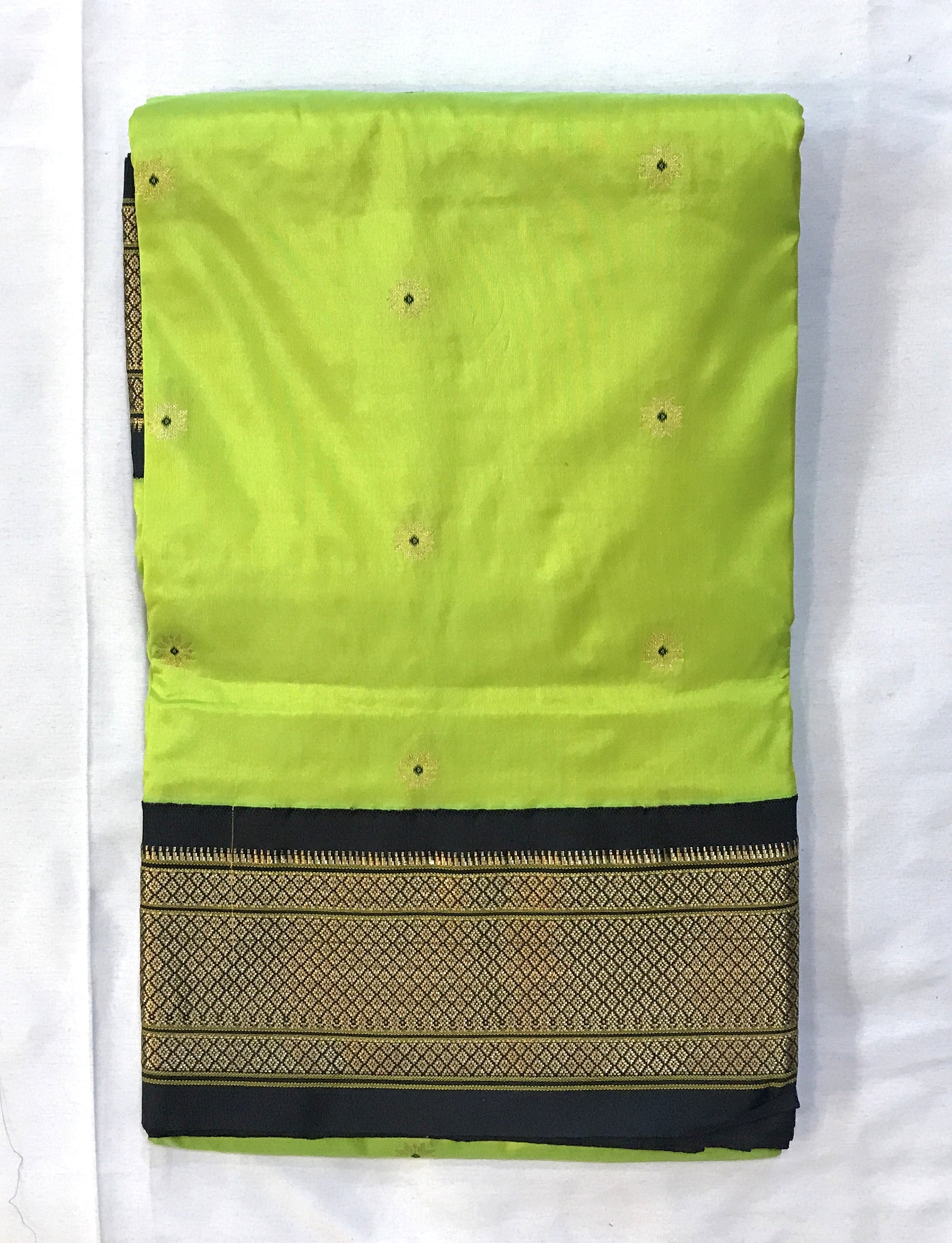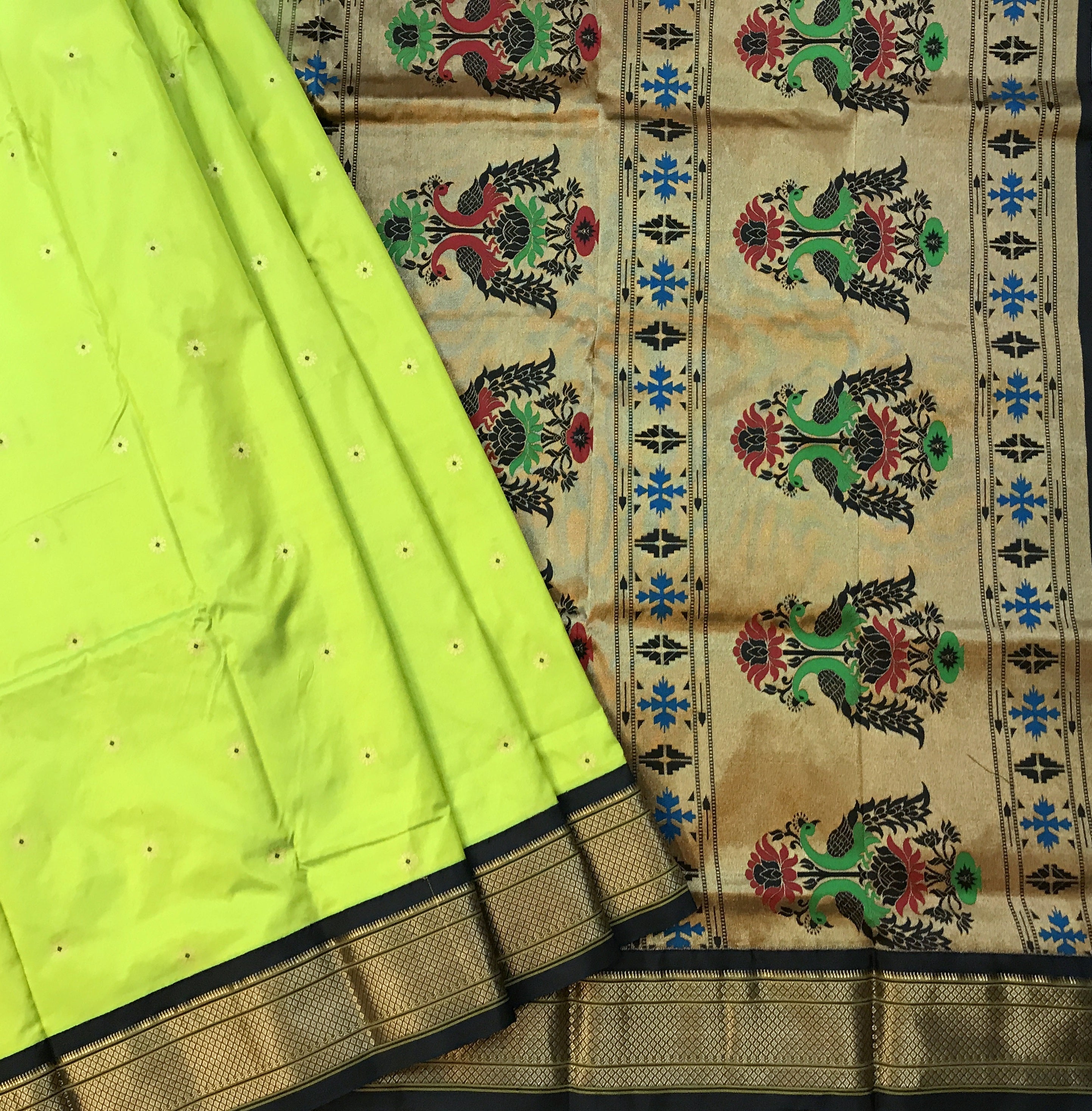 A classy parrot green coloured power loom Paithani, with its added class by the intricate floral buttis(motifs), is a piece of grandeur. The contrast created with the black border and an golden zari pallu looks ethereal. This saree works wonders for any occasion! Do not miss the peacock ( motifs ) design pallu highlighted in multicolored silk thread throughout this Paithani.