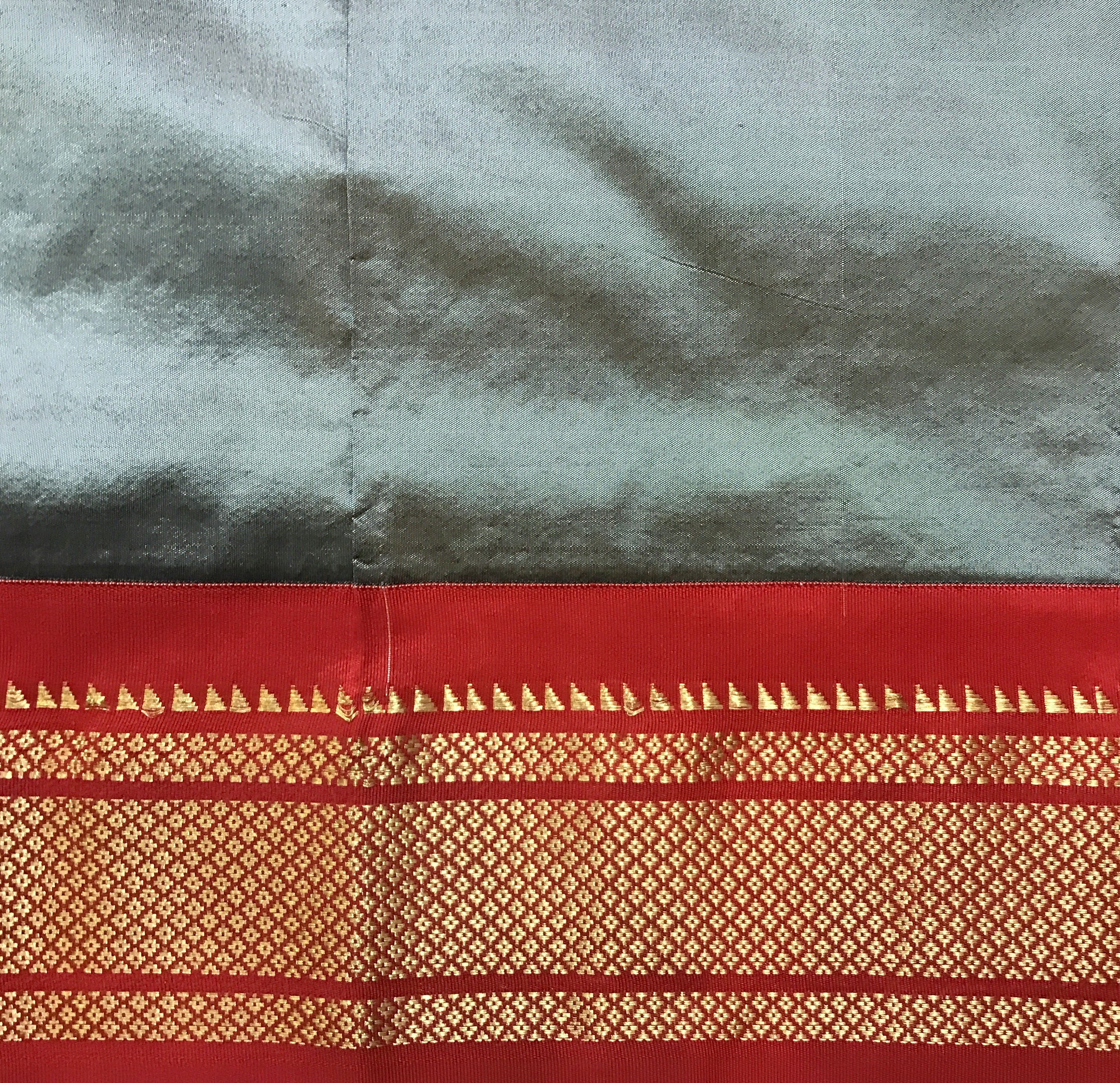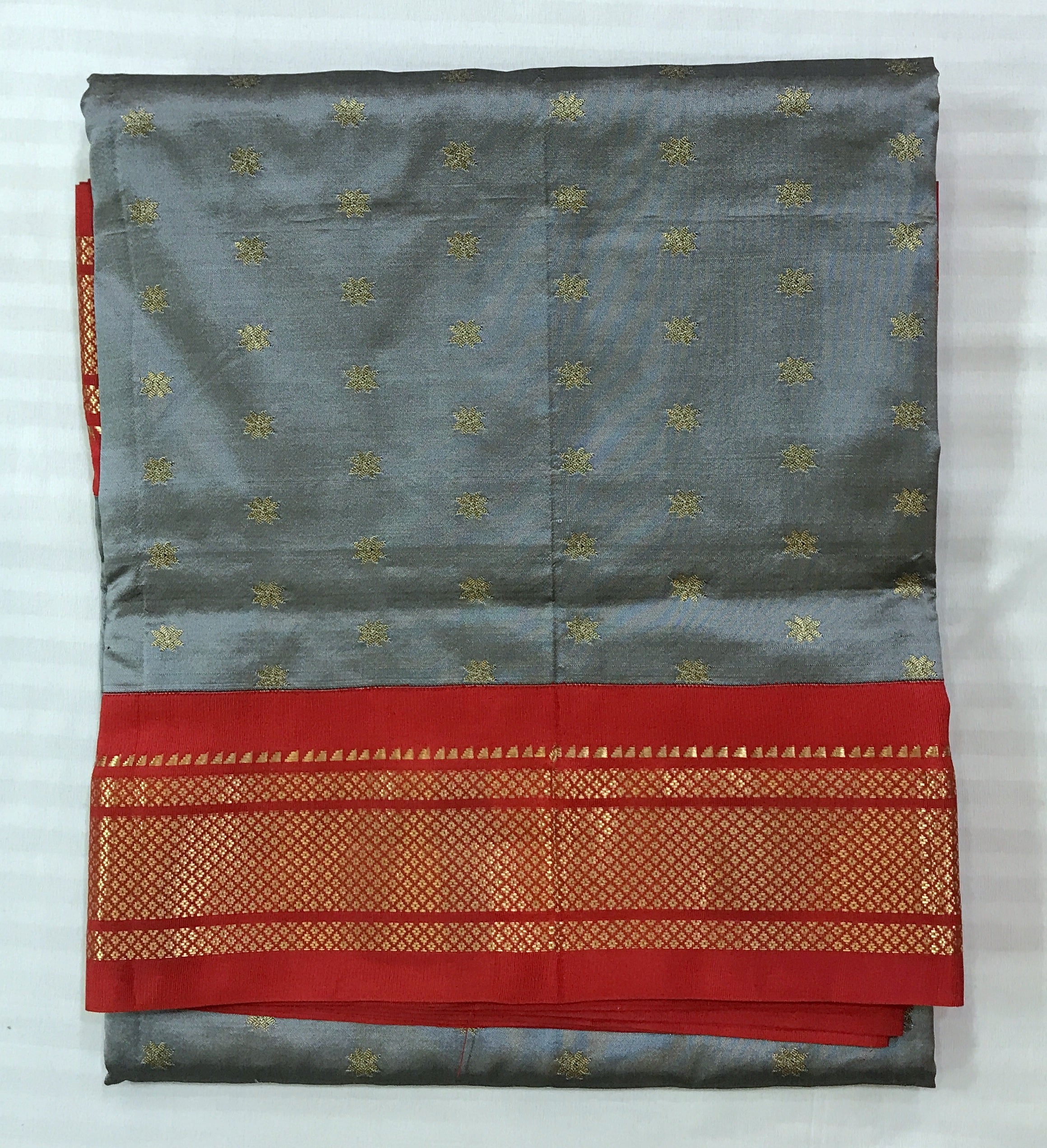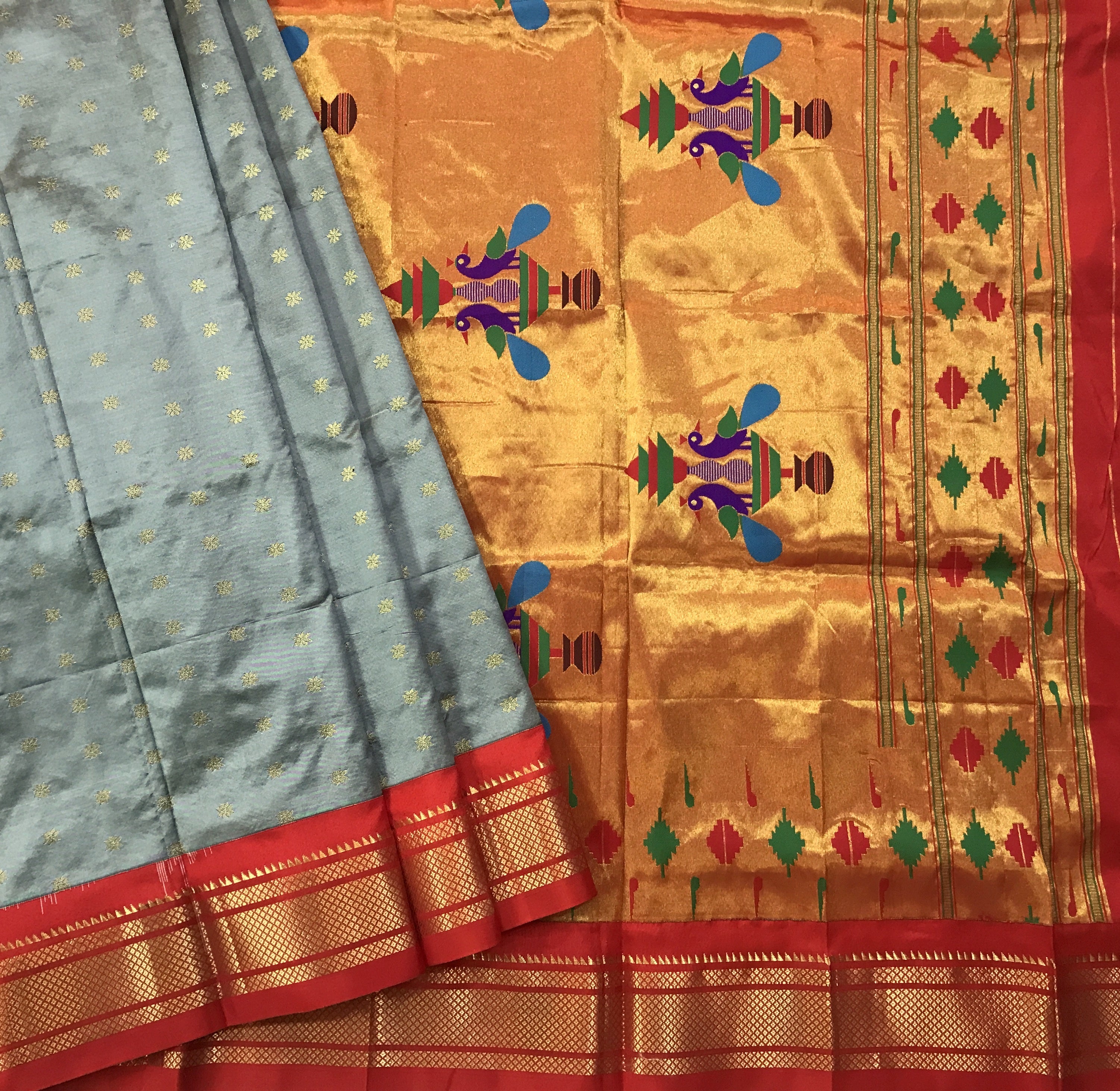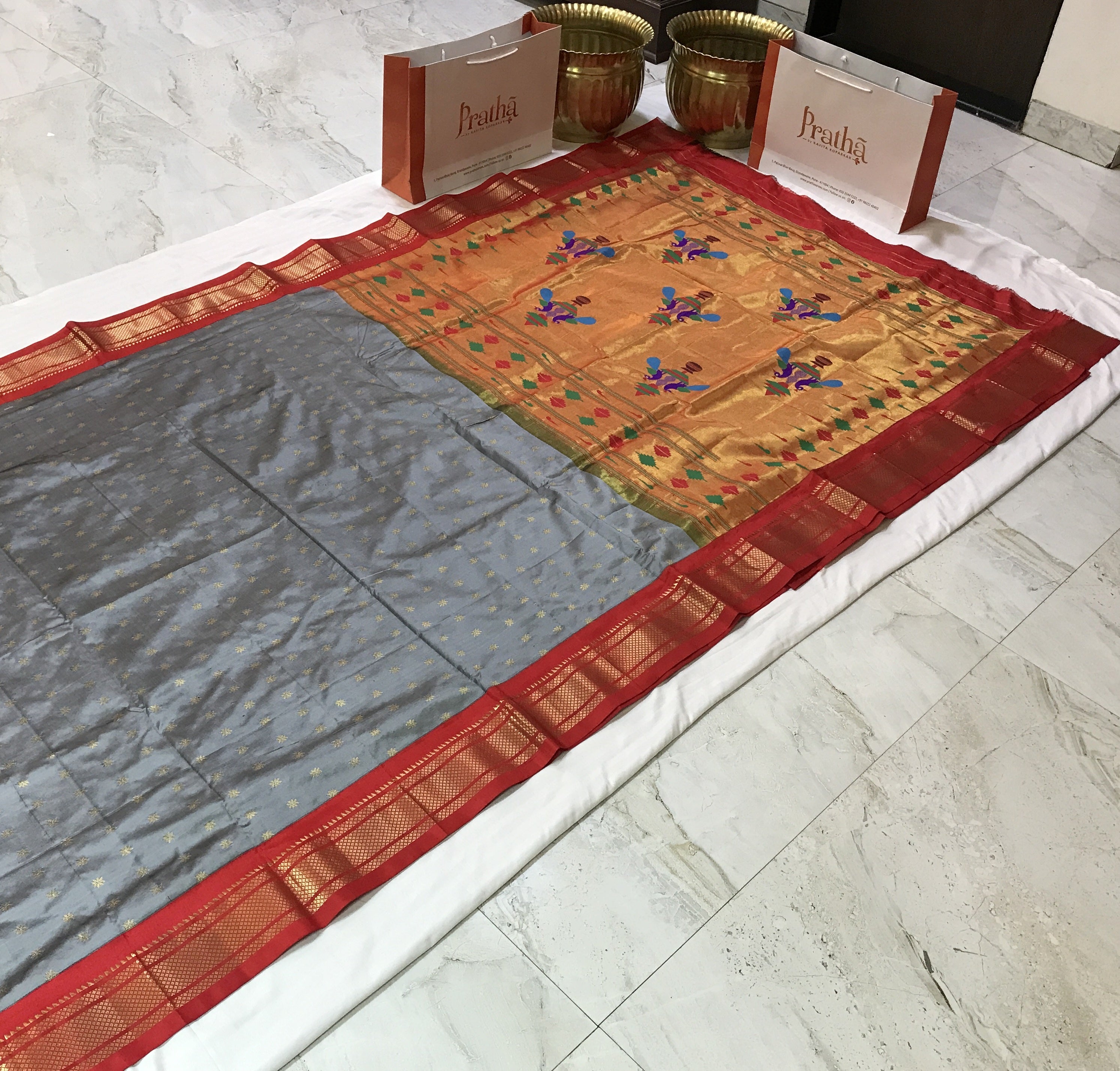 An epic combination of grey with a red coloured borderpower loom Paithani, is here. The intricately detailed floral butti(motifs) are spread all the saree in golden zari thread looks great. Glance at the beautiful multicolored peacocks motifs zari pallu widely scattered over the golden border.