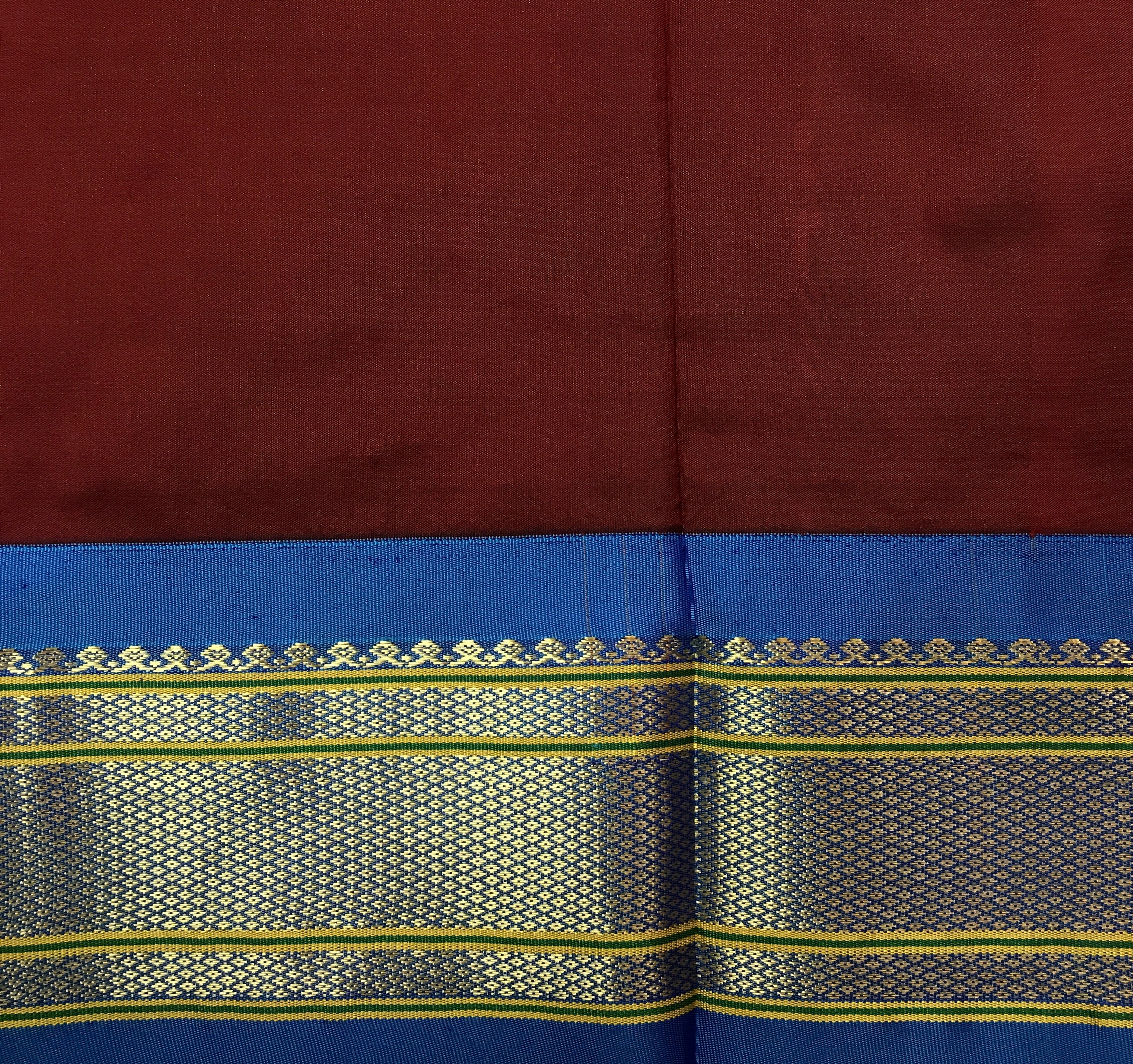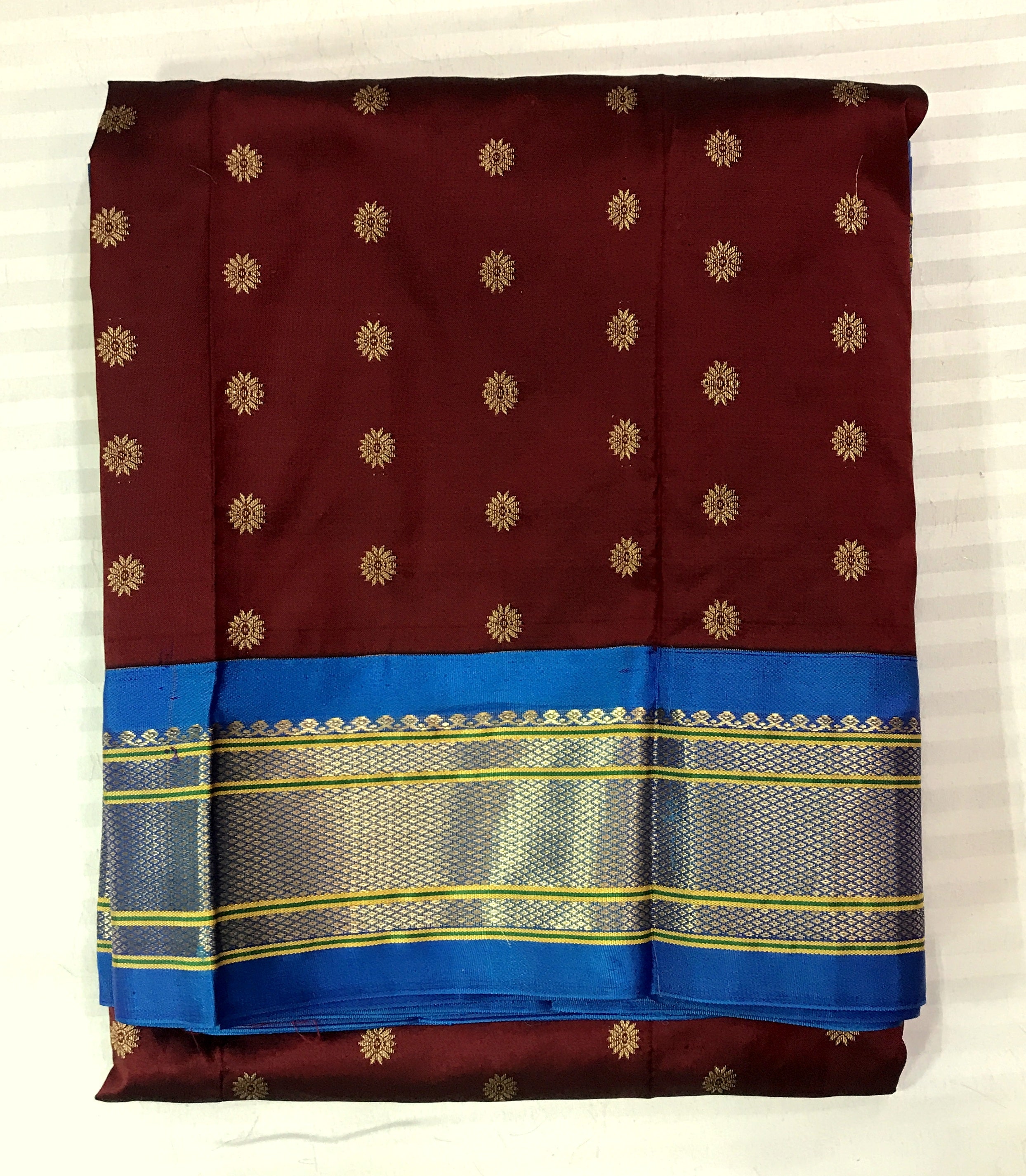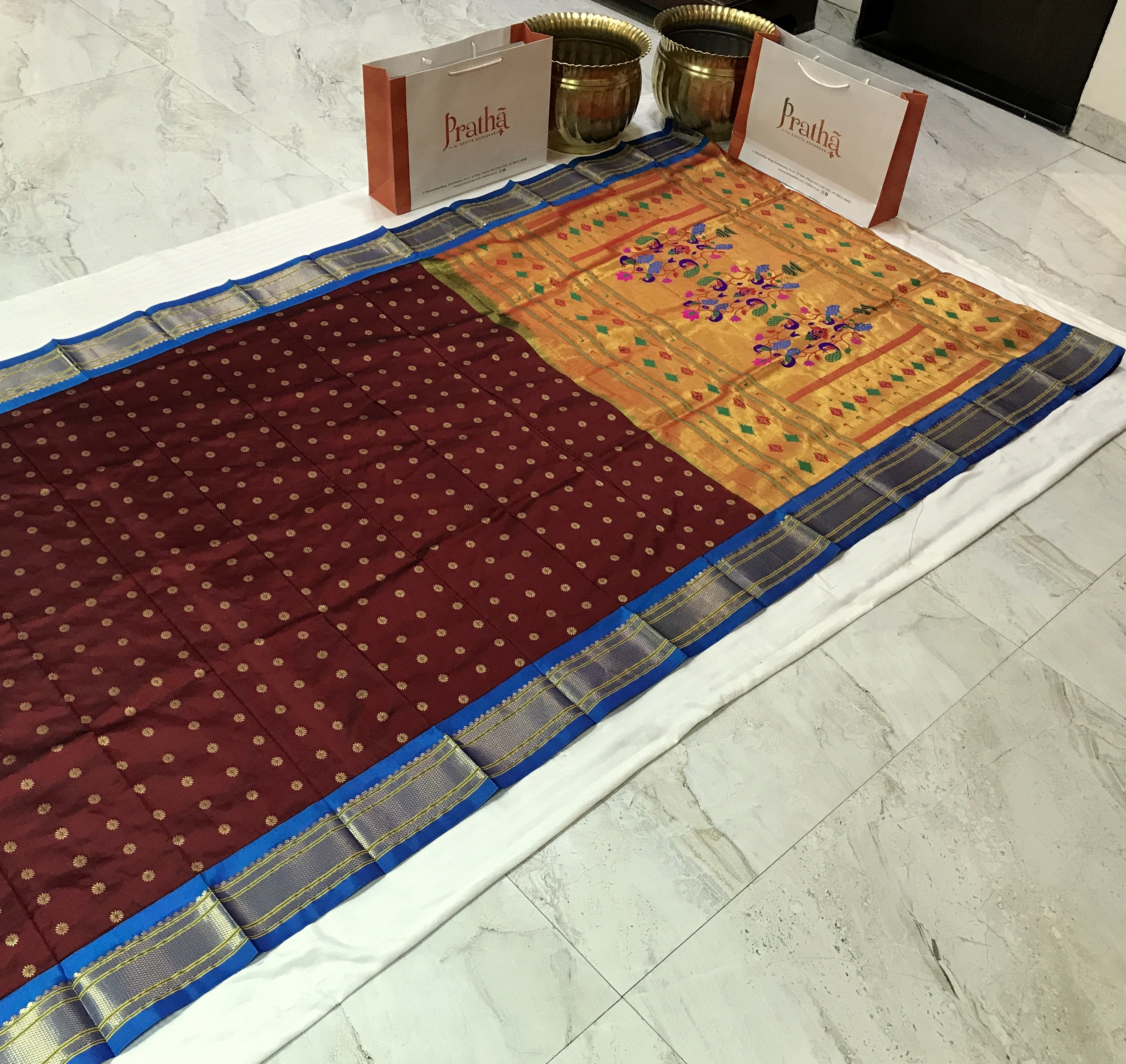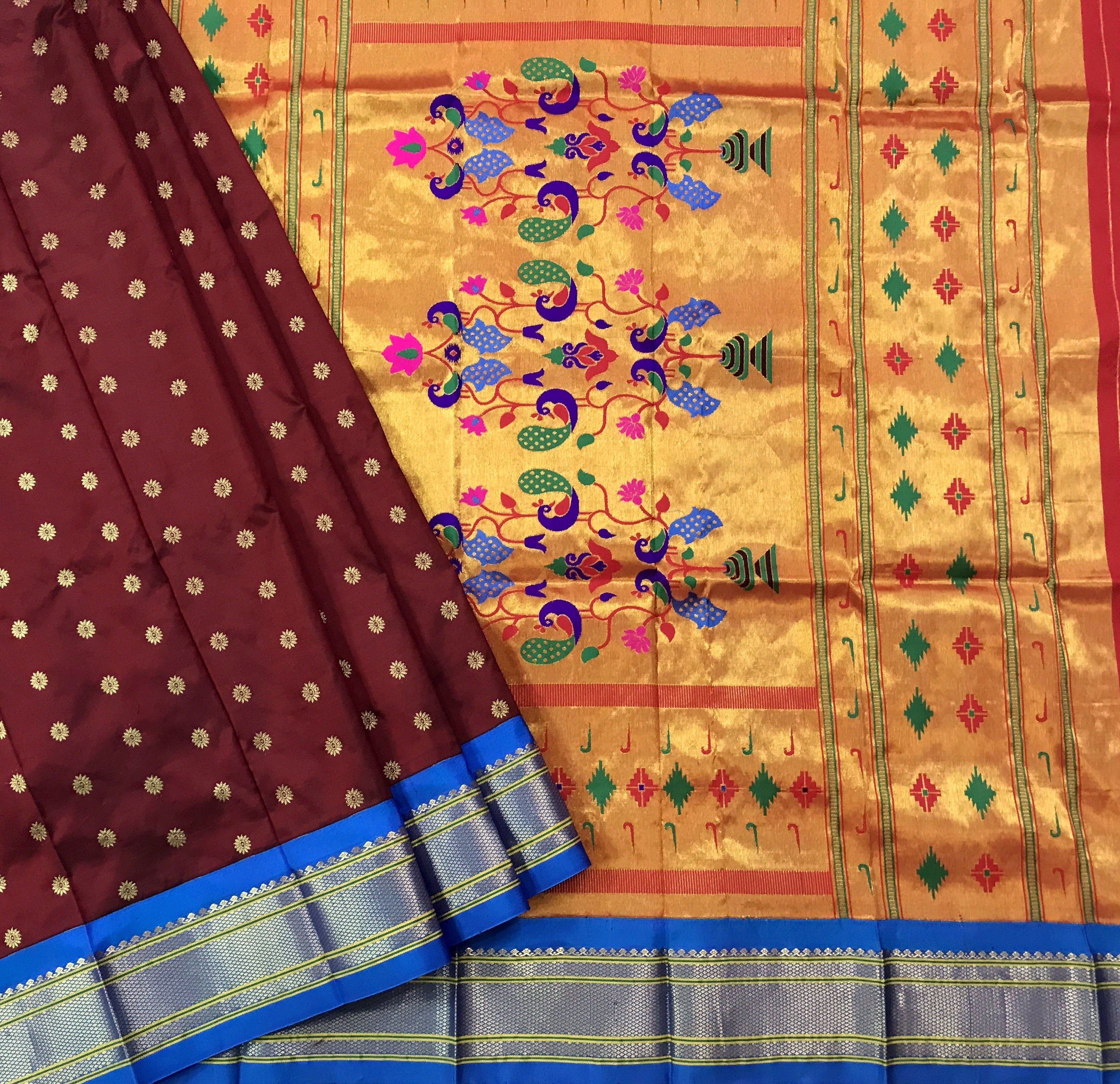 An ethereal shade of maroon, this one is a unique blend of royal and red creating a rich shade of a 'deep red'. Not too dark, not too bright: This stunning power loom Paithani with blue coloured golden zari border is just class apart! The finely spread floral butti and its traditional pallu just stand true to its roots!
