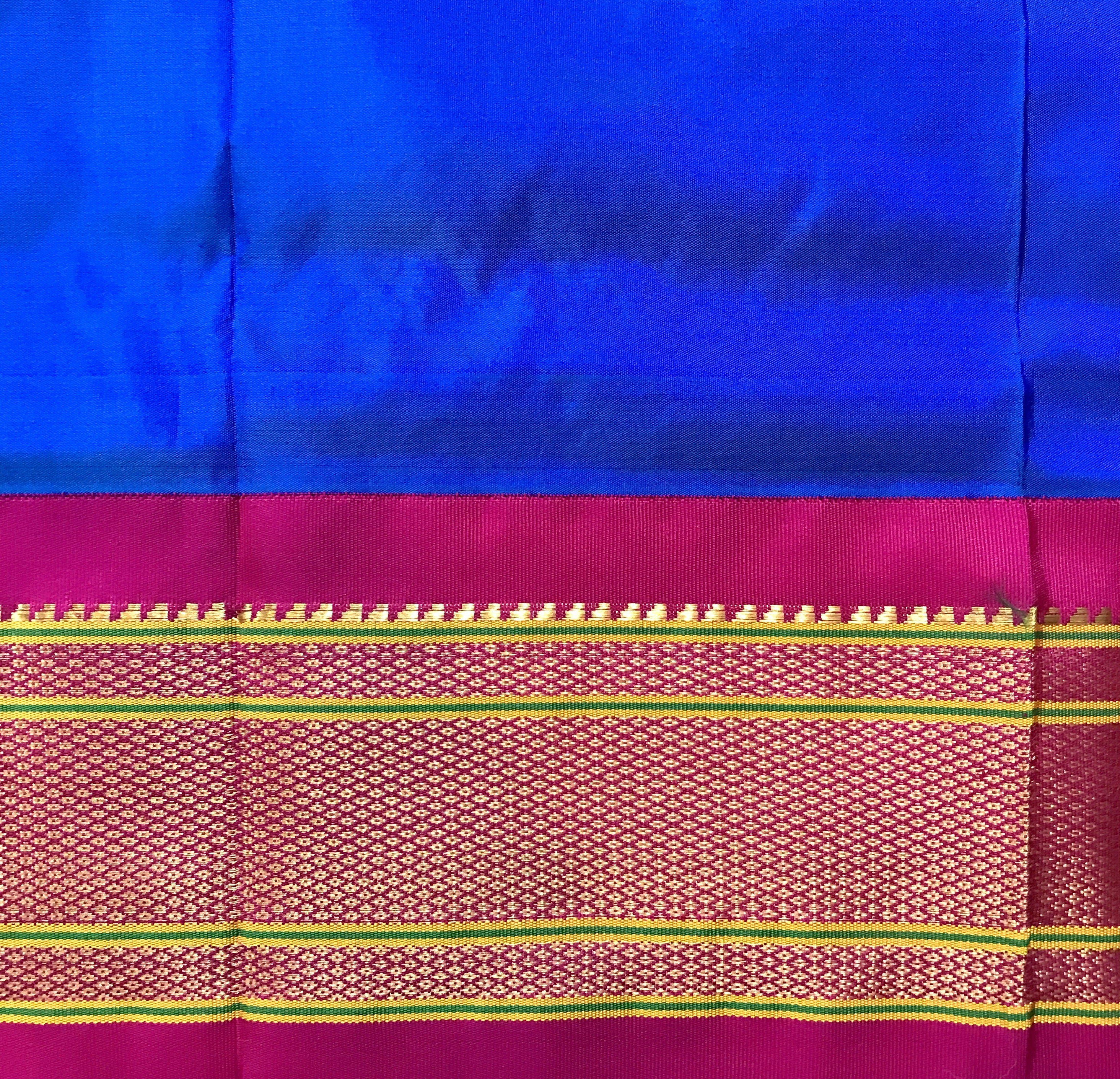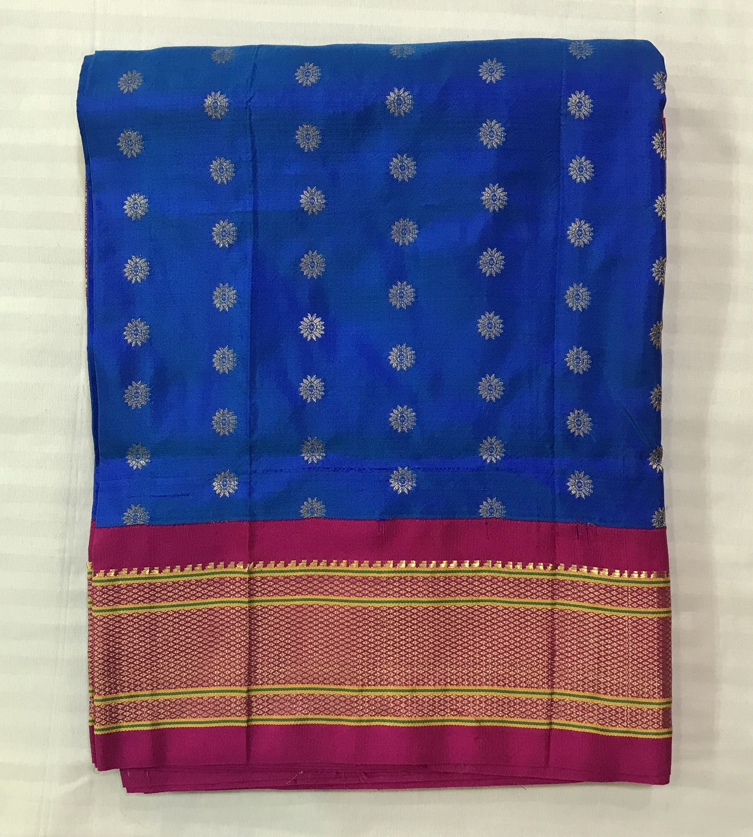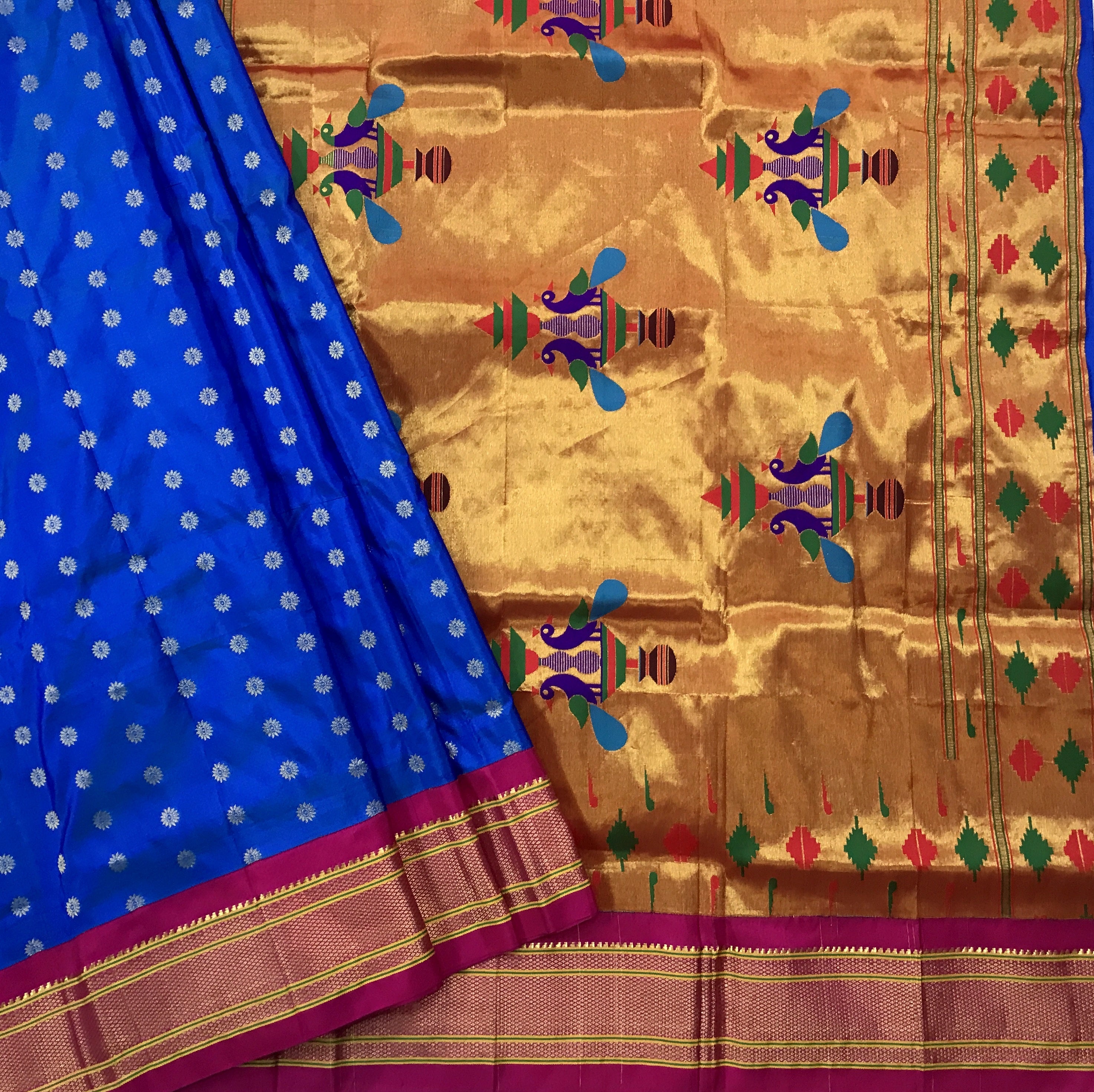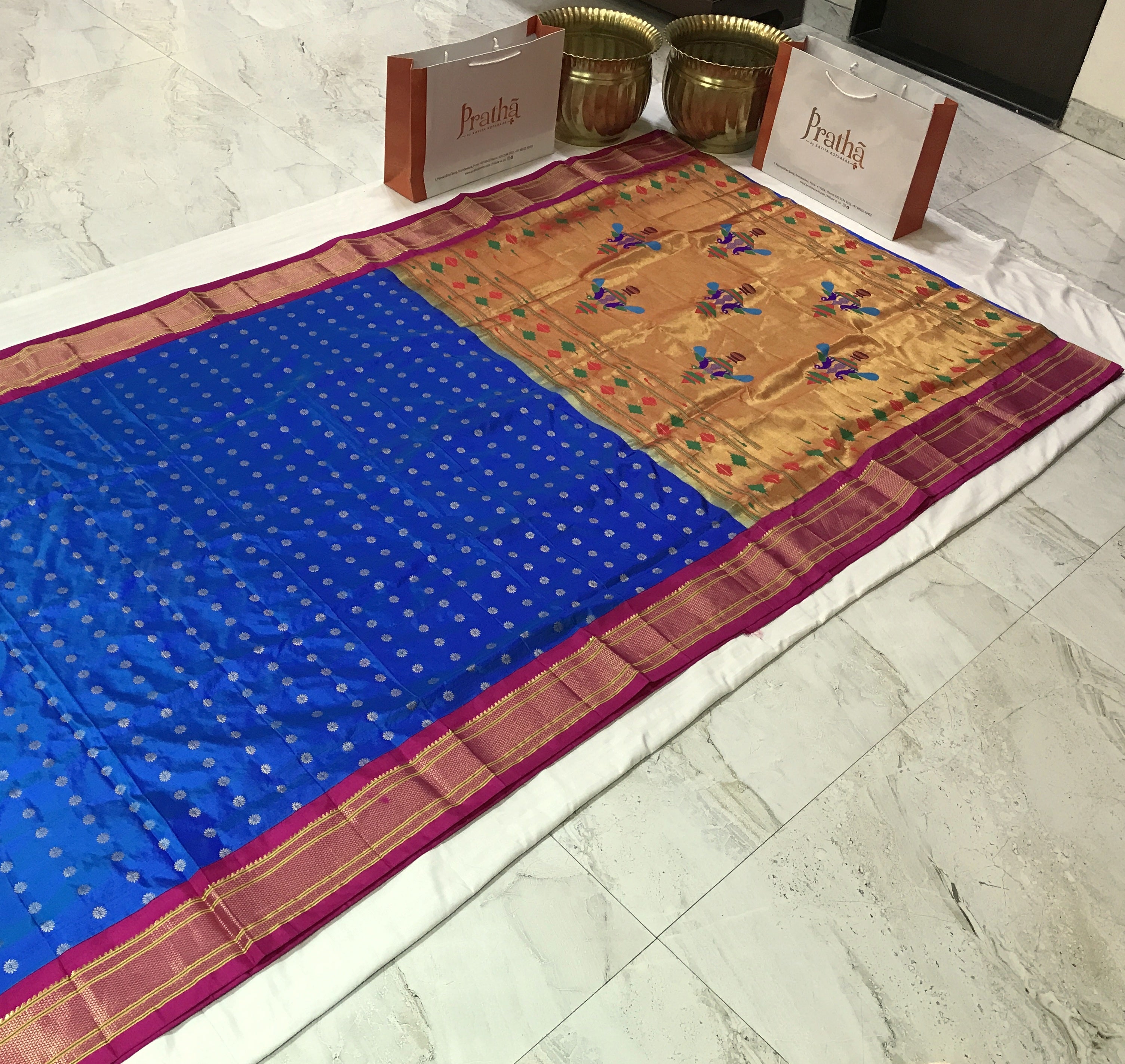 This bright shade of peacock blue , in excellent pure silk saree with the most amazing pink coloured golden zari border is a classy combination for power loom Paithani. This stunning Paithani flaunts beautiful floral butti ( motifs) of zari and beautiful golden zari pallu with peacock motifs add grace to this festive saree. Pratha happily presents these in beautiful colours.