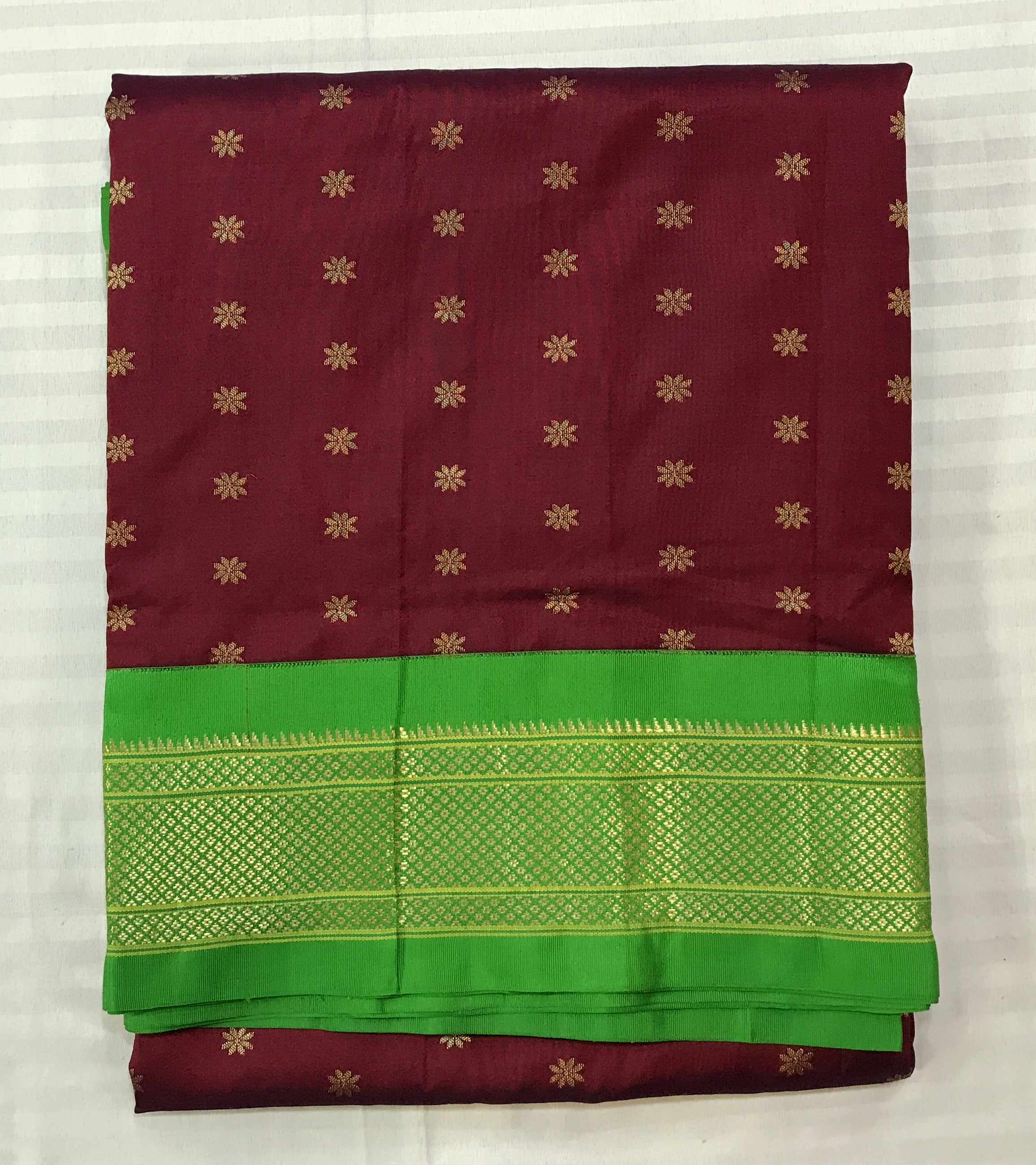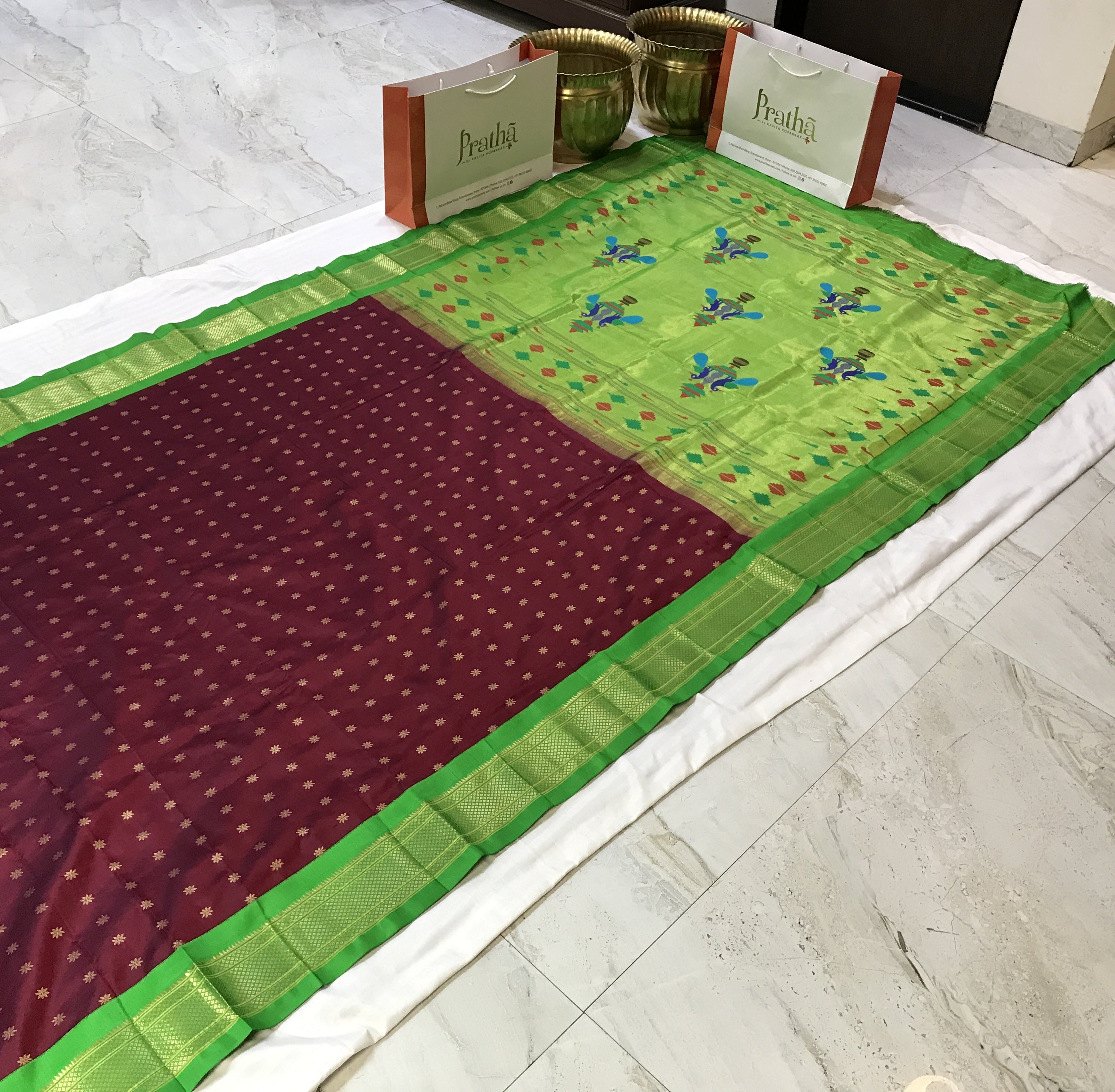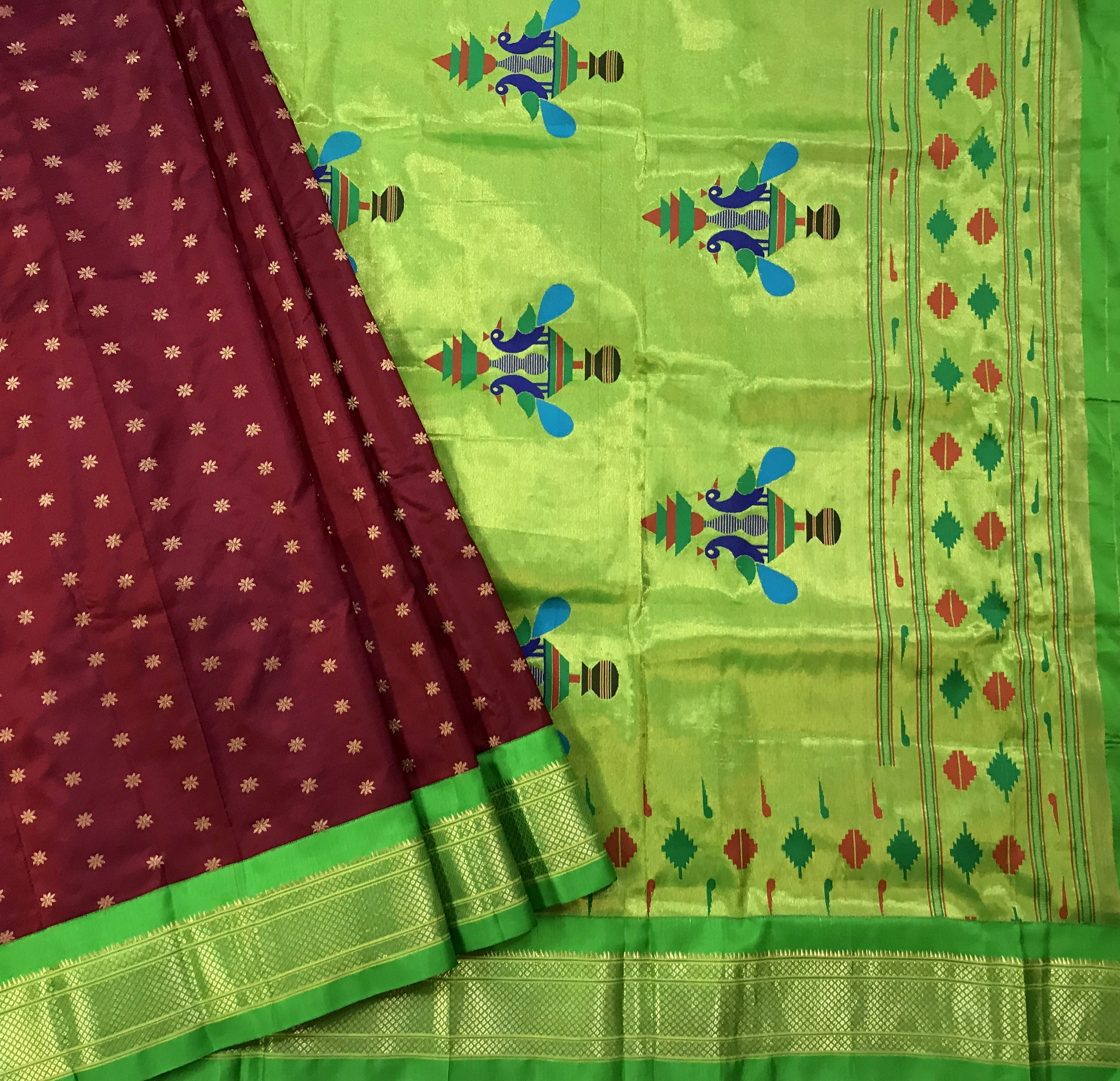 An ethereal shade of maroon, this one is a unique blend of royal and red creating a rich shade of a 'deep red'. Not too dark, not too bright: This stunning power loom Paithani with green coloured golden zari border is just class apart! The finely spread floral butti and its traditional pallu just stand true to its roots!