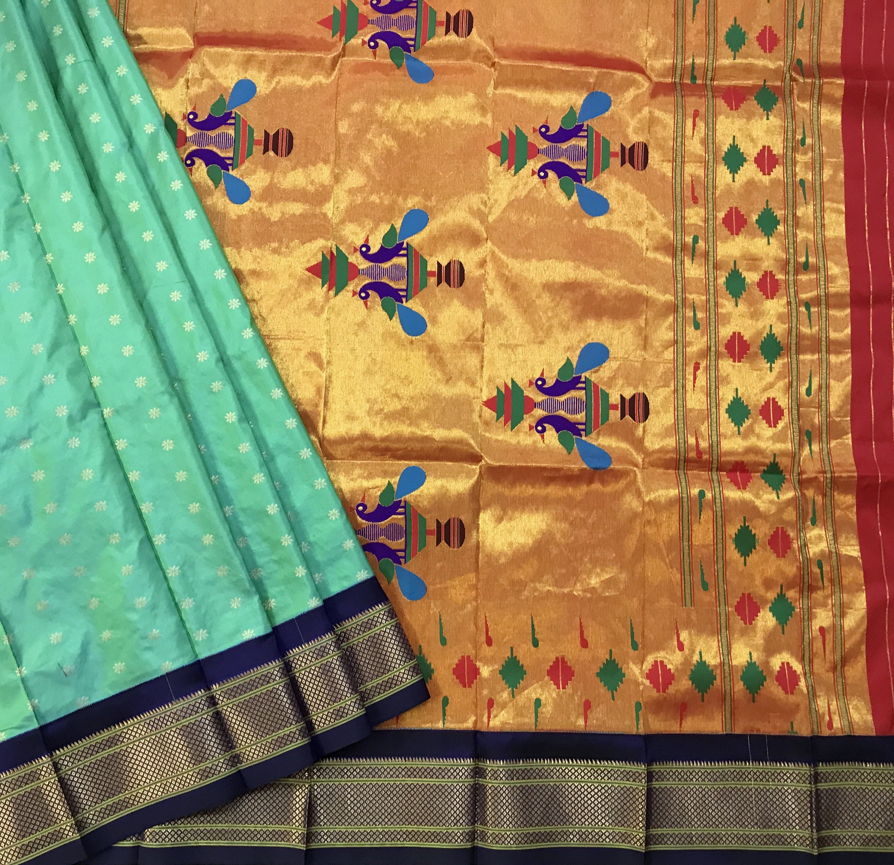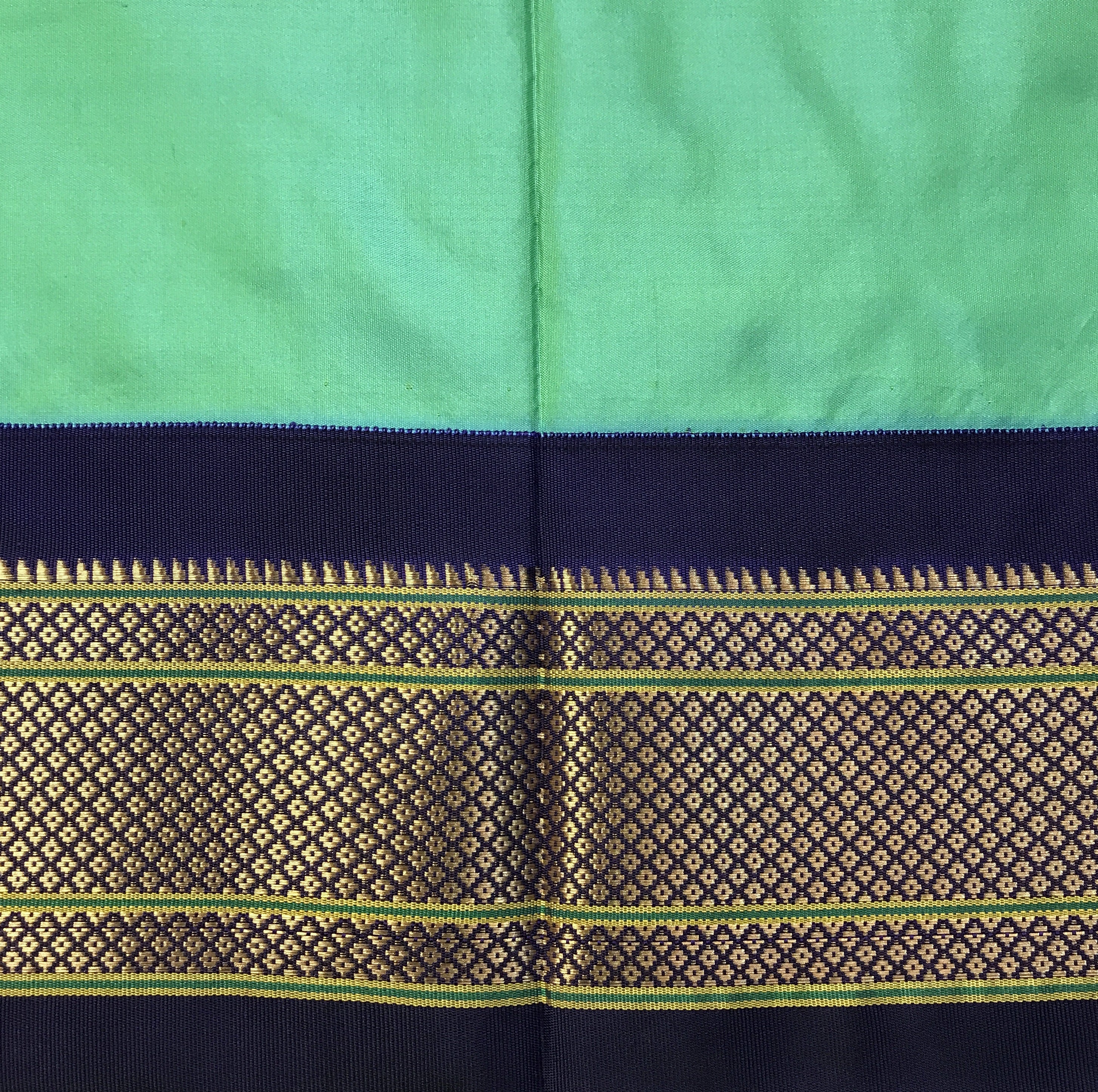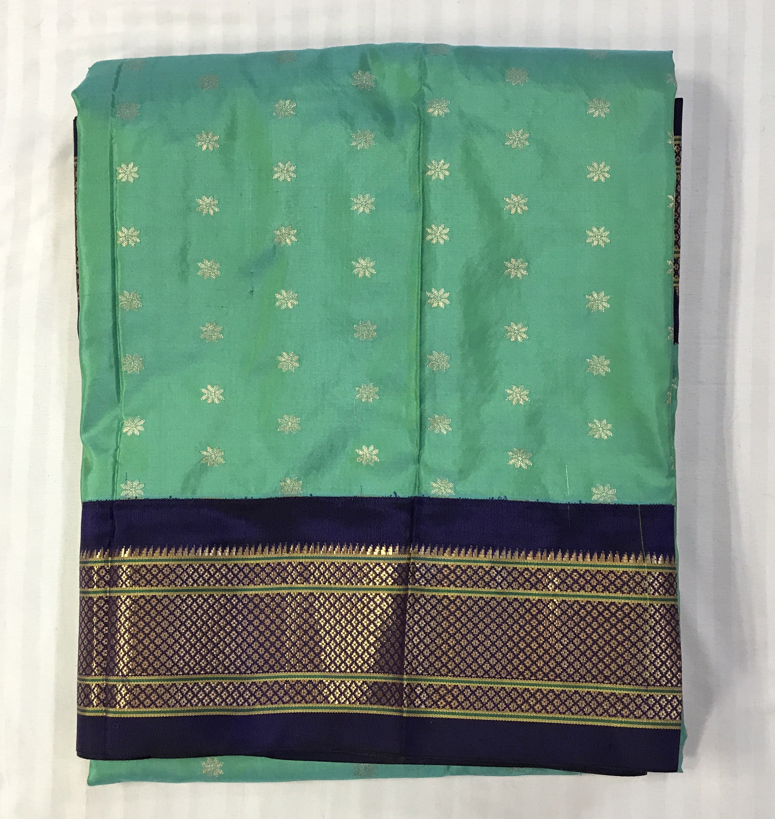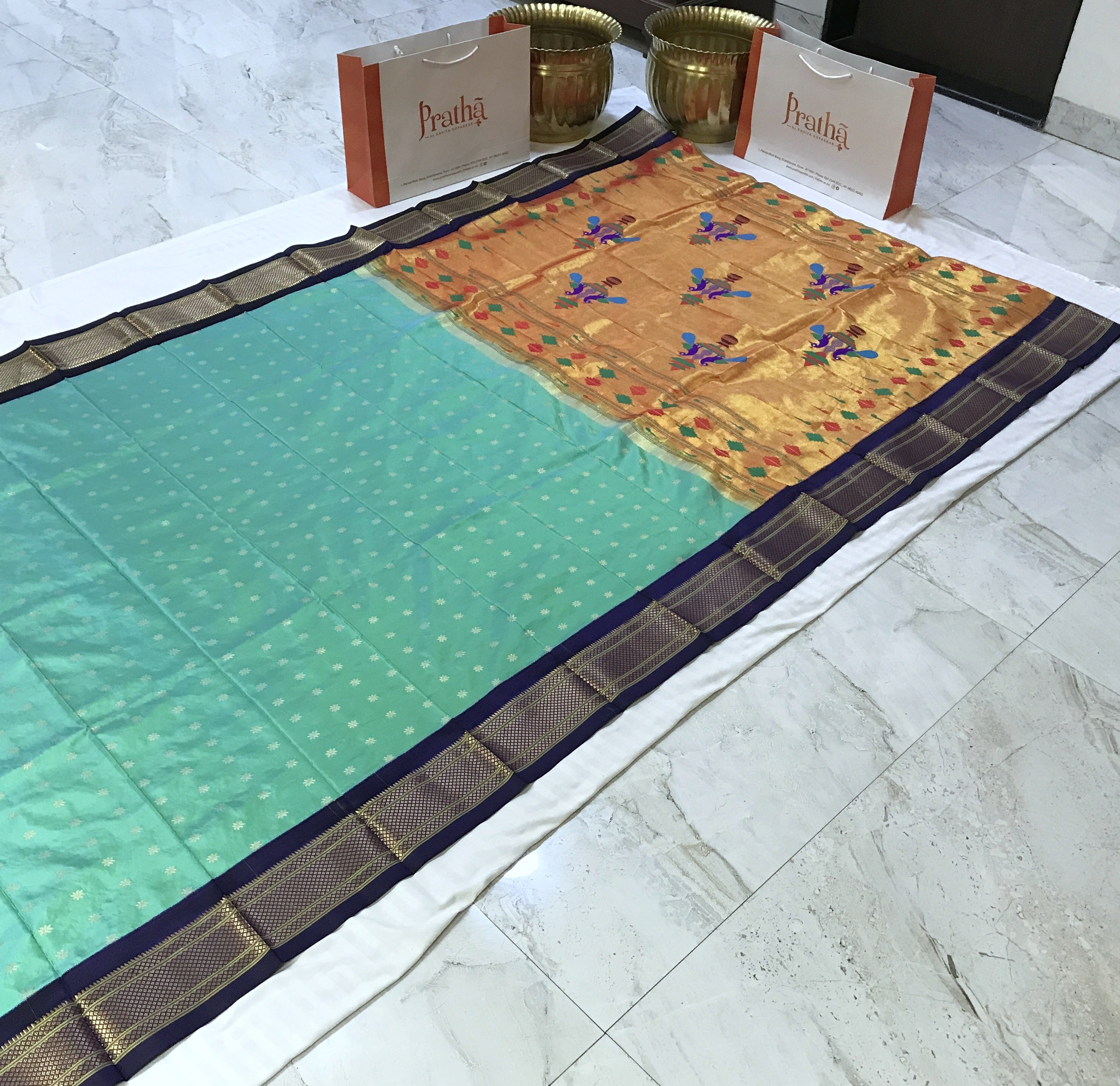 A unique yet fresh shade of golden-green, this pure silk power loom Paithani with a blue colored border is Pratha's favorite. This is a one of a kind colour combination among Parthians. Do not miss the delicate small butti highlighted in golden zari thread that add grace to this soothing weave!