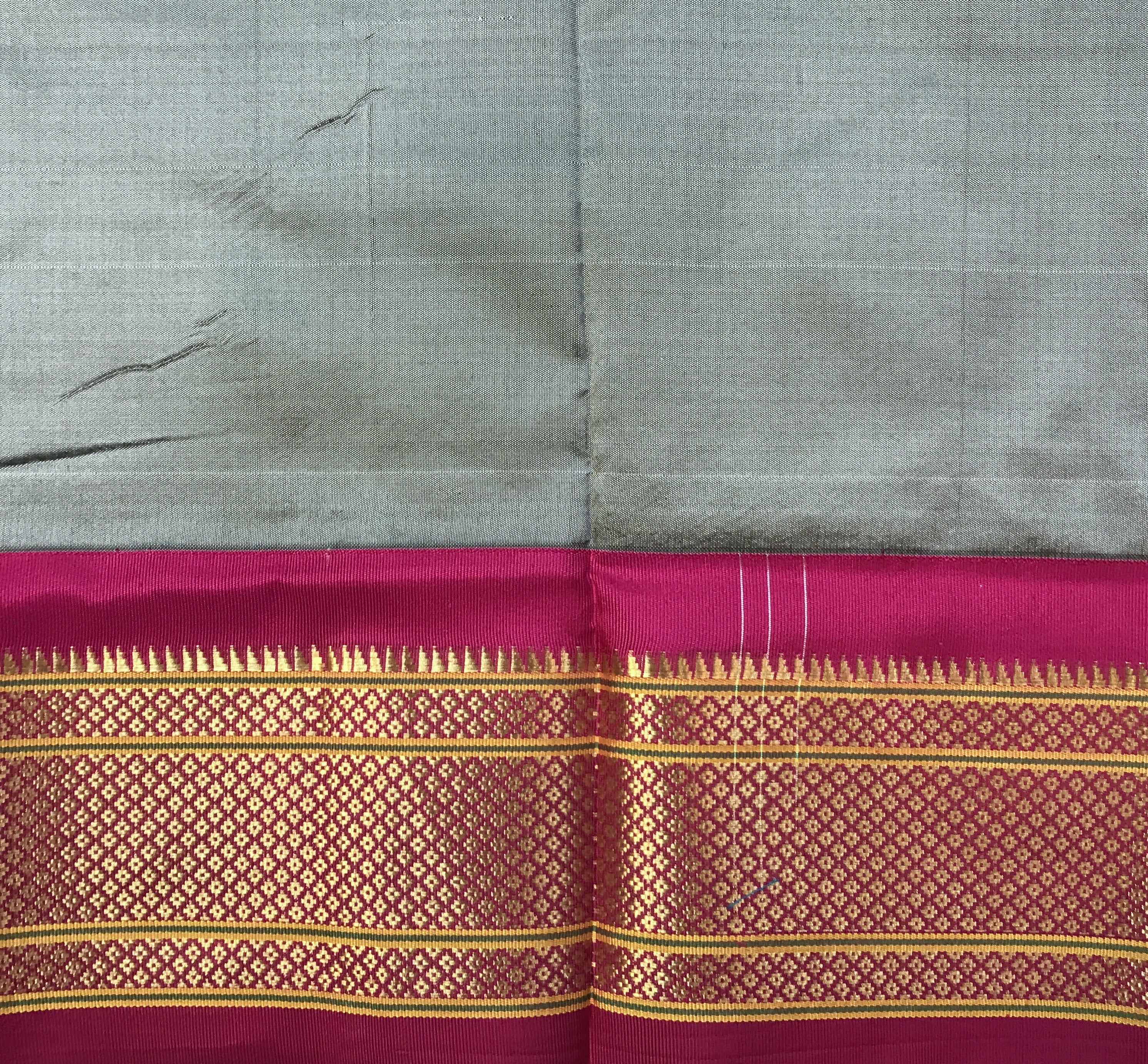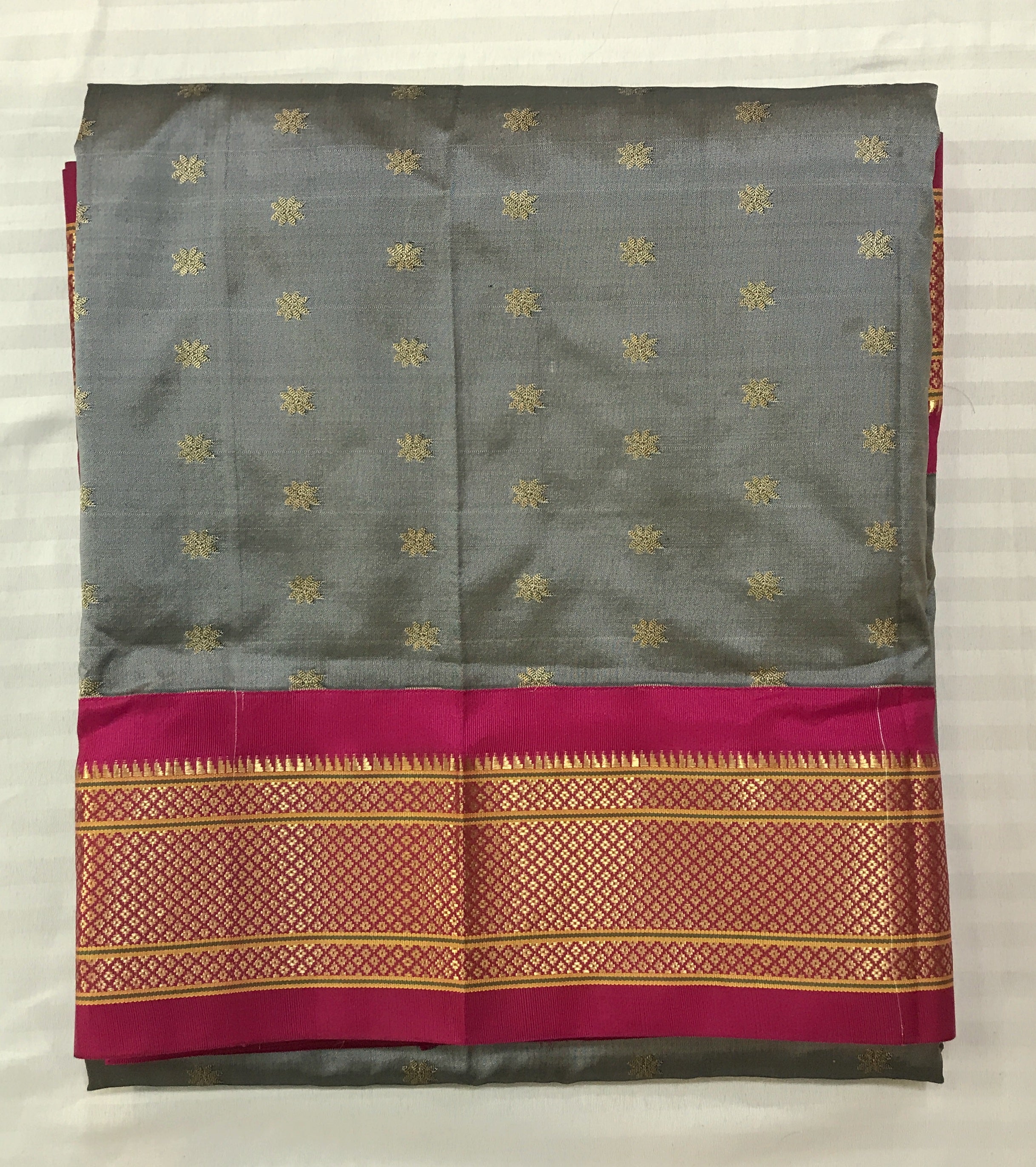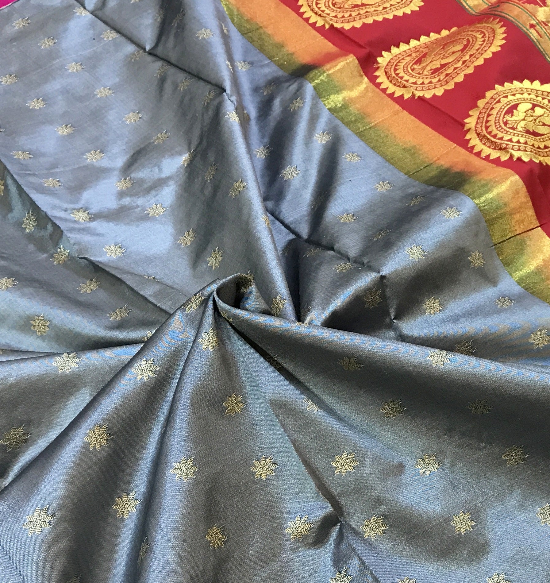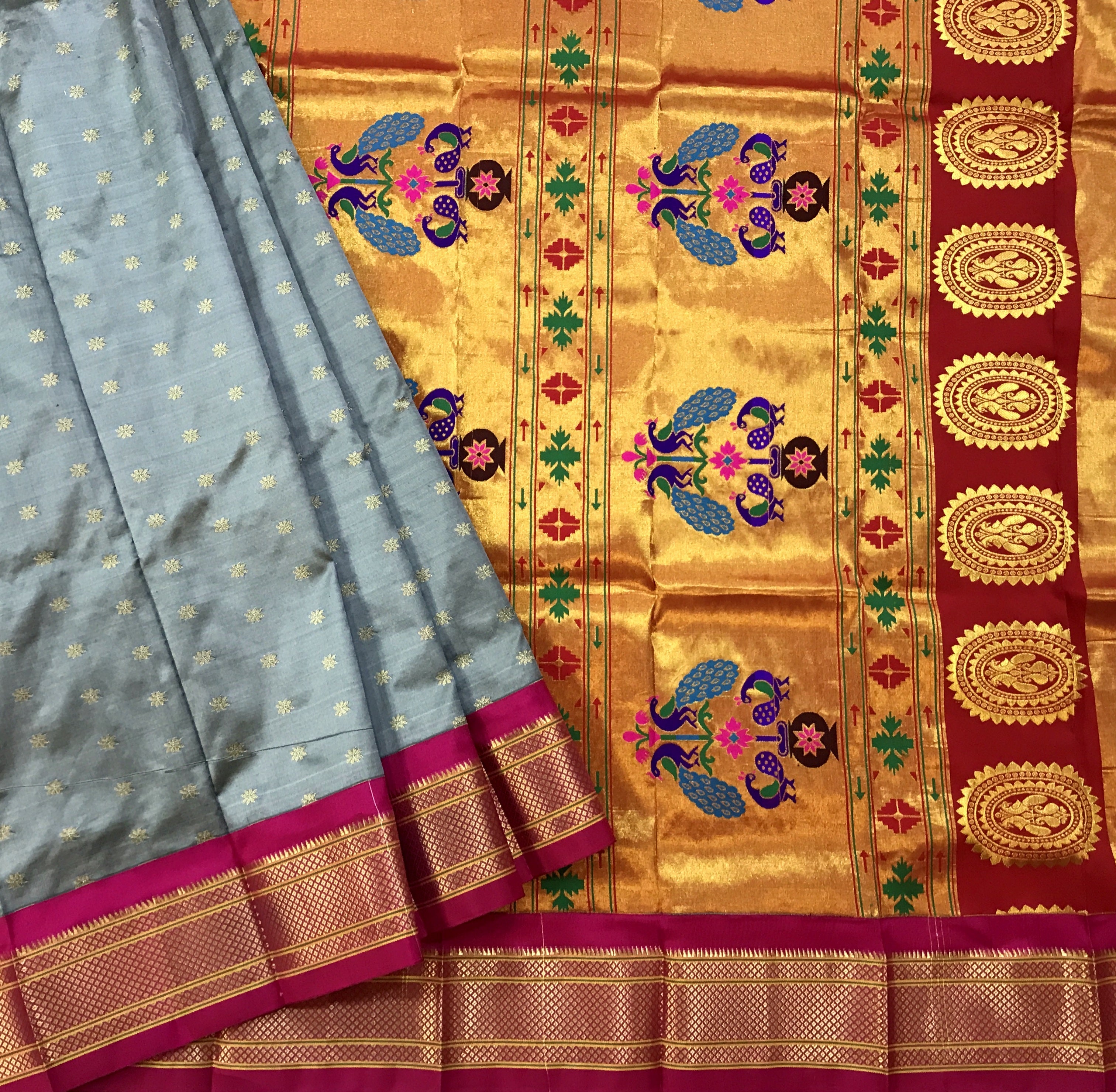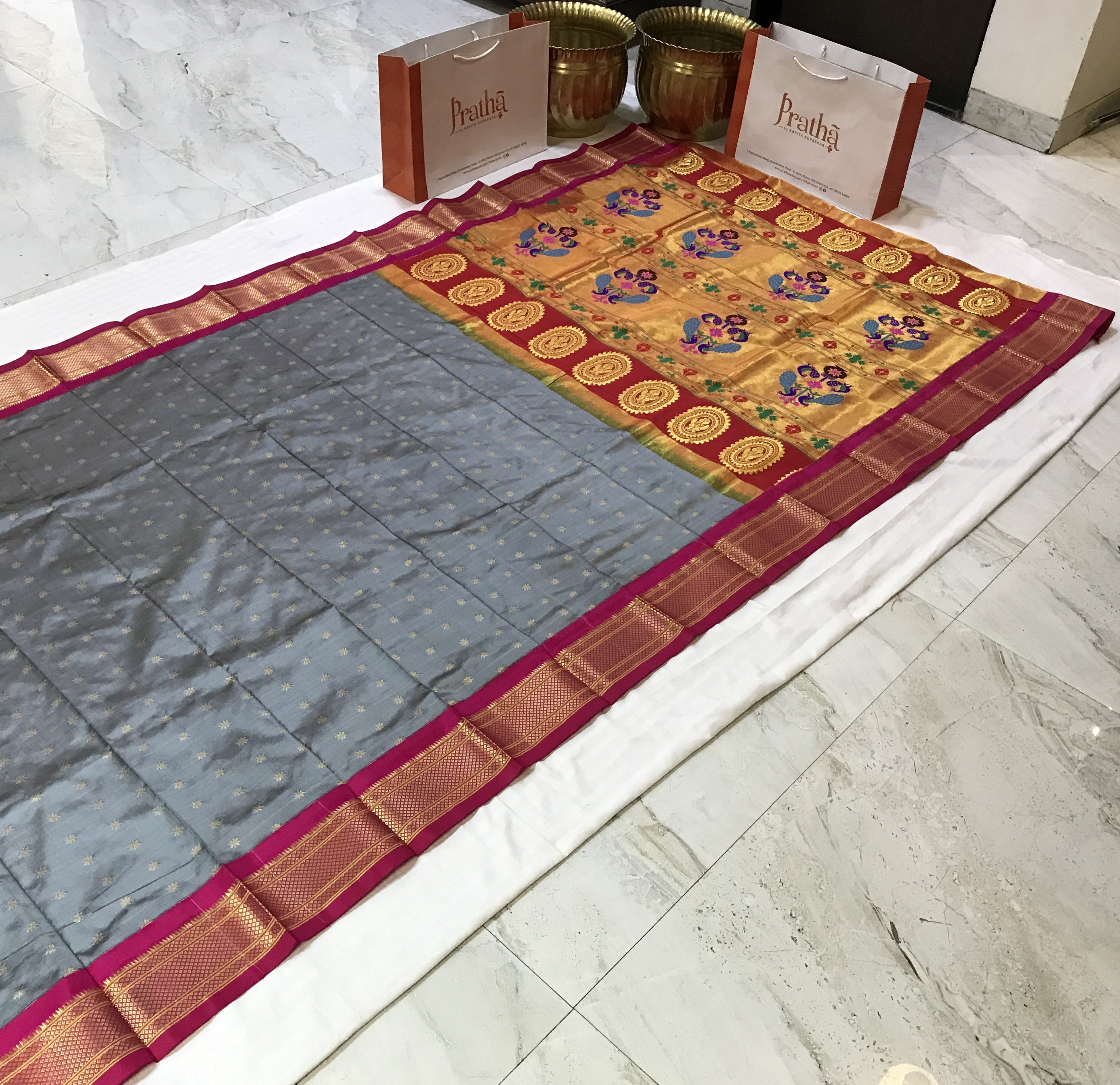An epic combination of grey with a pink coloured border power loom Paithani, is here. The intricately detailed floral butti(motifs) are spread all the saree in golden zari thread looks great. Glance at the beautiful multicolored peacocks motifs zari pallu widely scattered over the golden border.