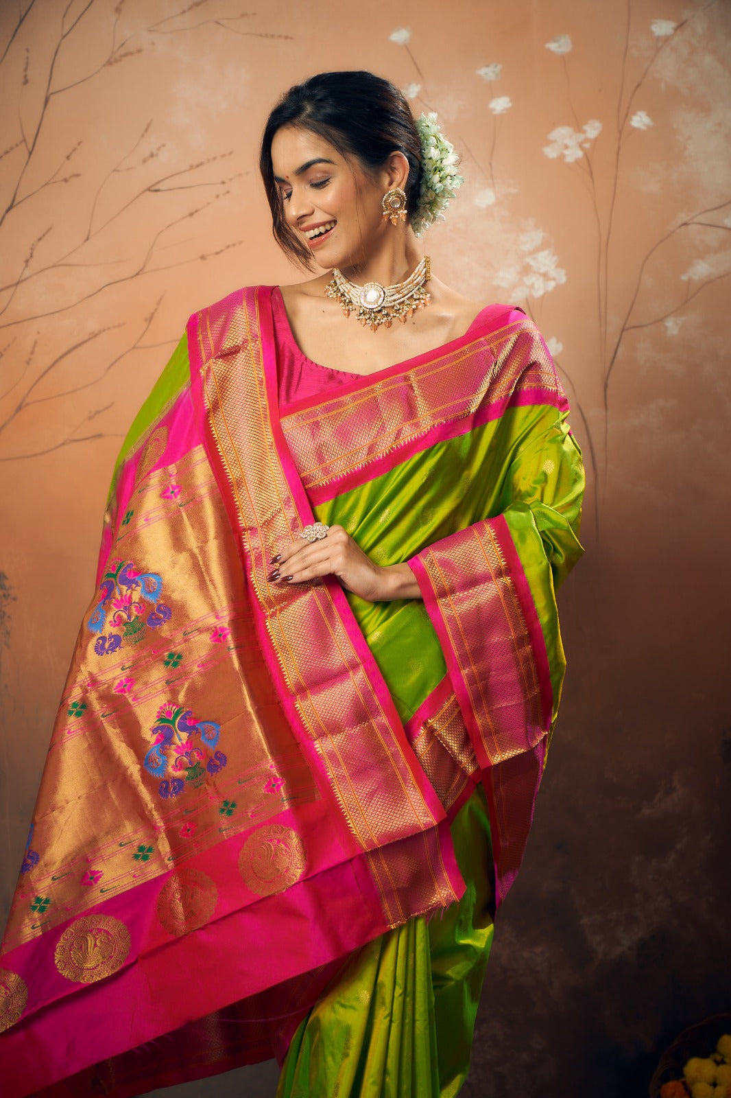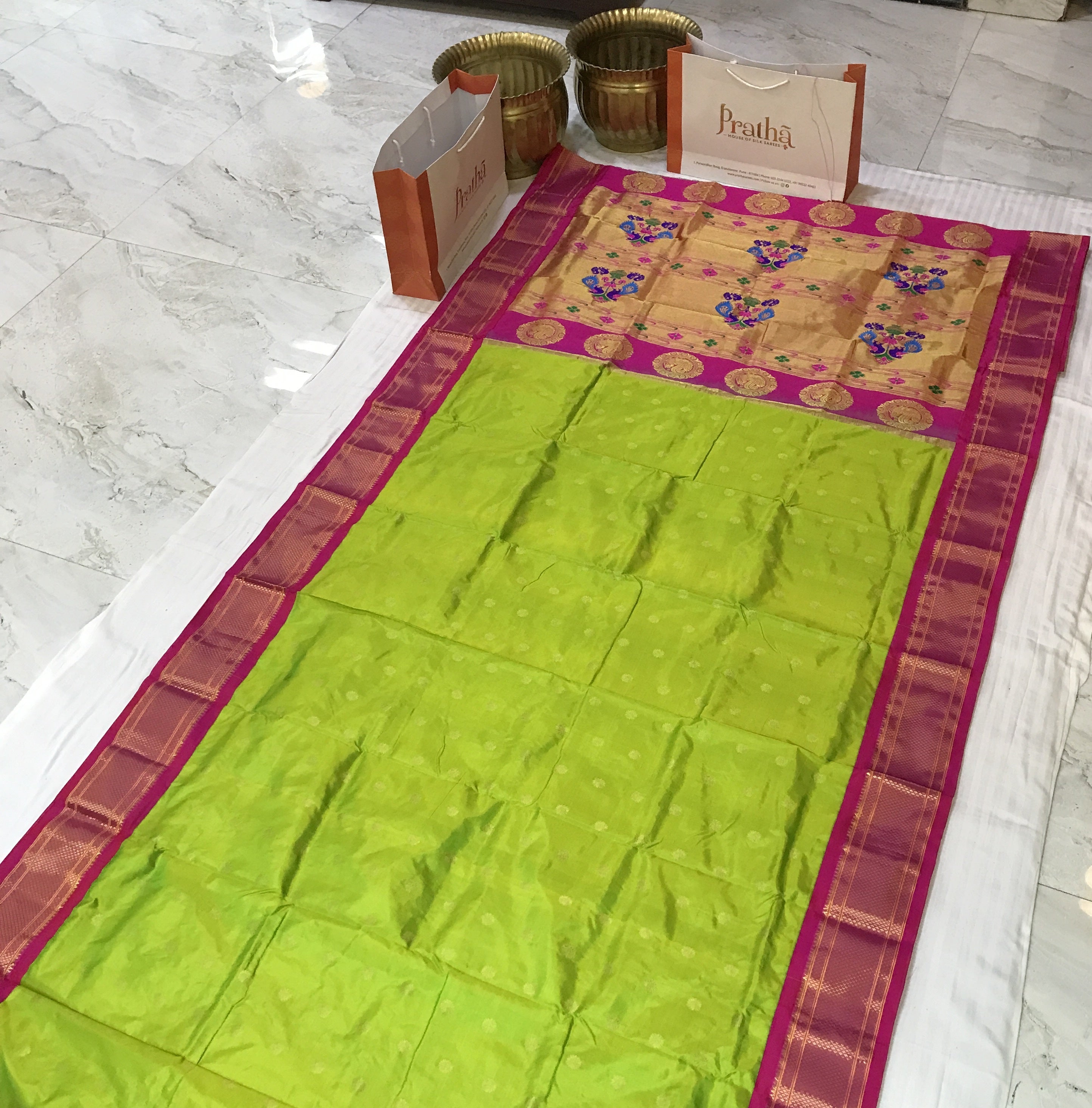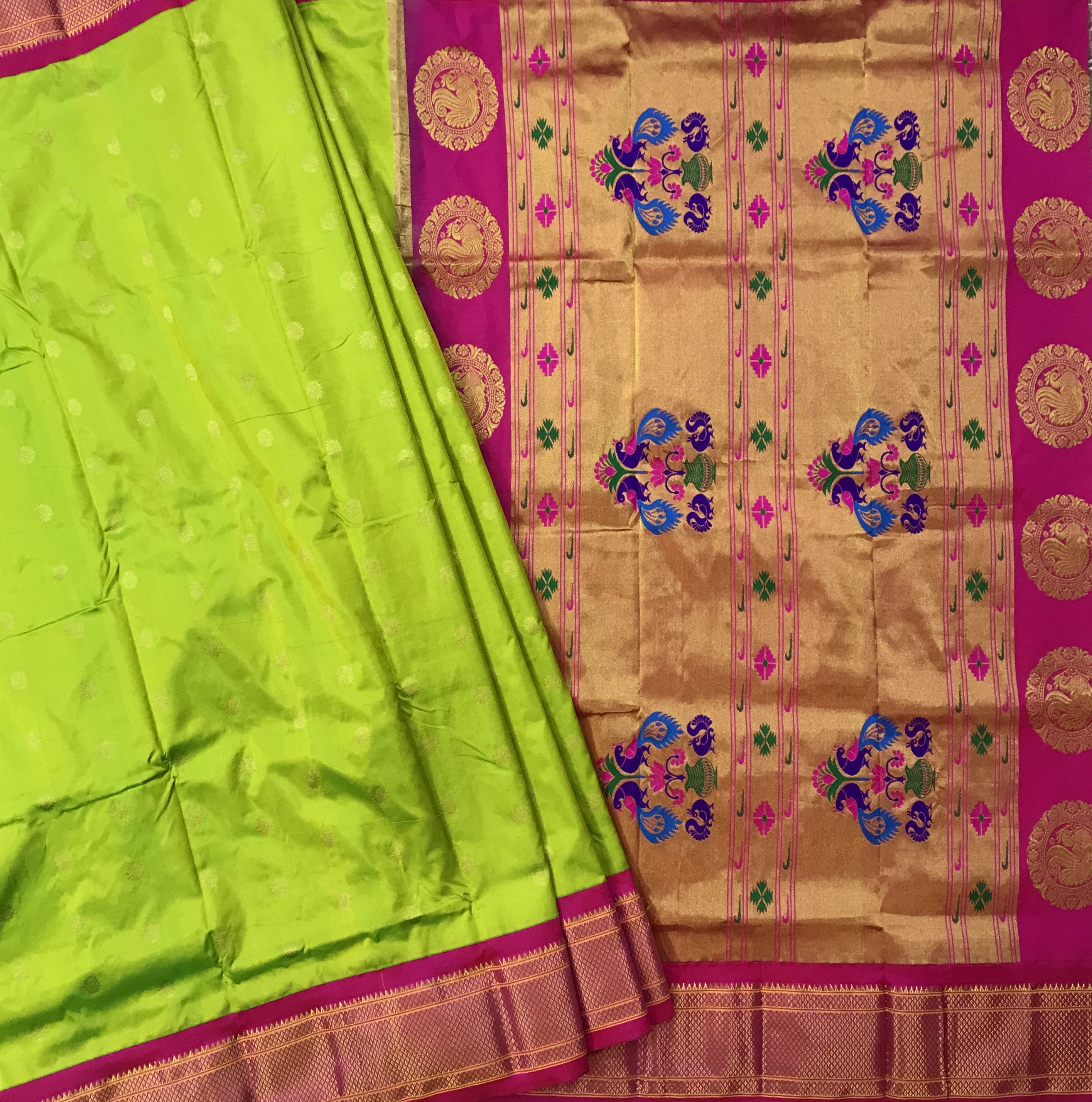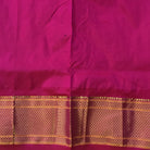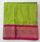 A classy parrot-green coloured power loom Paithani, with its added class by the intricate floral buttis(motifs), is a piece of grandeur. The contrast created with the pink border and an golden zari pallu looks ethereal. This saree works wonders for any occasion! Do not miss the peacock ( motifs ) design pallu highlighted in multicolored silk thread throughout this Paithani.